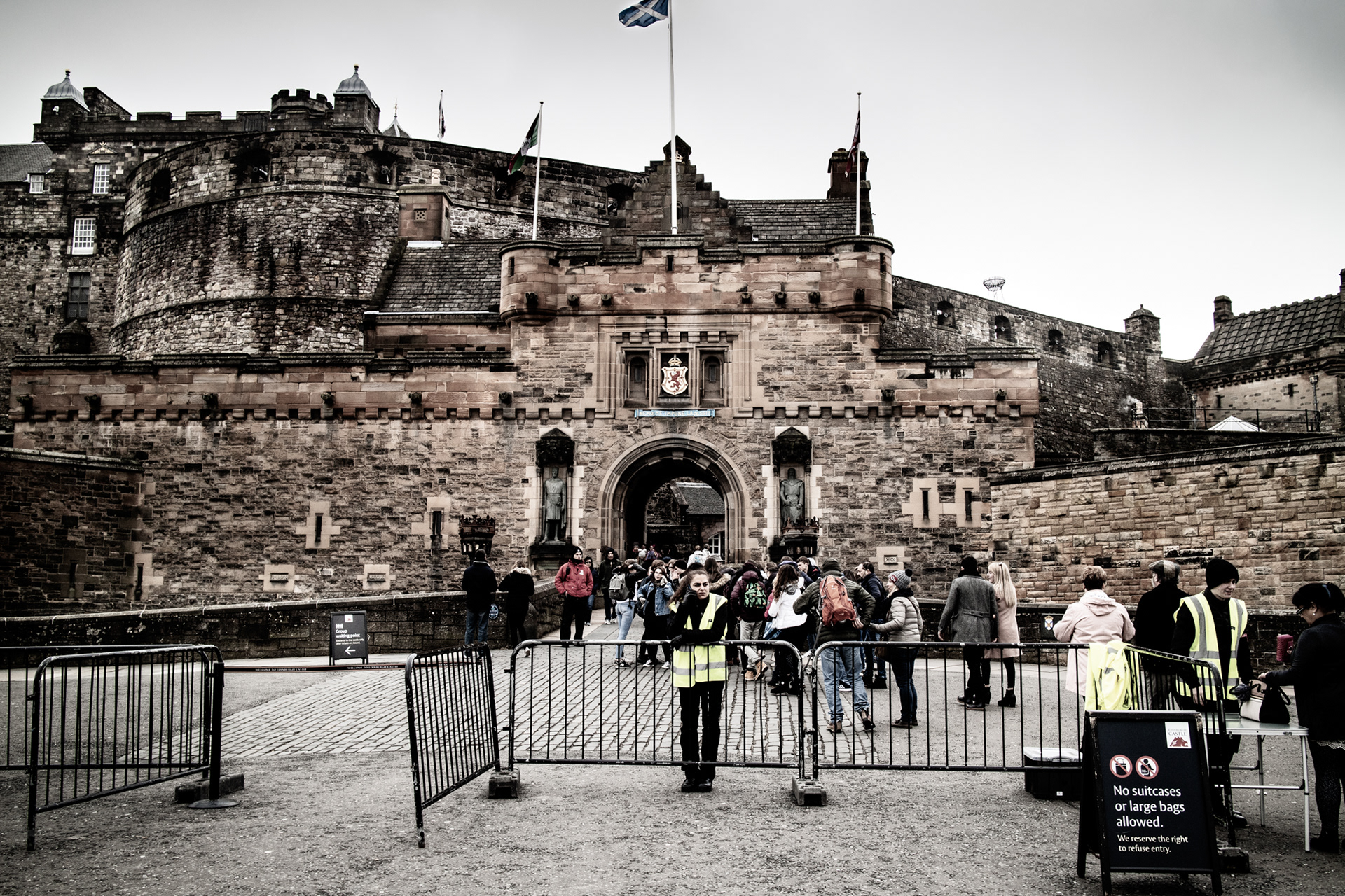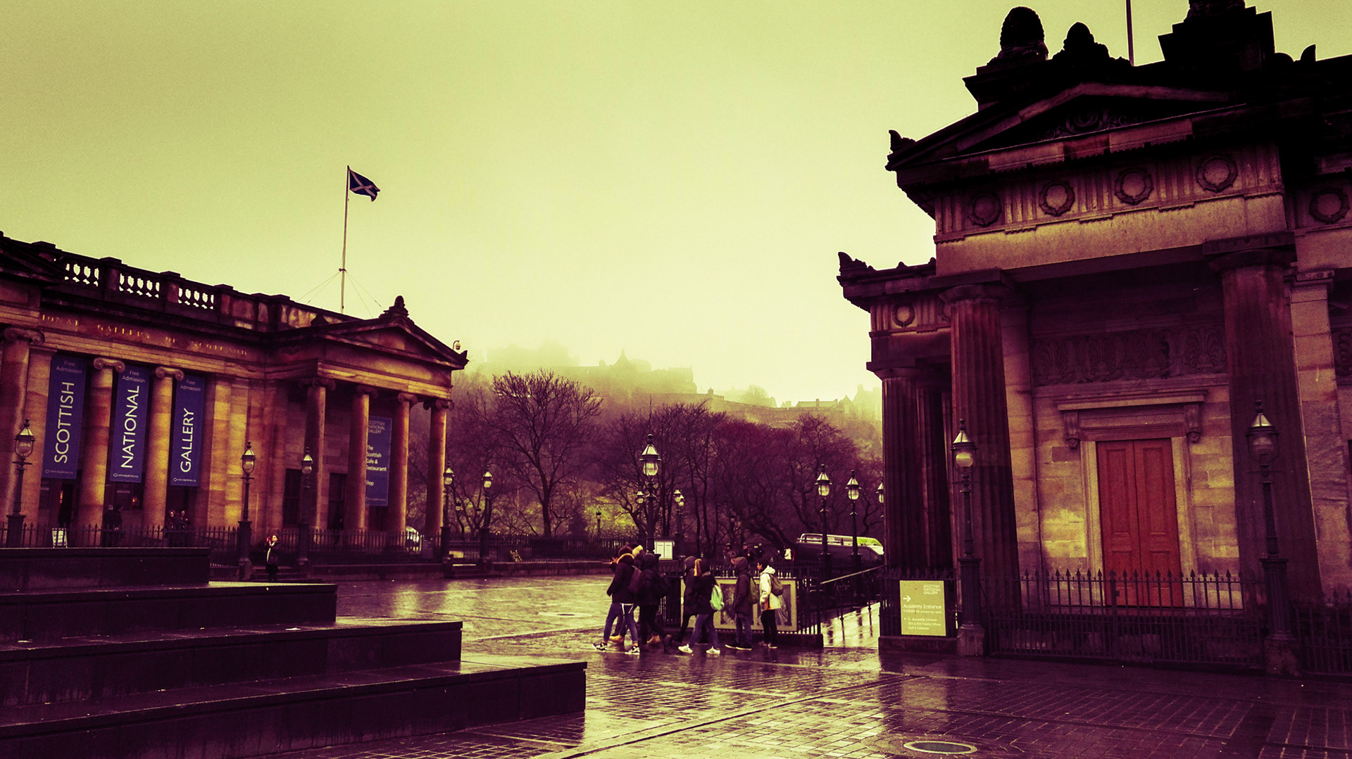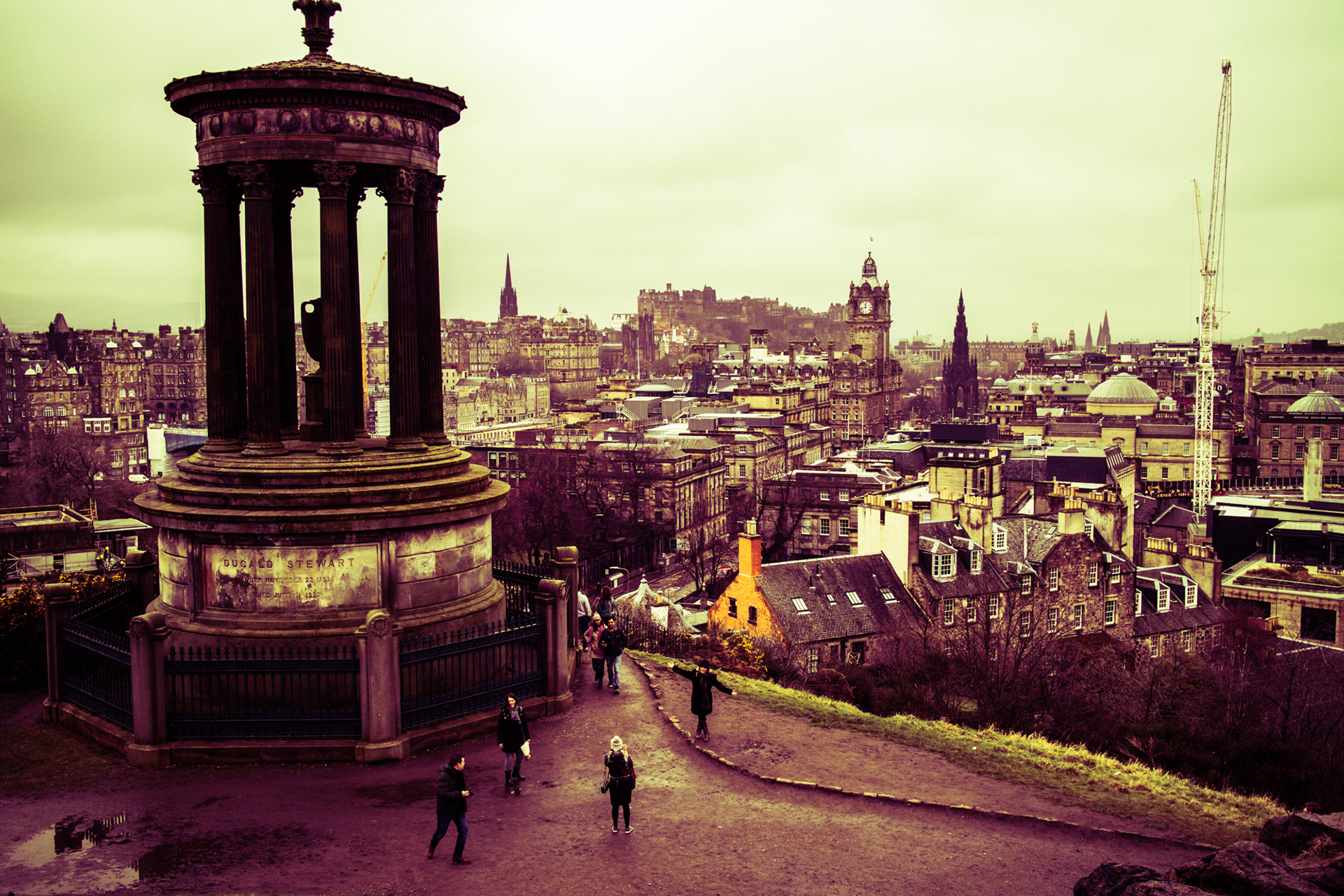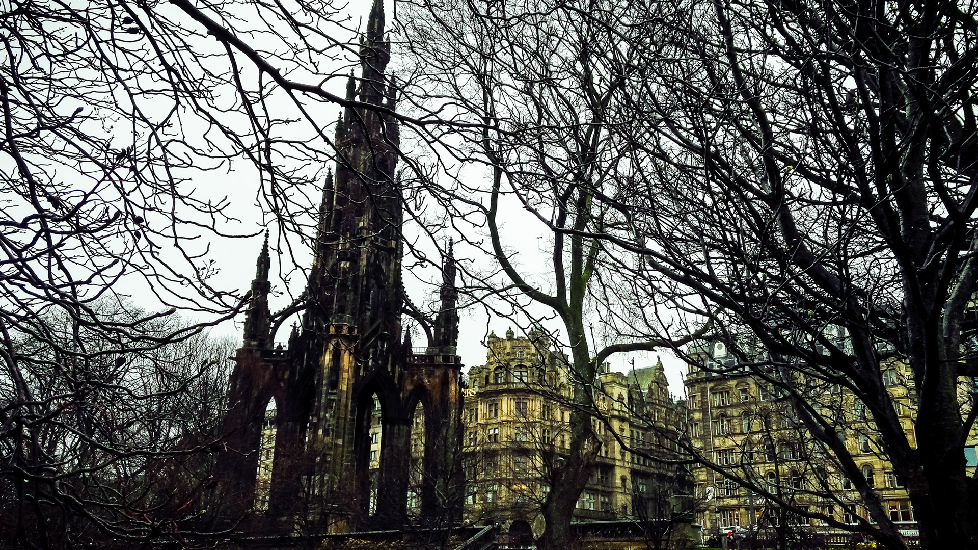 Edinburgh streets in early spring with iconic landmarks. With a cold Northern wind blowing and a mist hanging low over the city, the streets and buildings had a dark cold feel.
