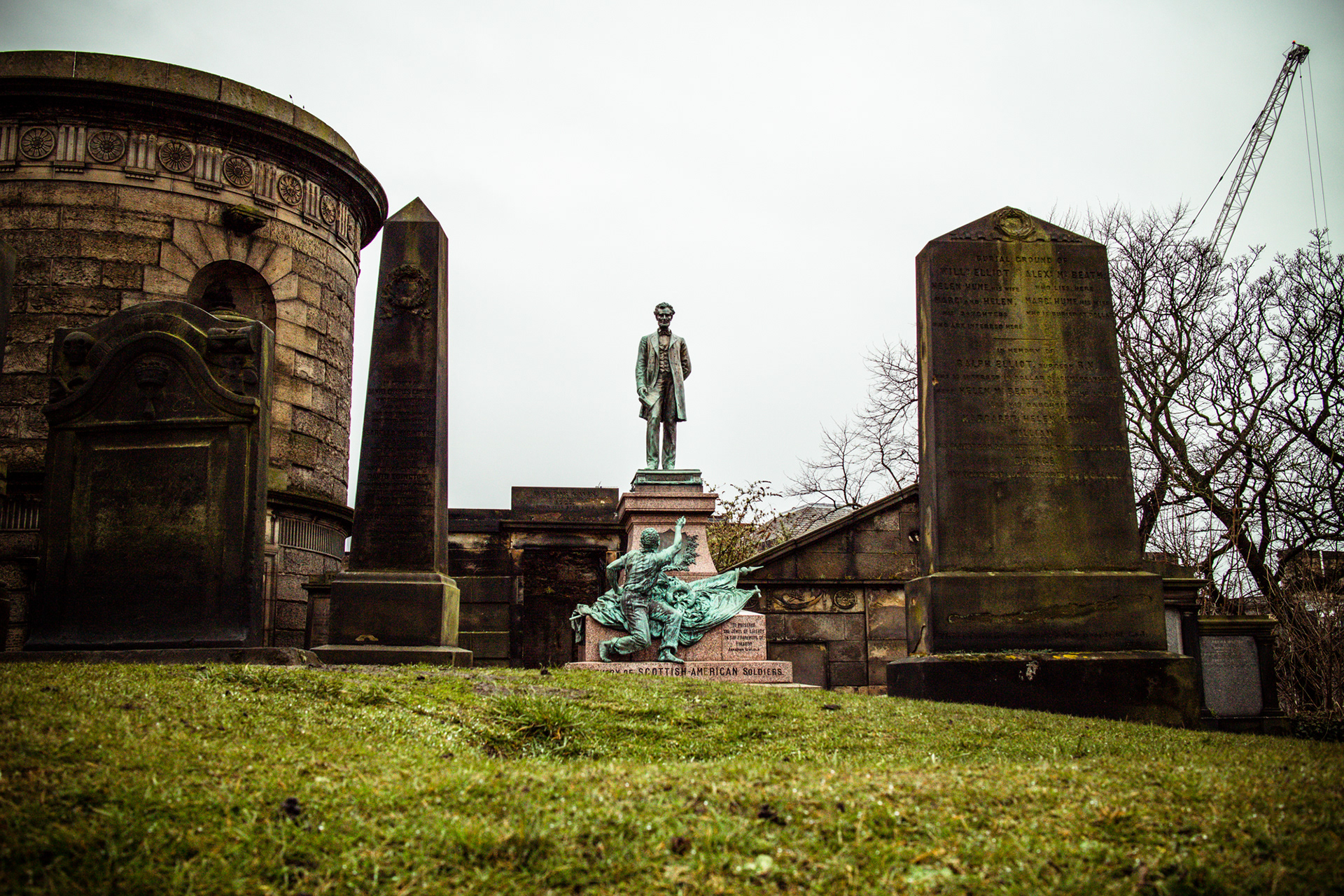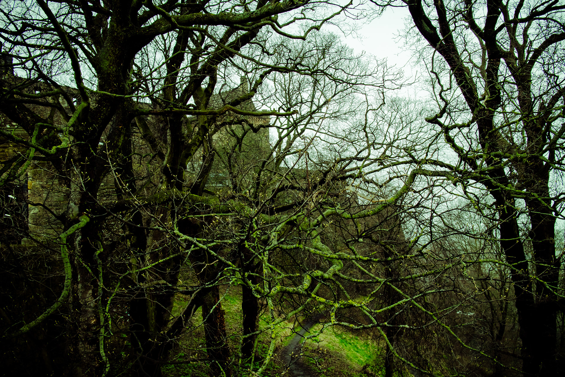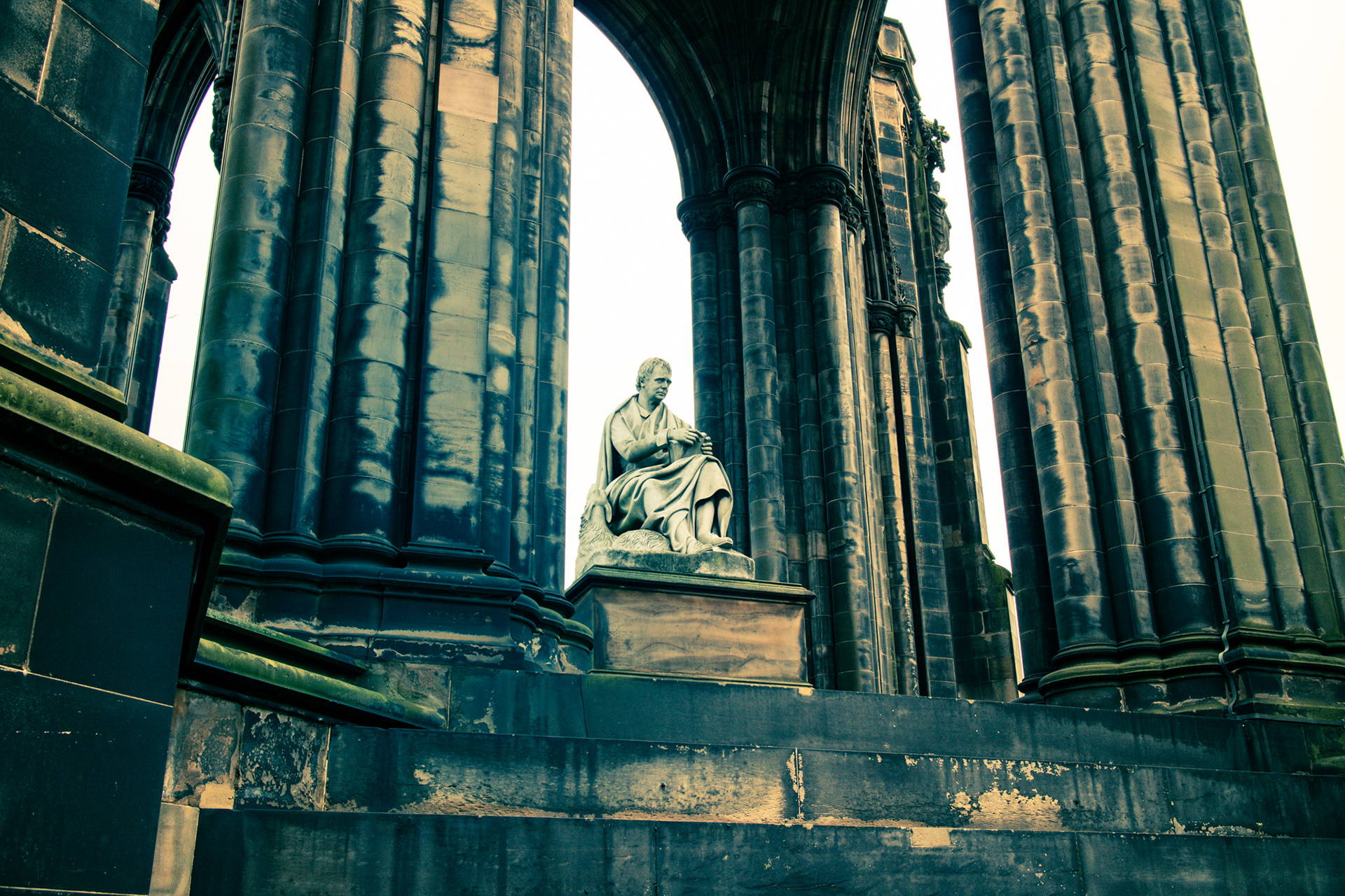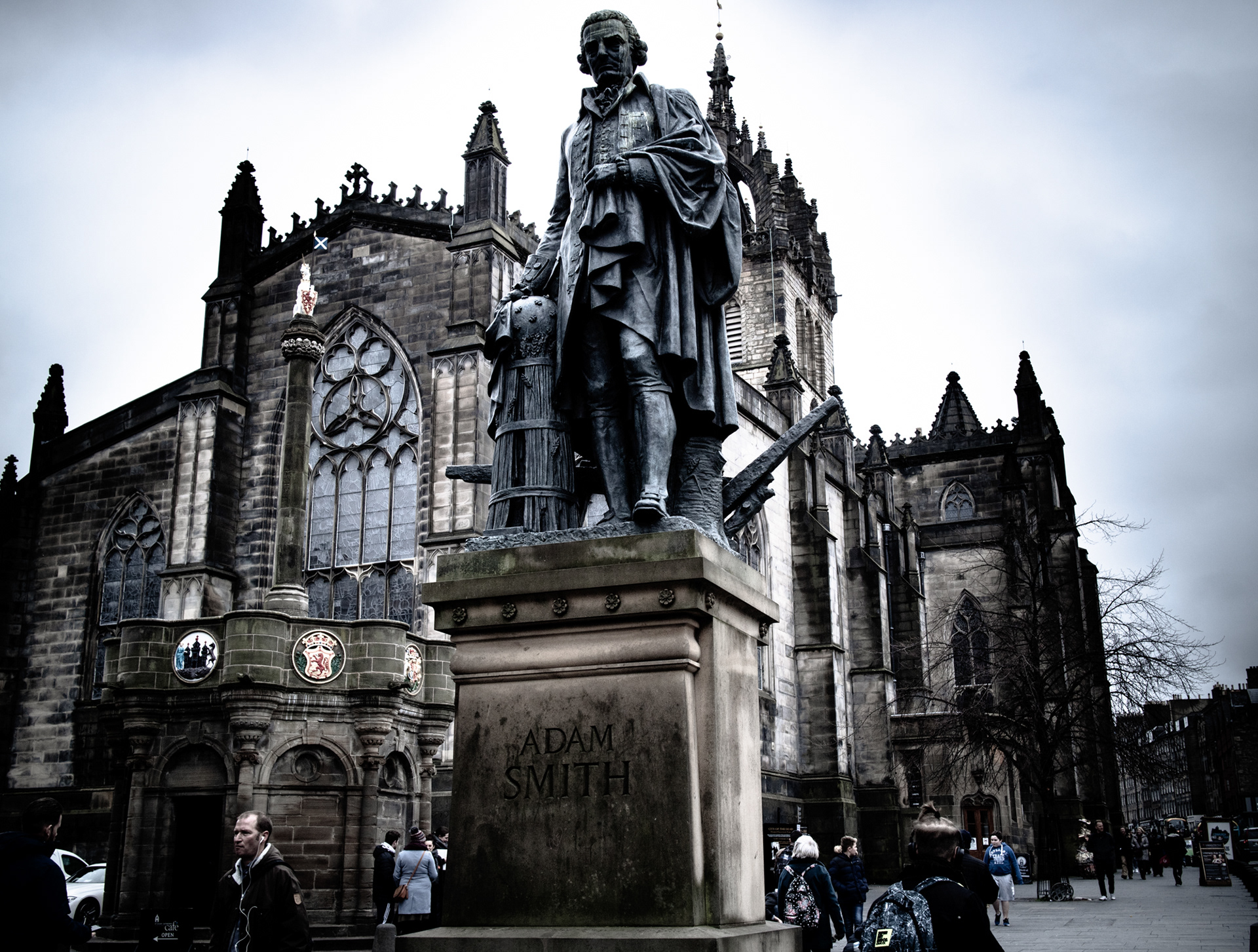 Edinburgh streets in early spring with iconic landmarks. With a cold Northern wind blowing and a mist hanging low over the city, the streets and buildings had a dark cold feel.
