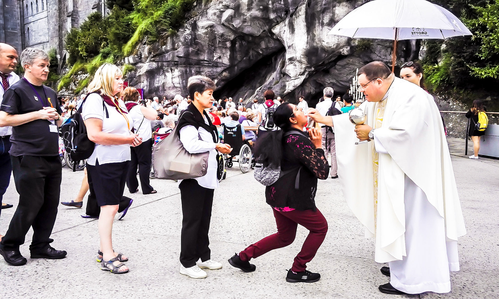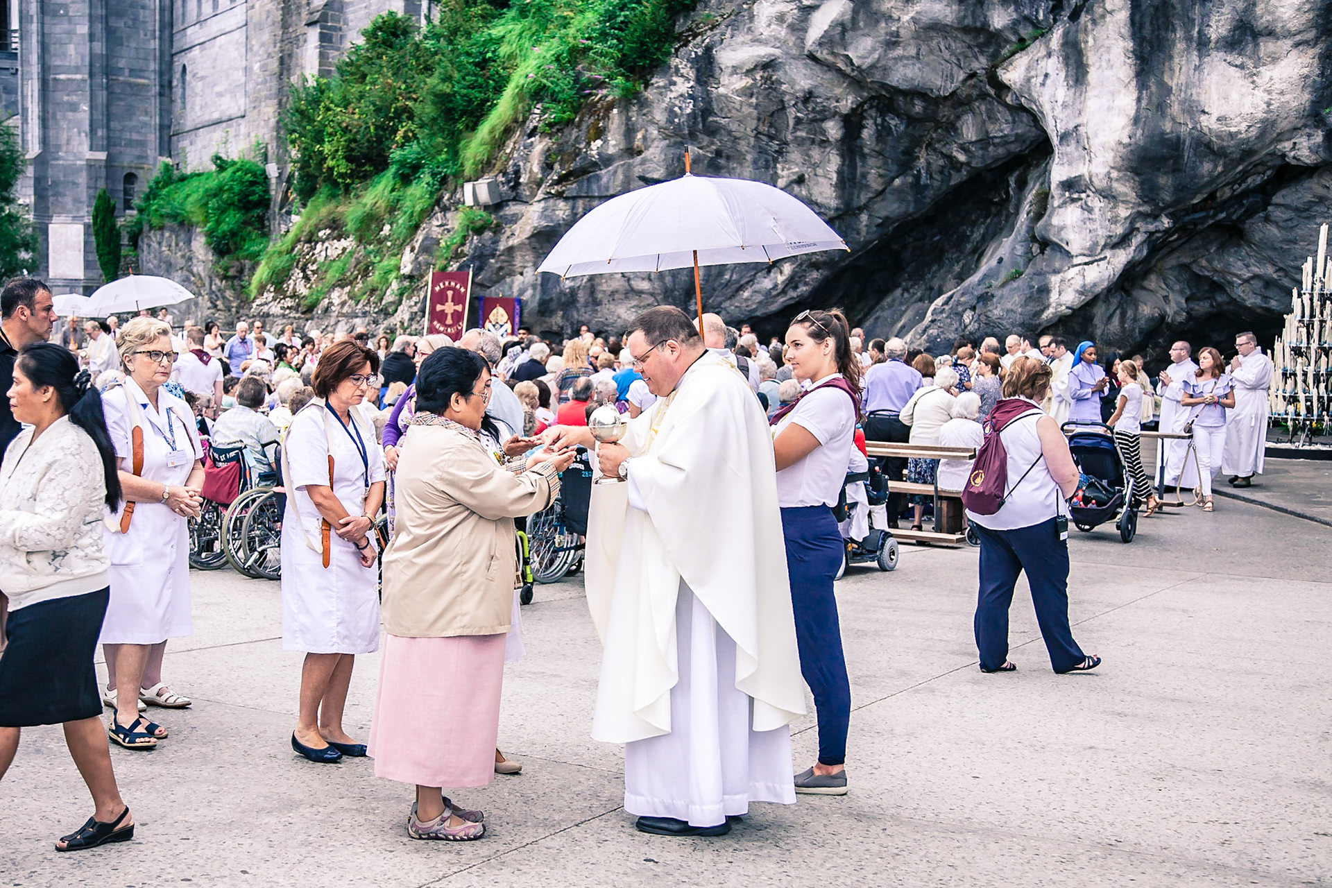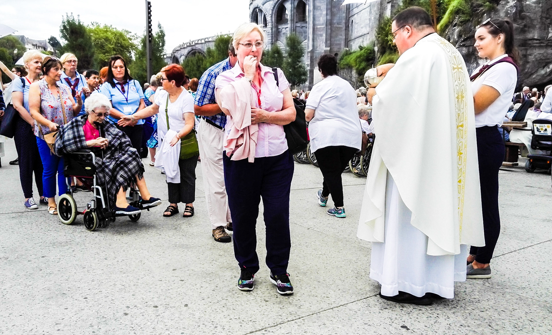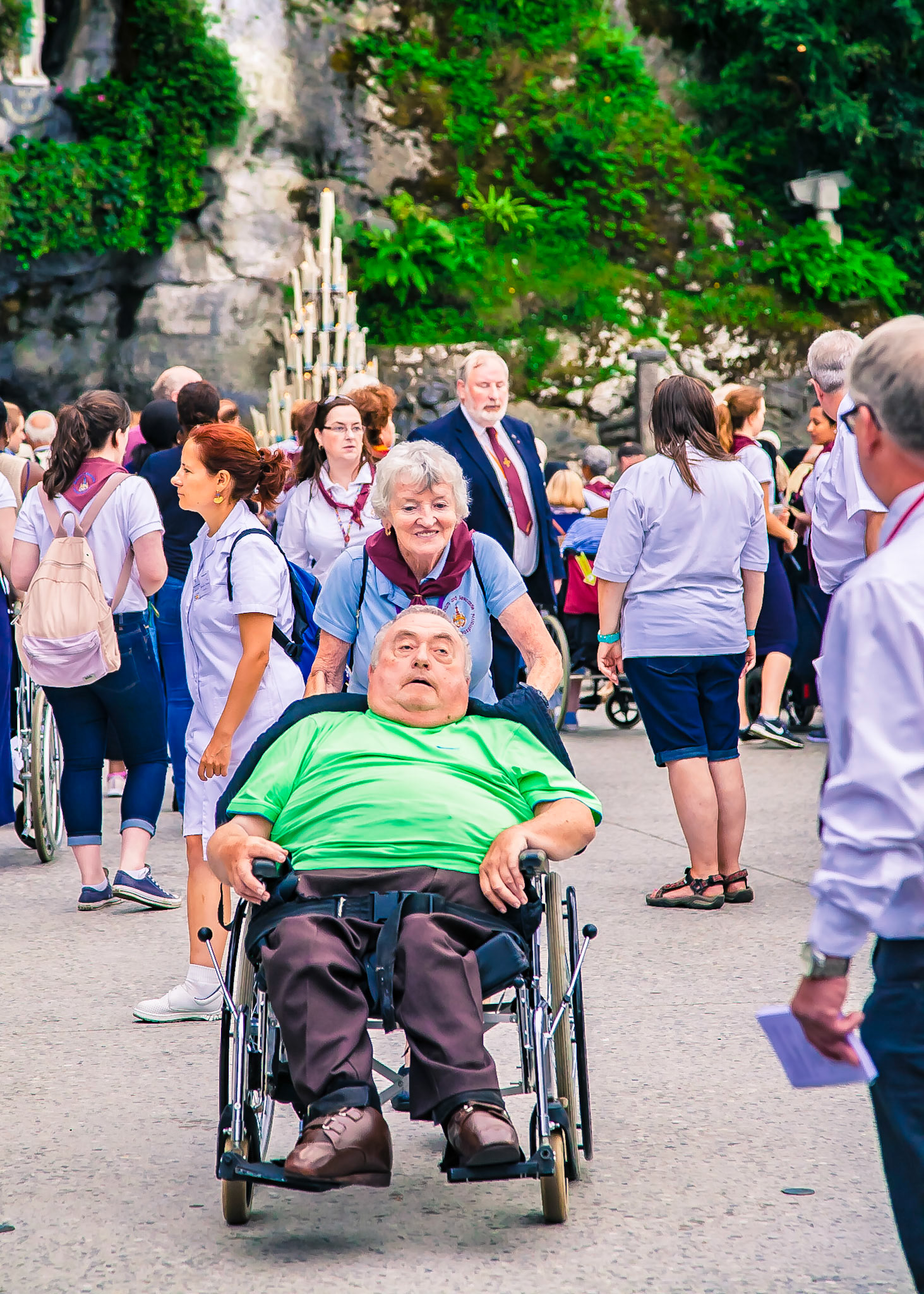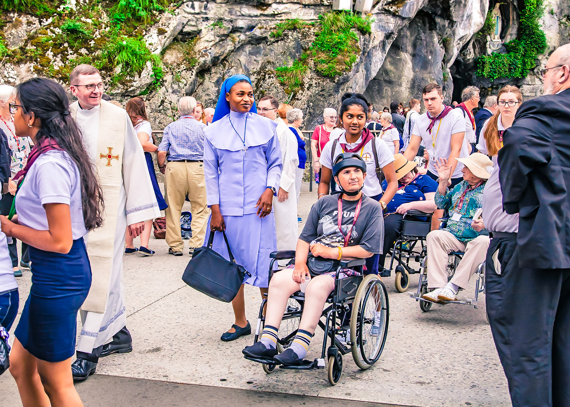 A candid view of pilgrims at Lourdes, their devotion to the Catholic faith. The sick come from all over the world in hope of a cure. The atmosphere around the town and in the Grotto of Massabielle (Grotto of the Apparitions) is peaceful and where in 1858, the Virgin Mary is said to have appeared to a local woman. In the grotto, pilgrims can drink or bathe in water flowing from a spring.