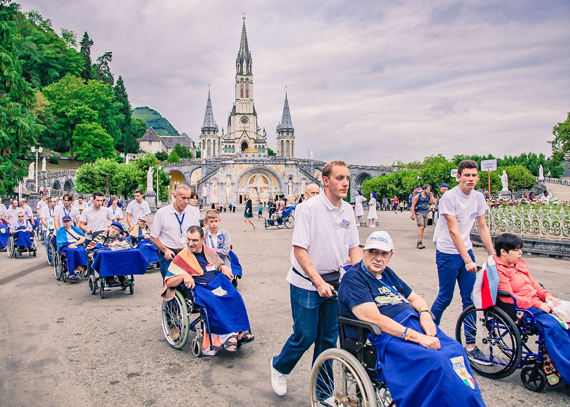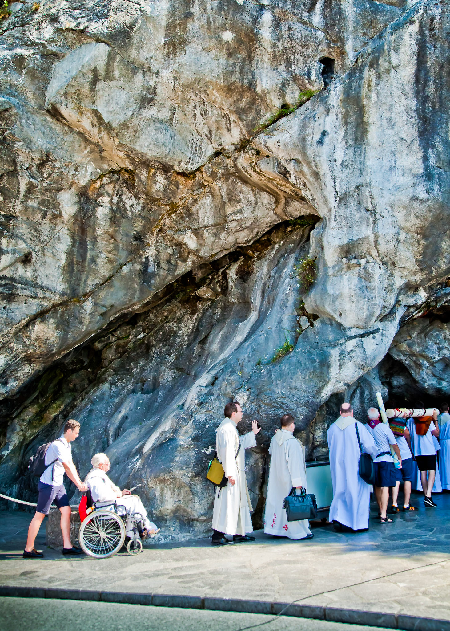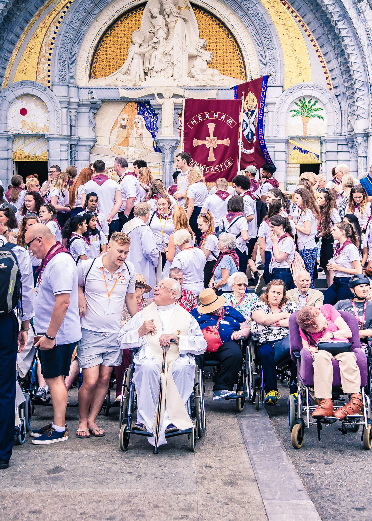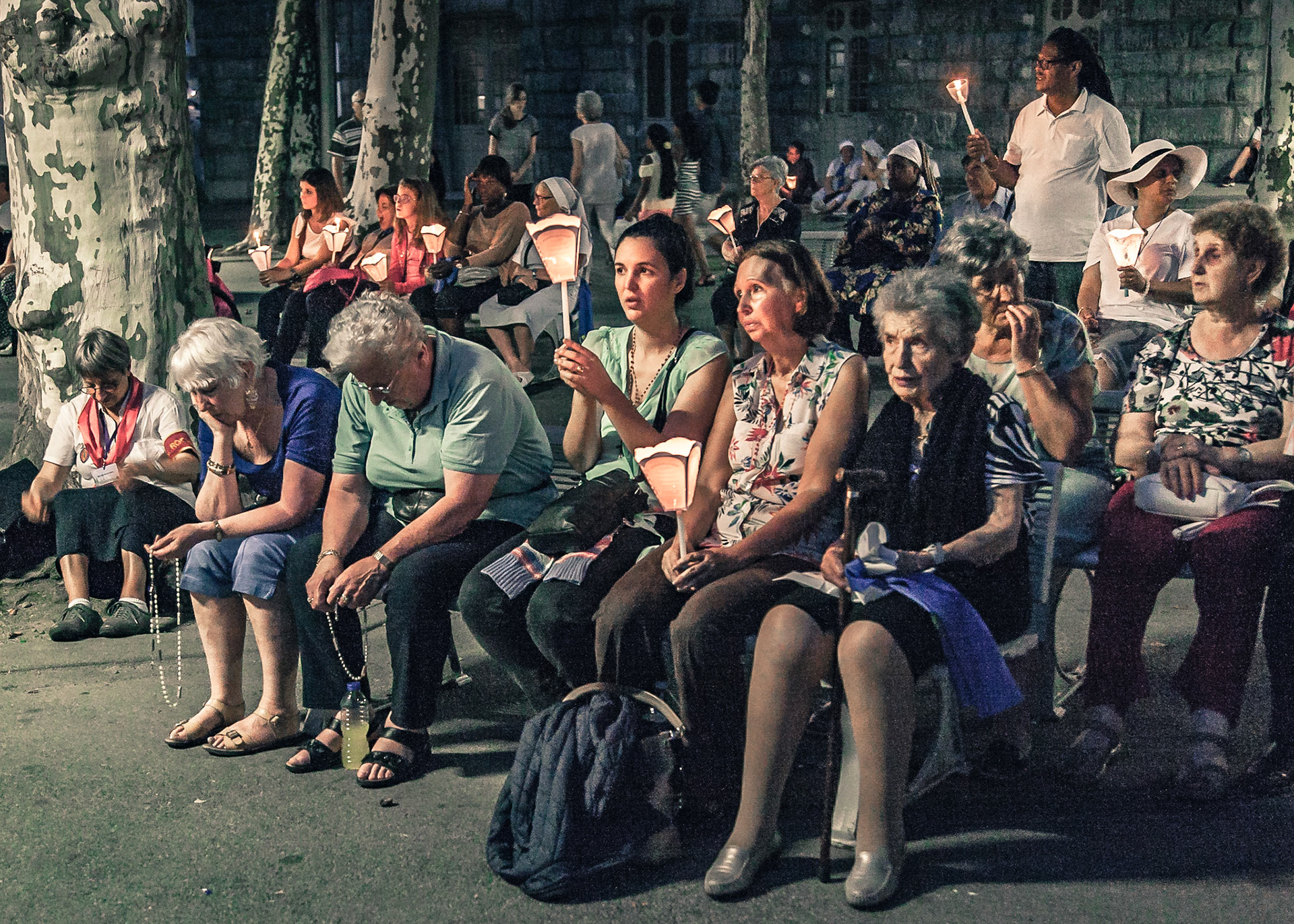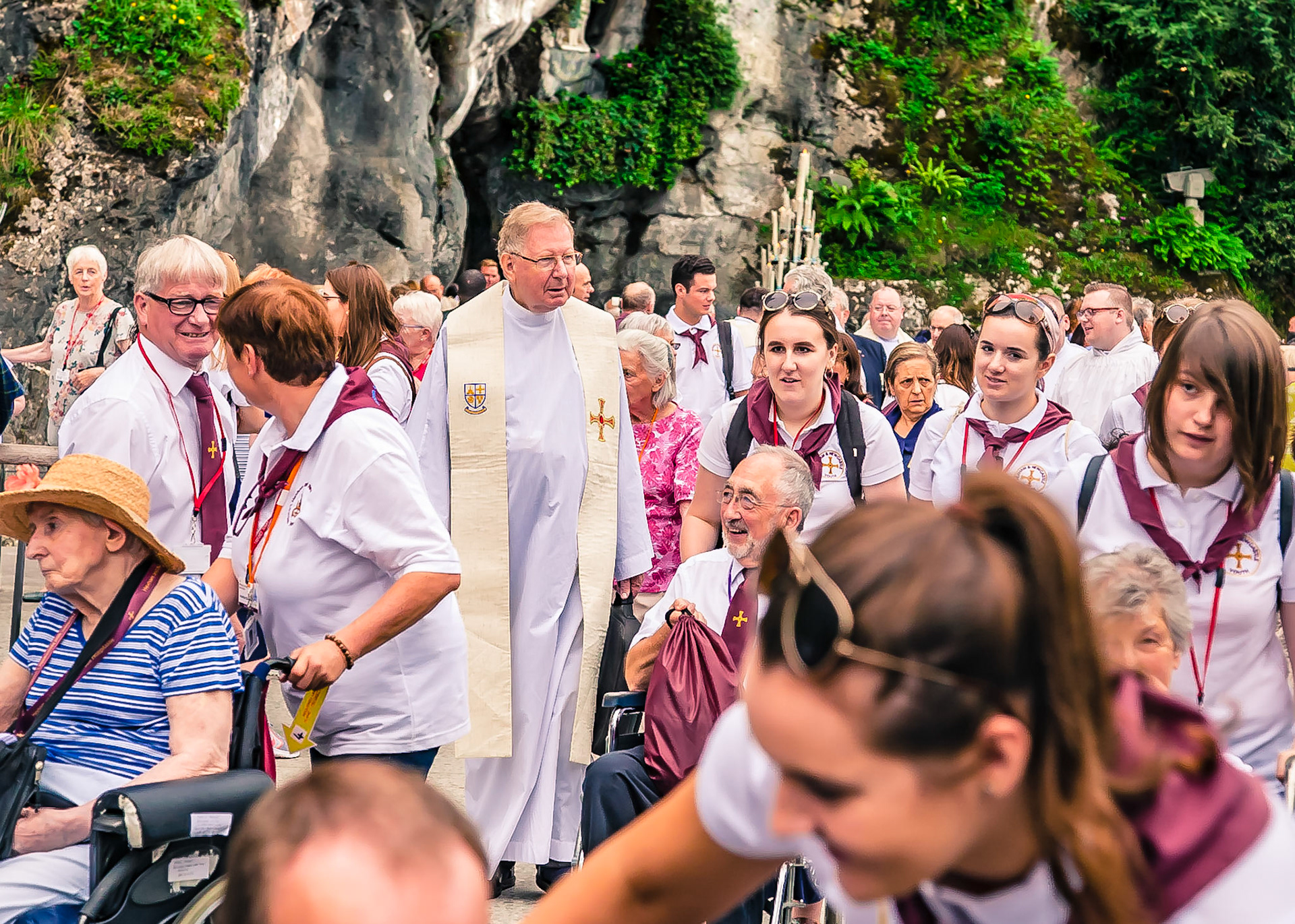 A candid view of pilgrims at Lourdes, their devotion to the Catholic faith. The sick come from all over the world in hope of a cure. The atmosphere around the town and in the Grotto of Massabielle (Grotto of the Apparitions) is peaceful and where in 1858, the Virgin Mary is said to have appeared to a local woman. In the grotto, pilgrims can drink or bathe in water flowing from a spring.
