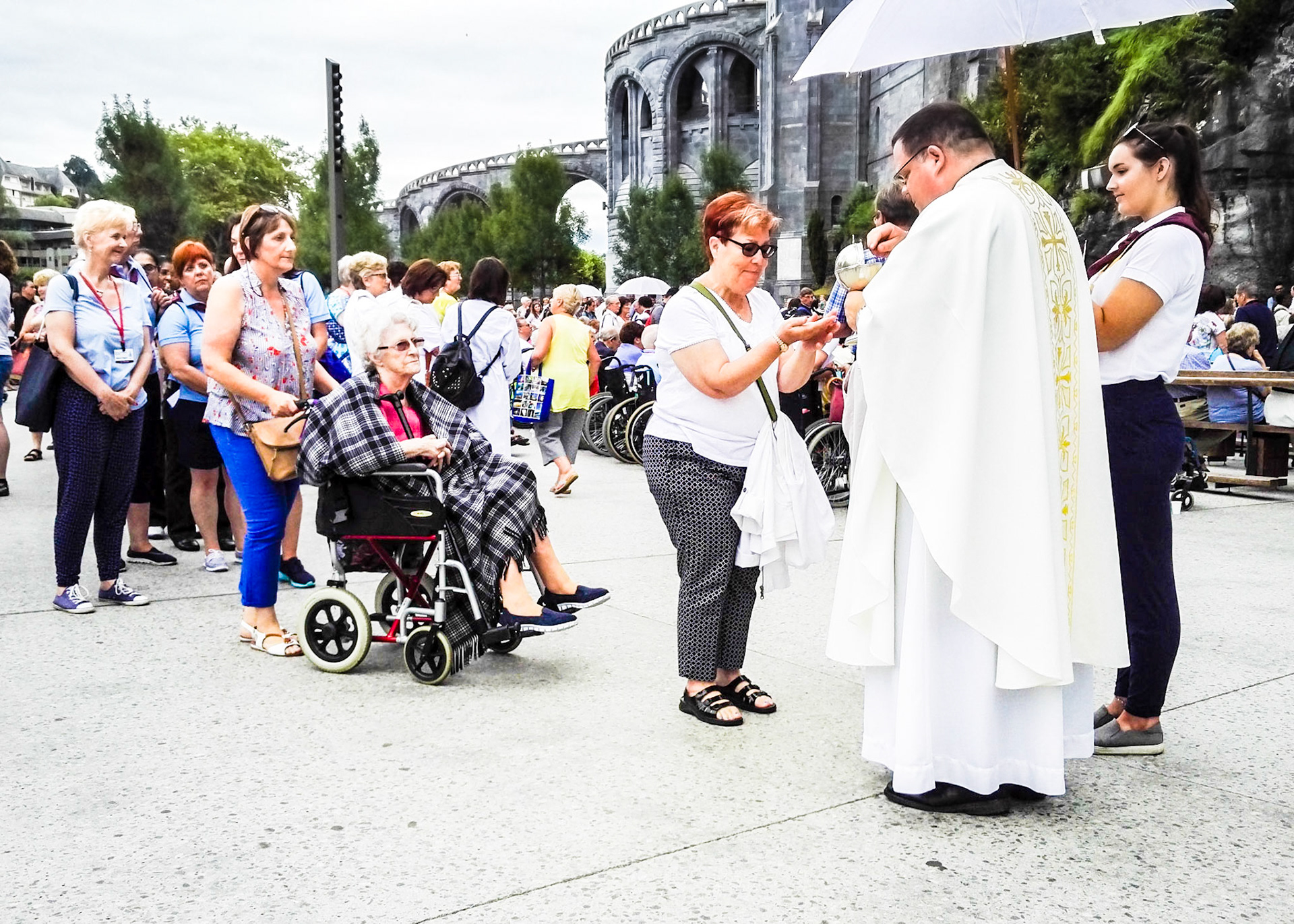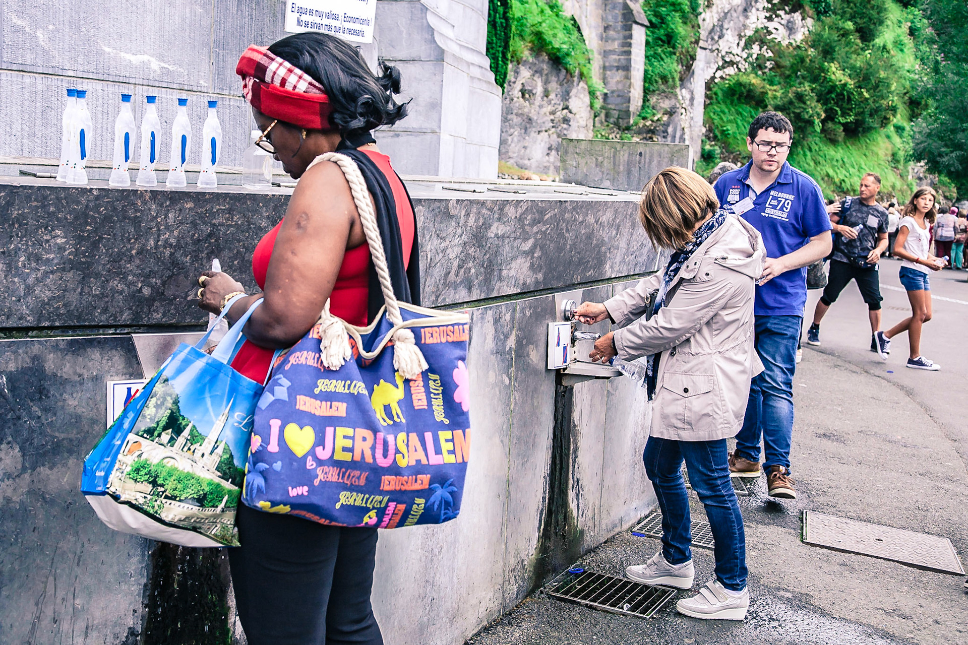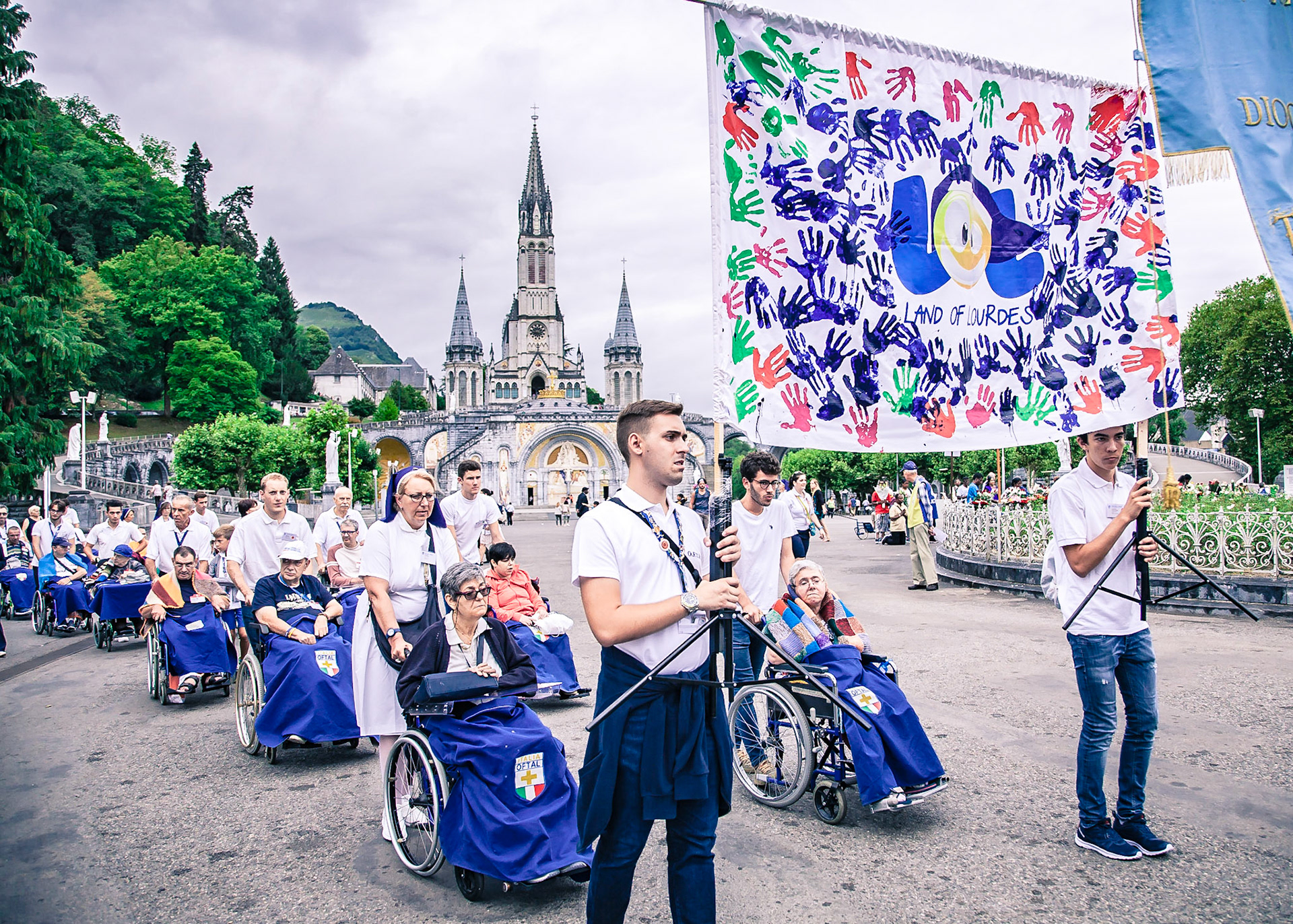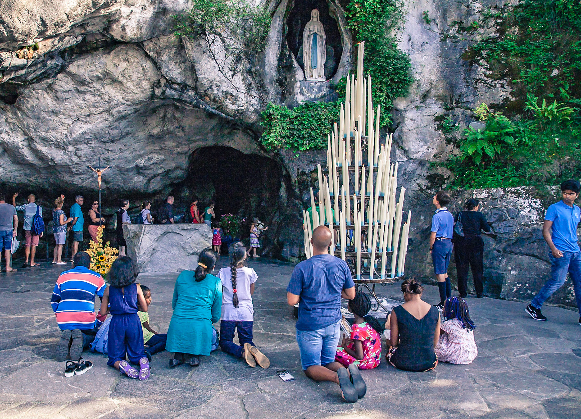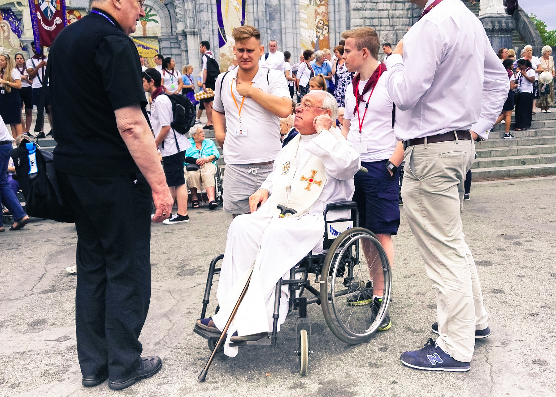 A candid view of pilgrims at Lourdes, their devotion to the Catholic faith. The sick come from all over the world in hope of a cure. The atmosphere around the town and in the Grotto of Massabielle (Grotto of the Apparitions) is peaceful and where in 1858, the Virgin Mary is said to have appeared to a local woman. In the grotto, pilgrims can drink or bathe in water flowing from a spring.