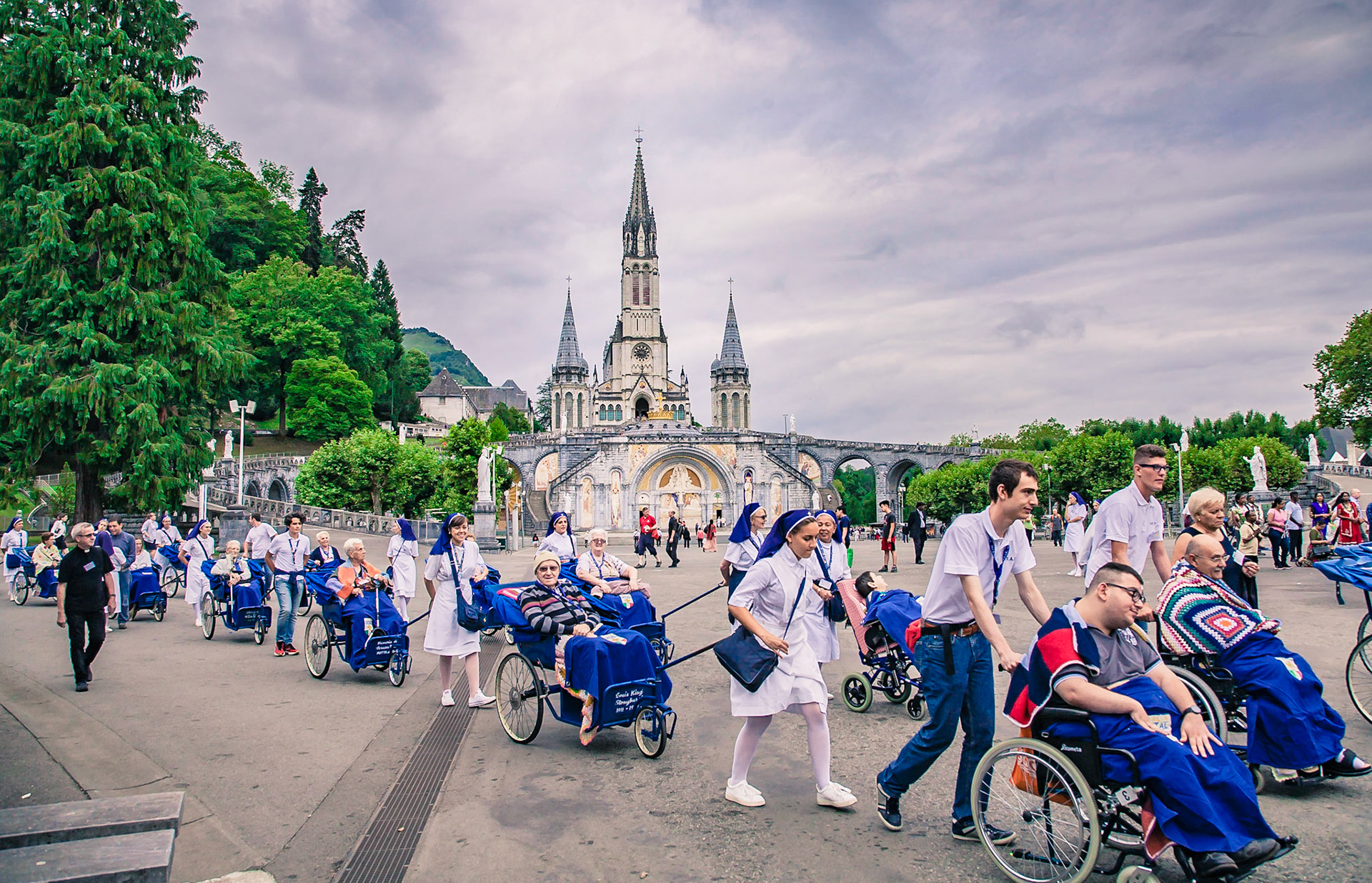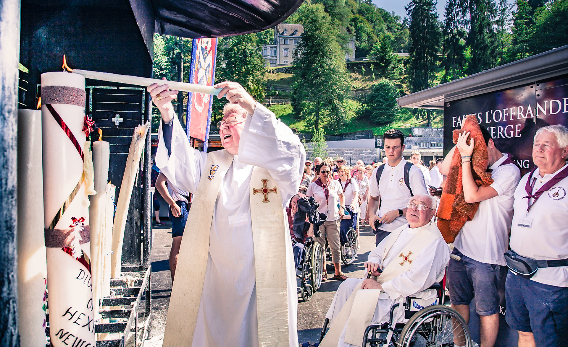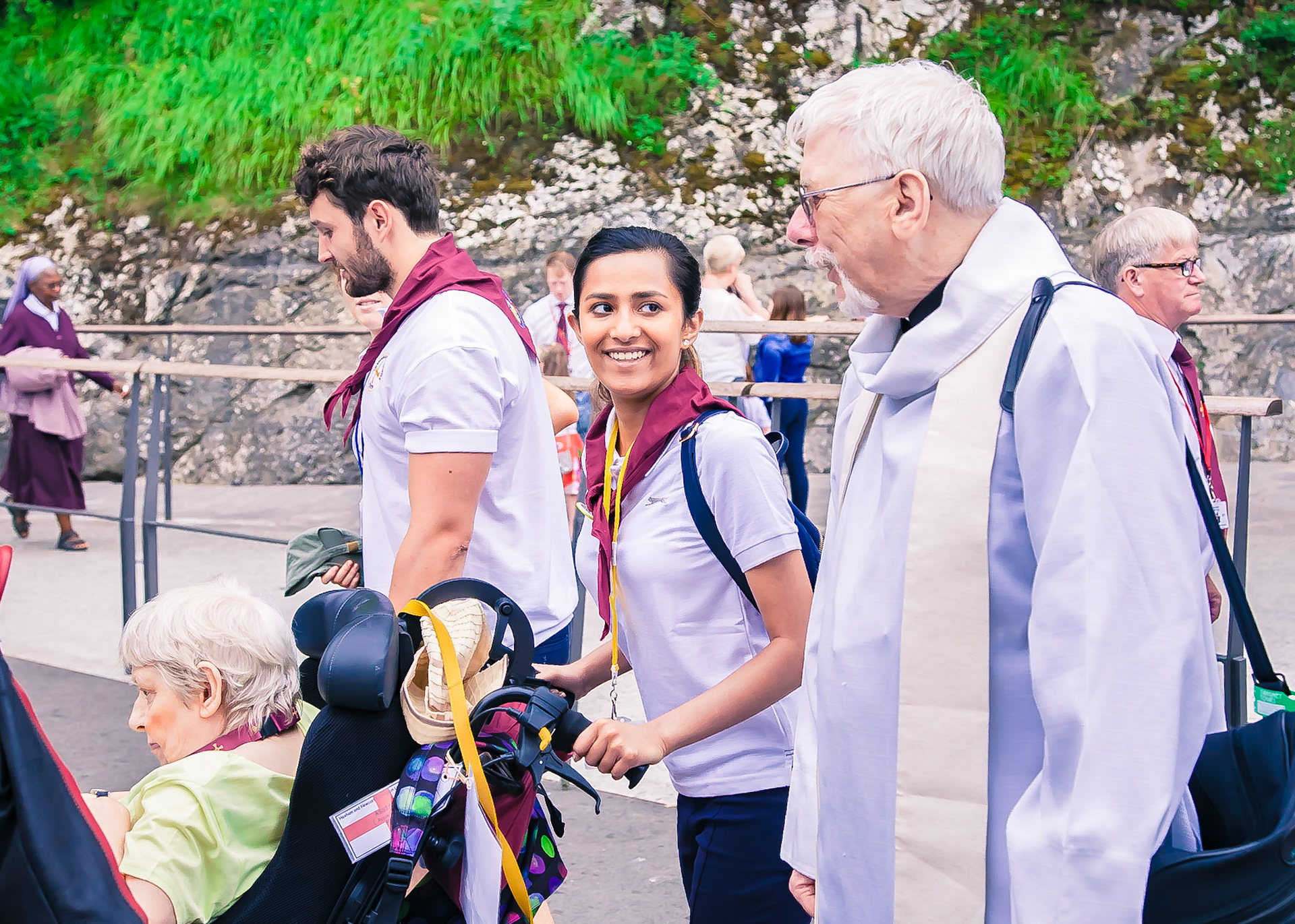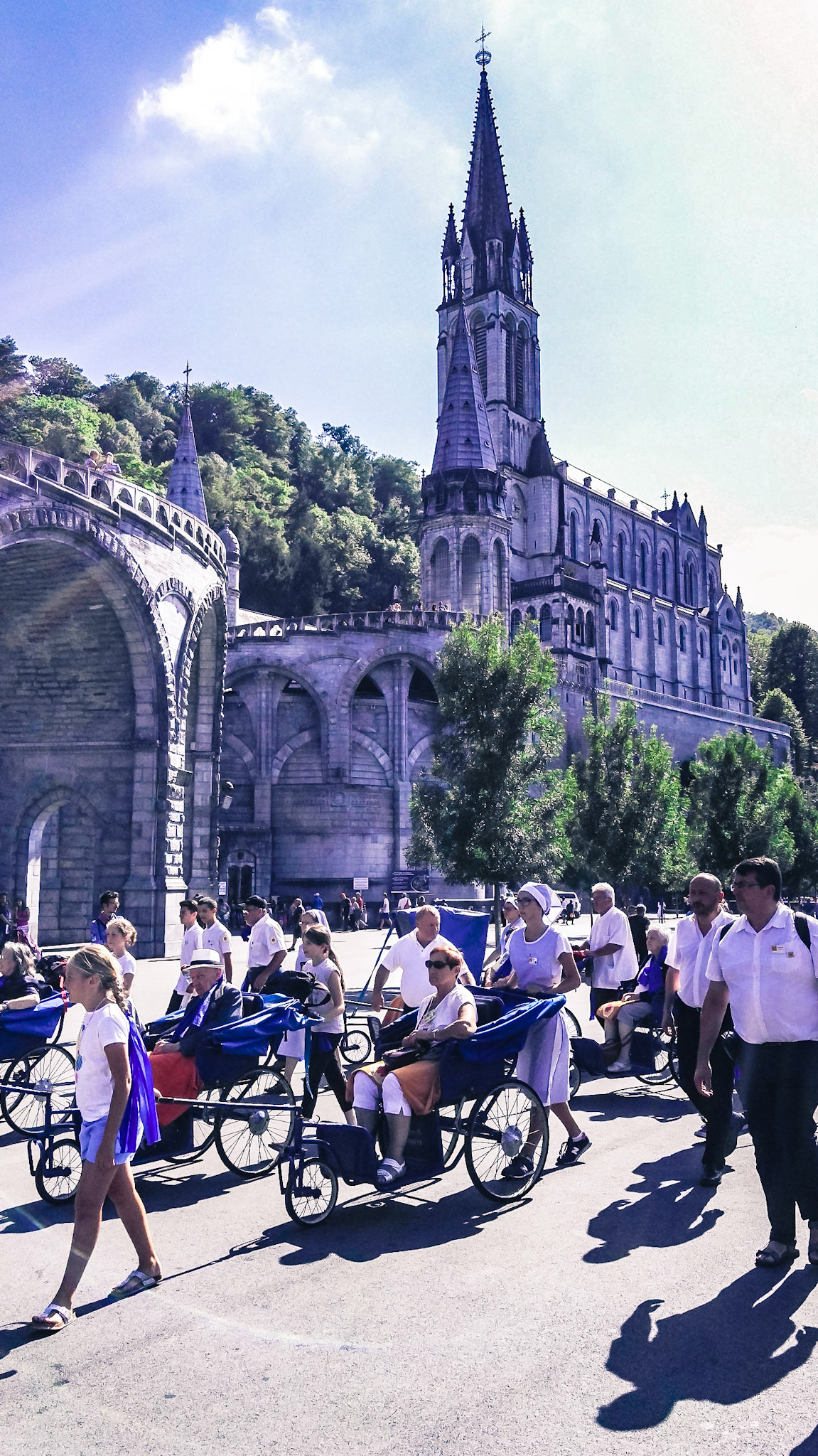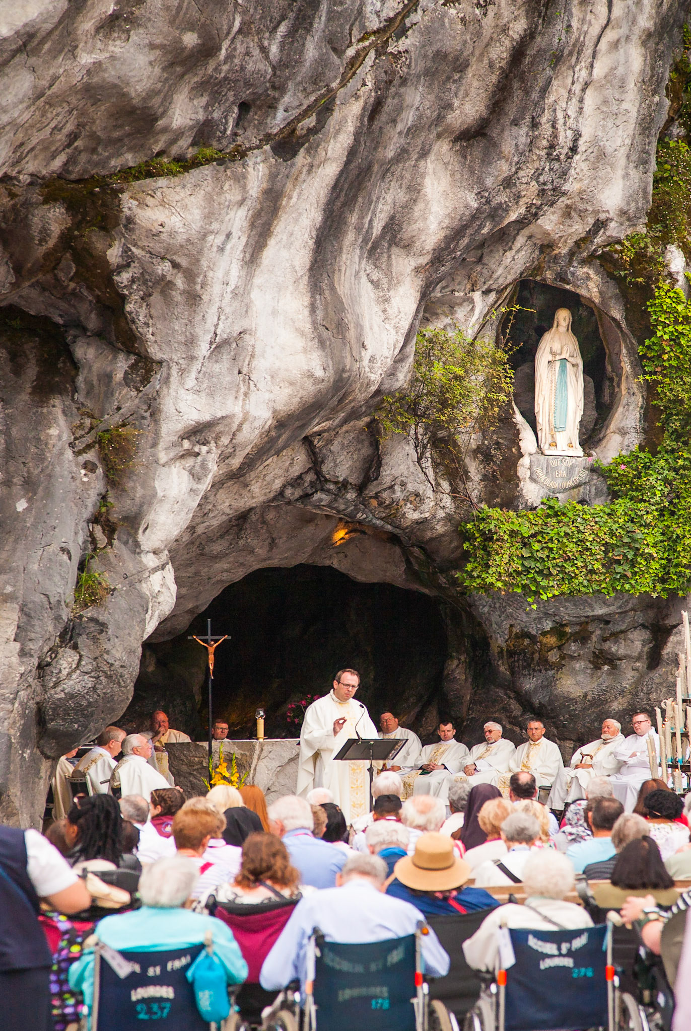 A candid view of pilgrims at Lourdes, their devotion to the Catholic faith. The sick come from all over the world in hope of a cure. The atmosphere around the town and in the Grotto of Massabielle (Grotto of the Apparitions) is peaceful and where in 1858, the Virgin Mary is said to have appeared to a local woman. In the grotto, pilgrims can drink or bathe in water flowing from a spring.