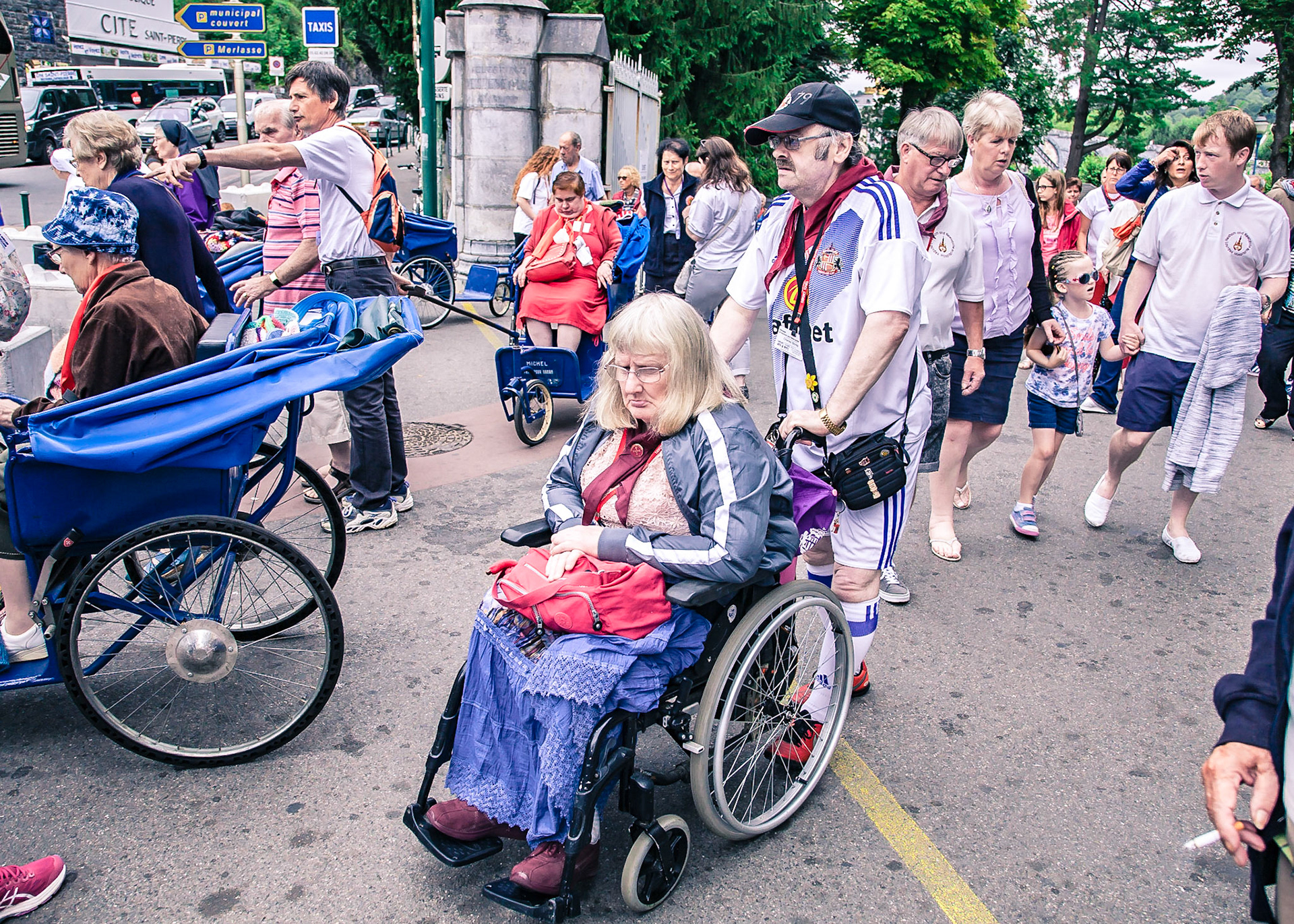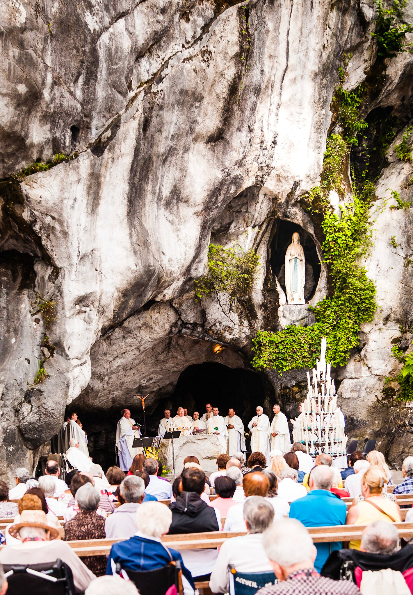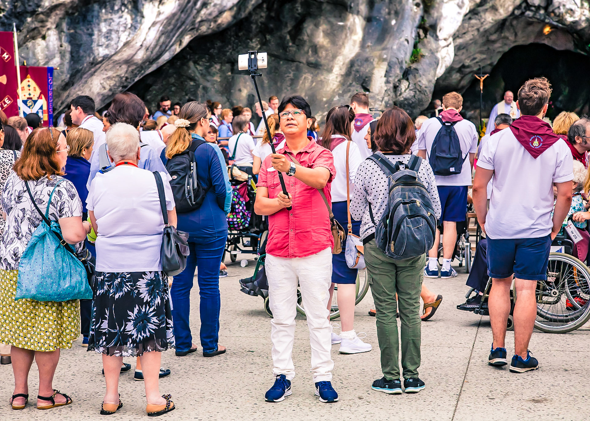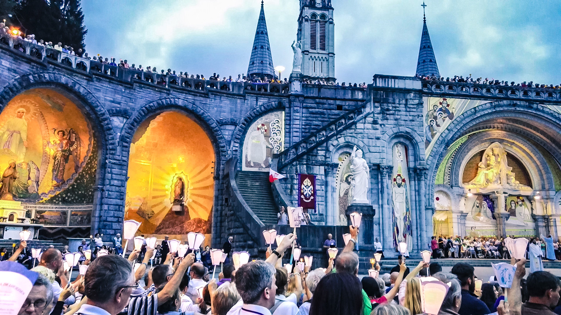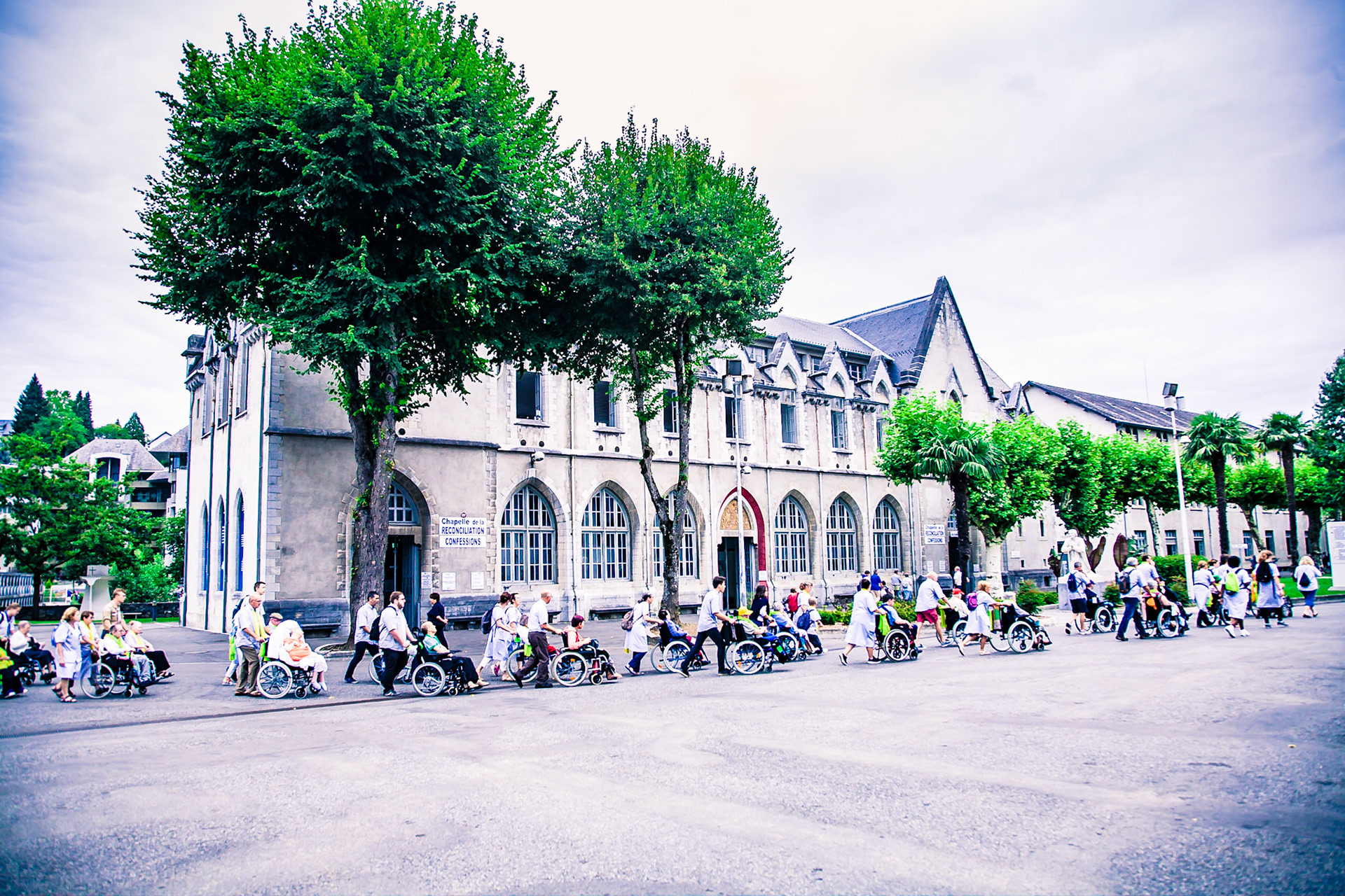 A candid view of pilgrims at Lourdes, their devotion to the Catholic faith. The sick come from all over the world in hope of a cure. The atmosphere around the town and in the Grotto of Massabielle (Grotto of the Apparitions) is peaceful and where in 1858, the Virgin Mary is said to have appeared to a local woman. In the grotto, pilgrims can drink or bathe in water flowing from a spring.