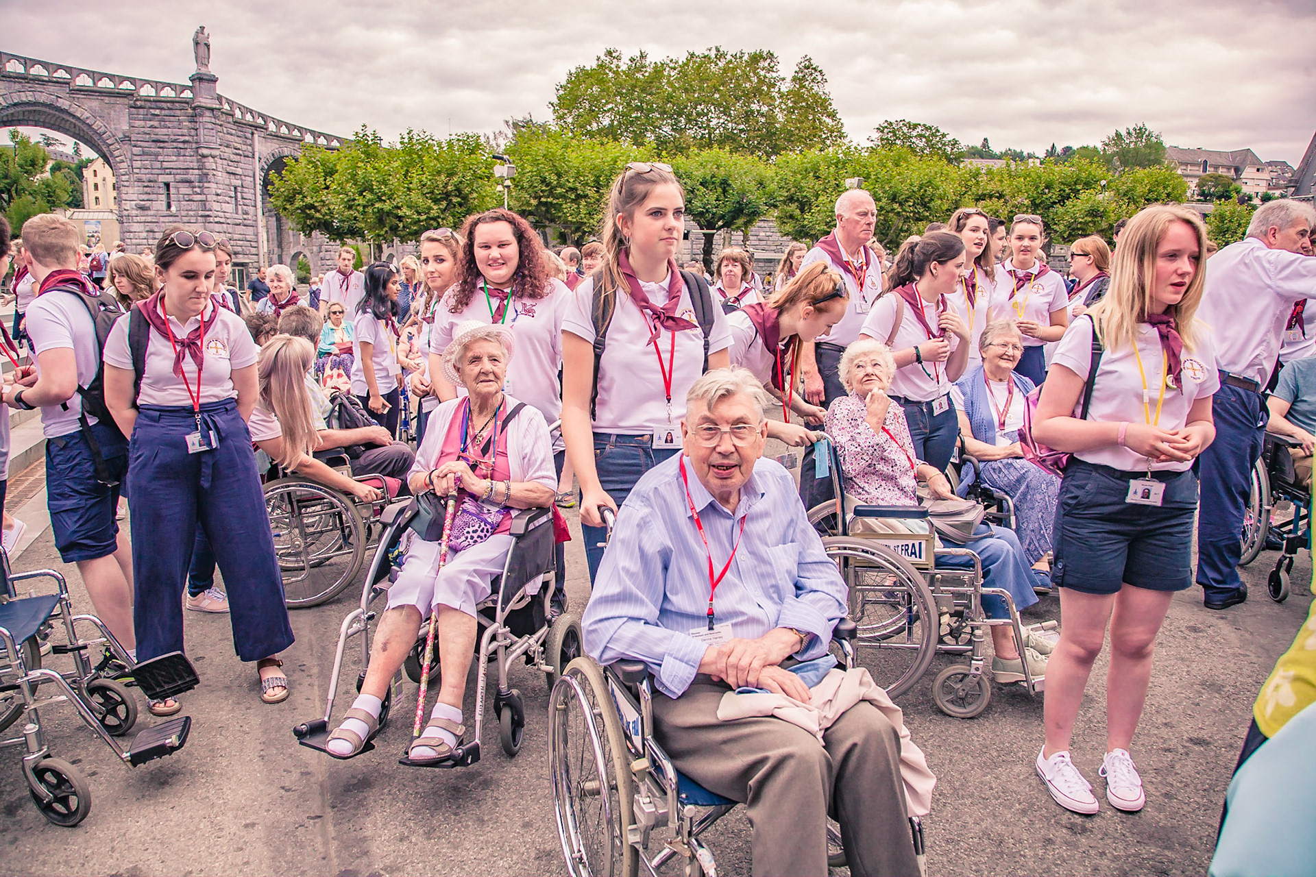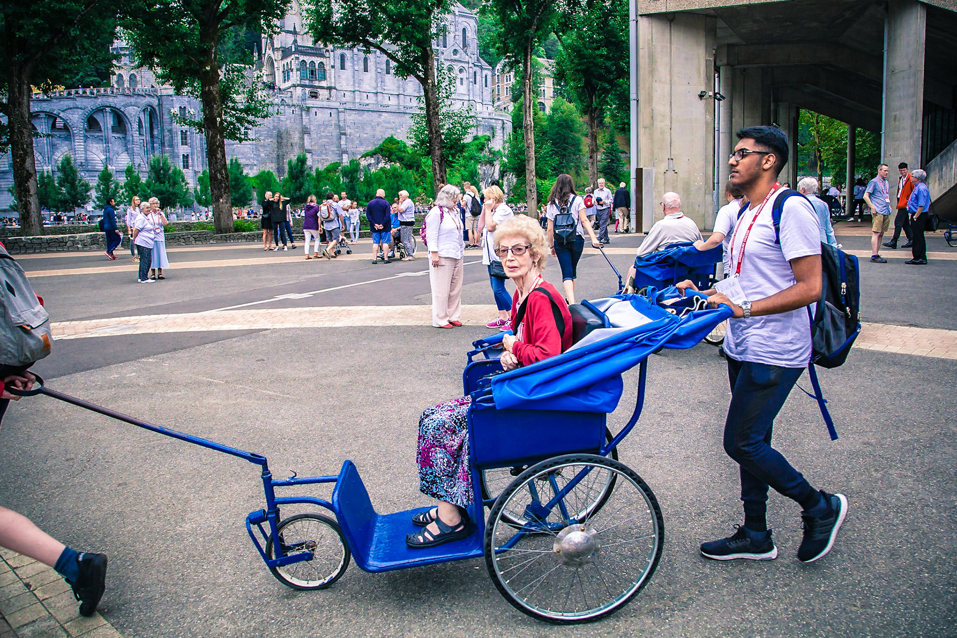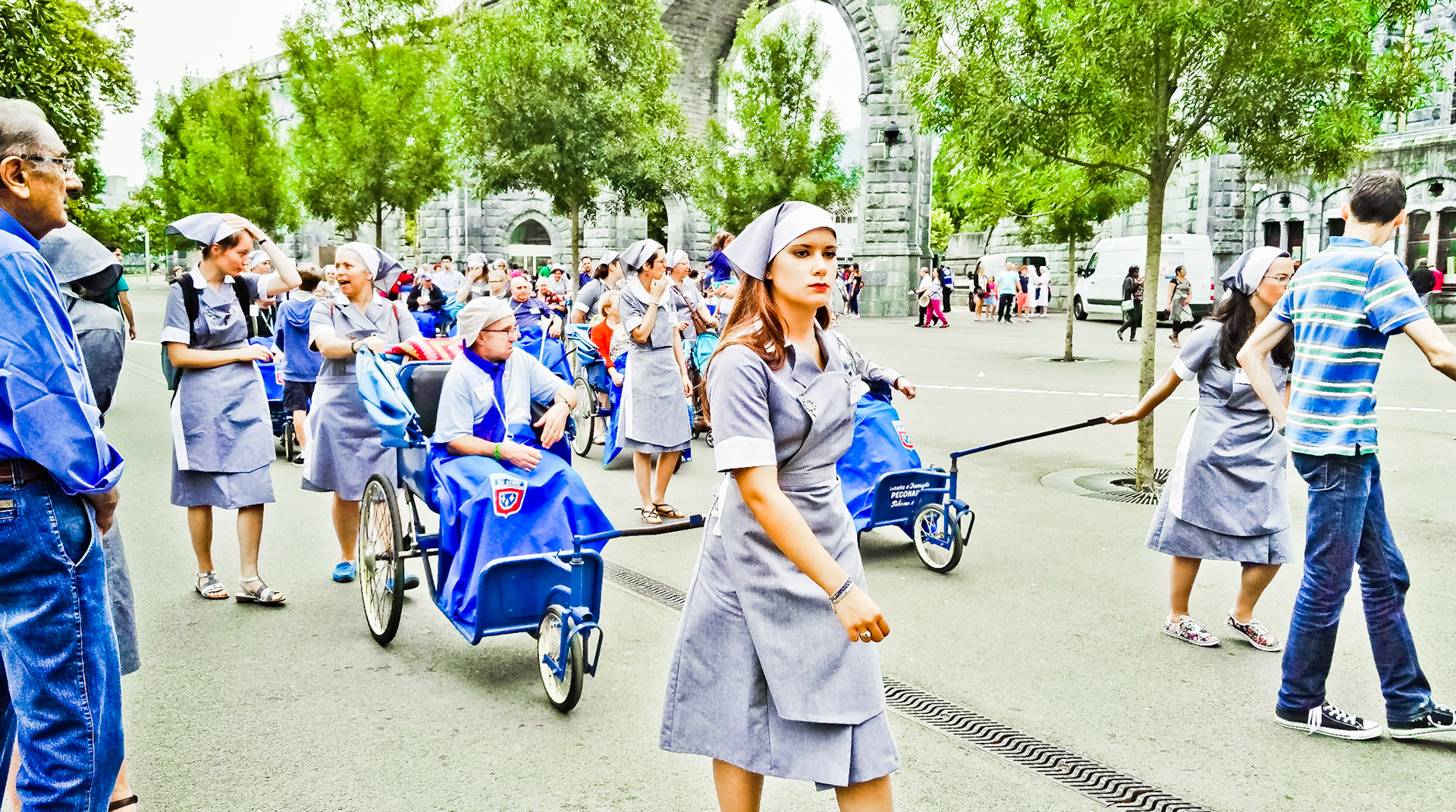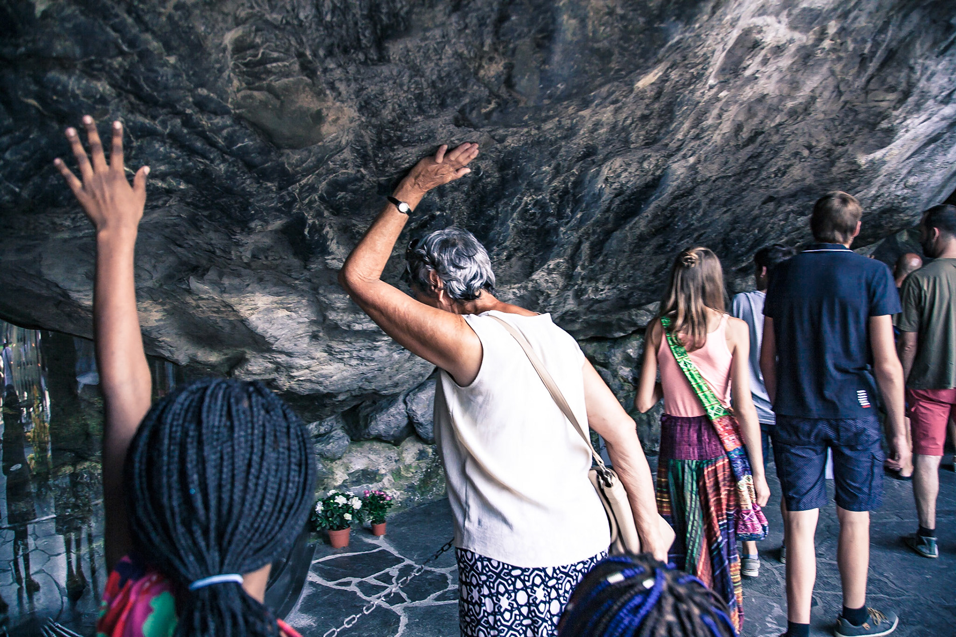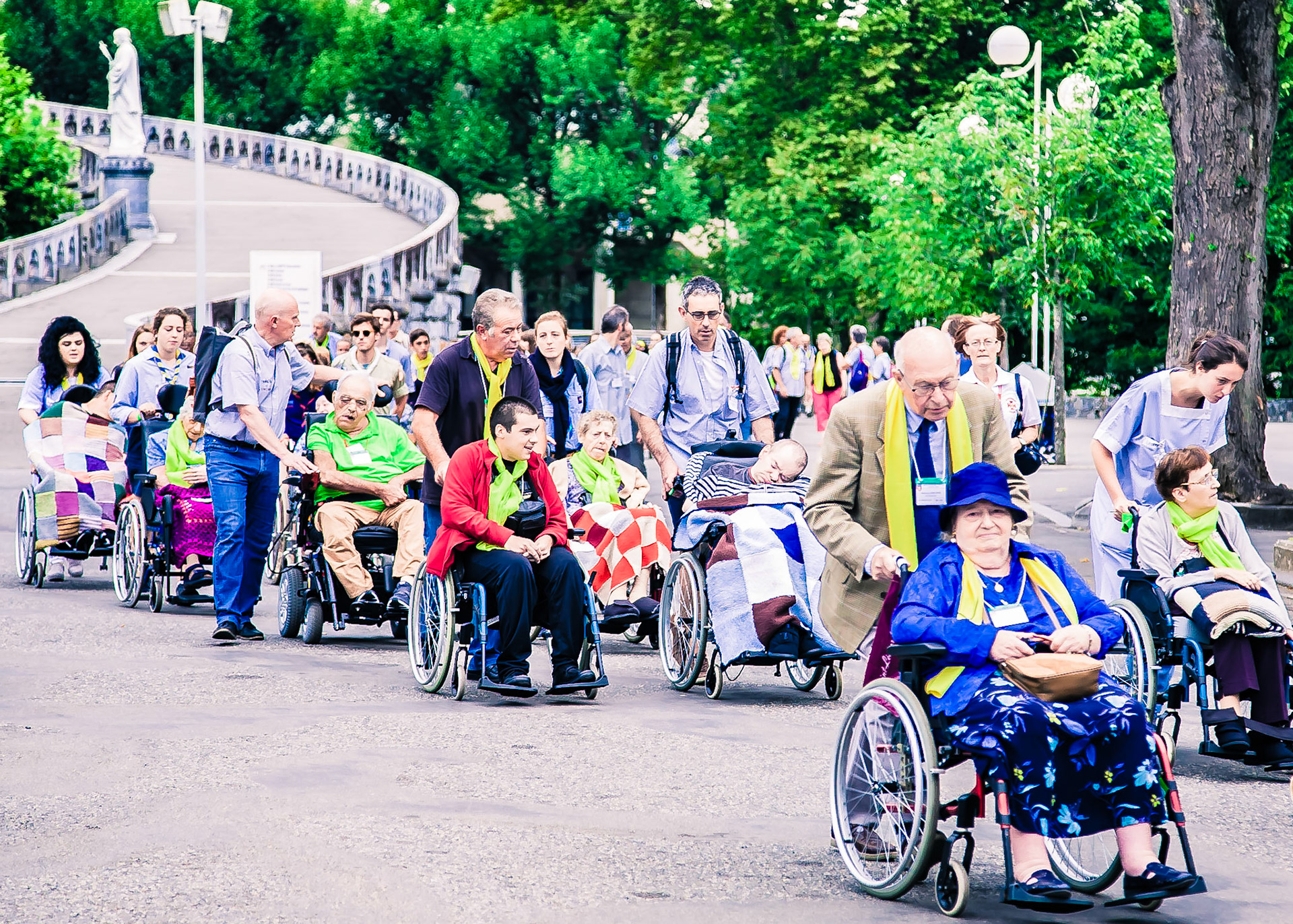 A candid view of pilgrims at Lourdes, their devotion to the Catholic faith. The sick come from all over the world in hope of a cure. The atmosphere around the town and in the Grotto of Massabielle (Grotto of the Apparitions) is peaceful and where in 1858, the Virgin Mary is said to have appeared to a local woman. In the grotto, pilgrims can drink or bathe in water flowing from a spring.