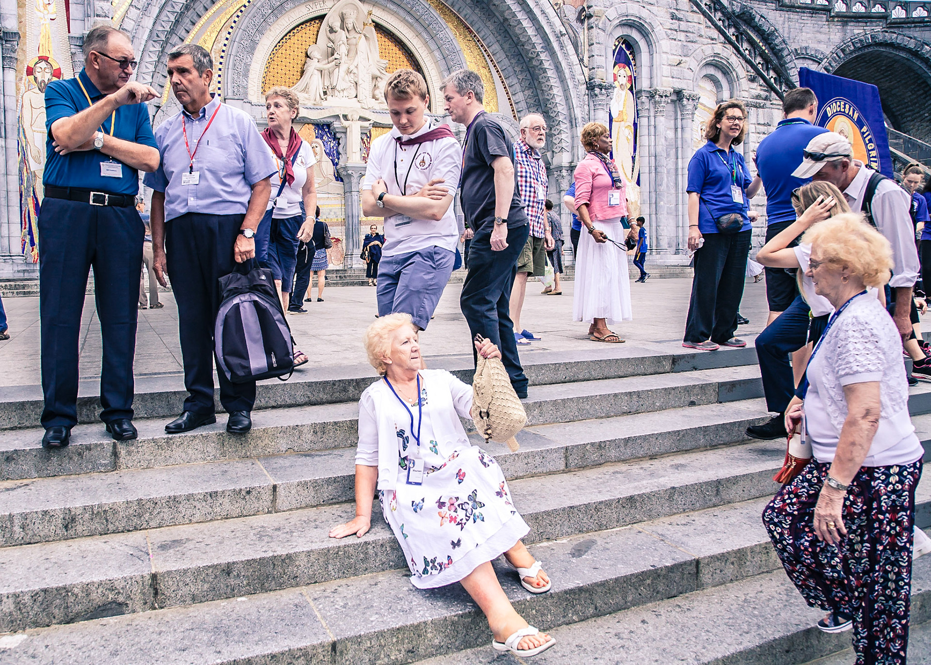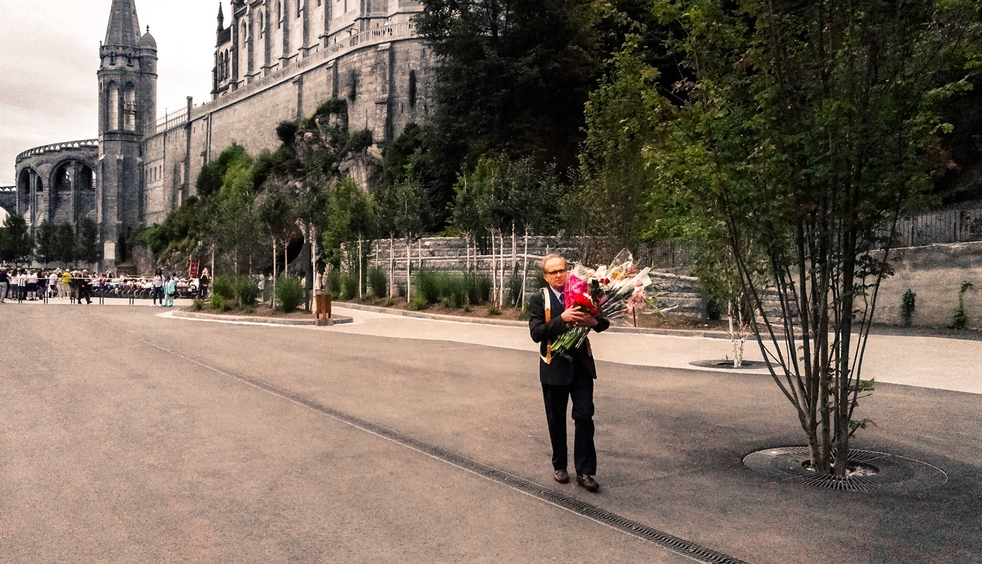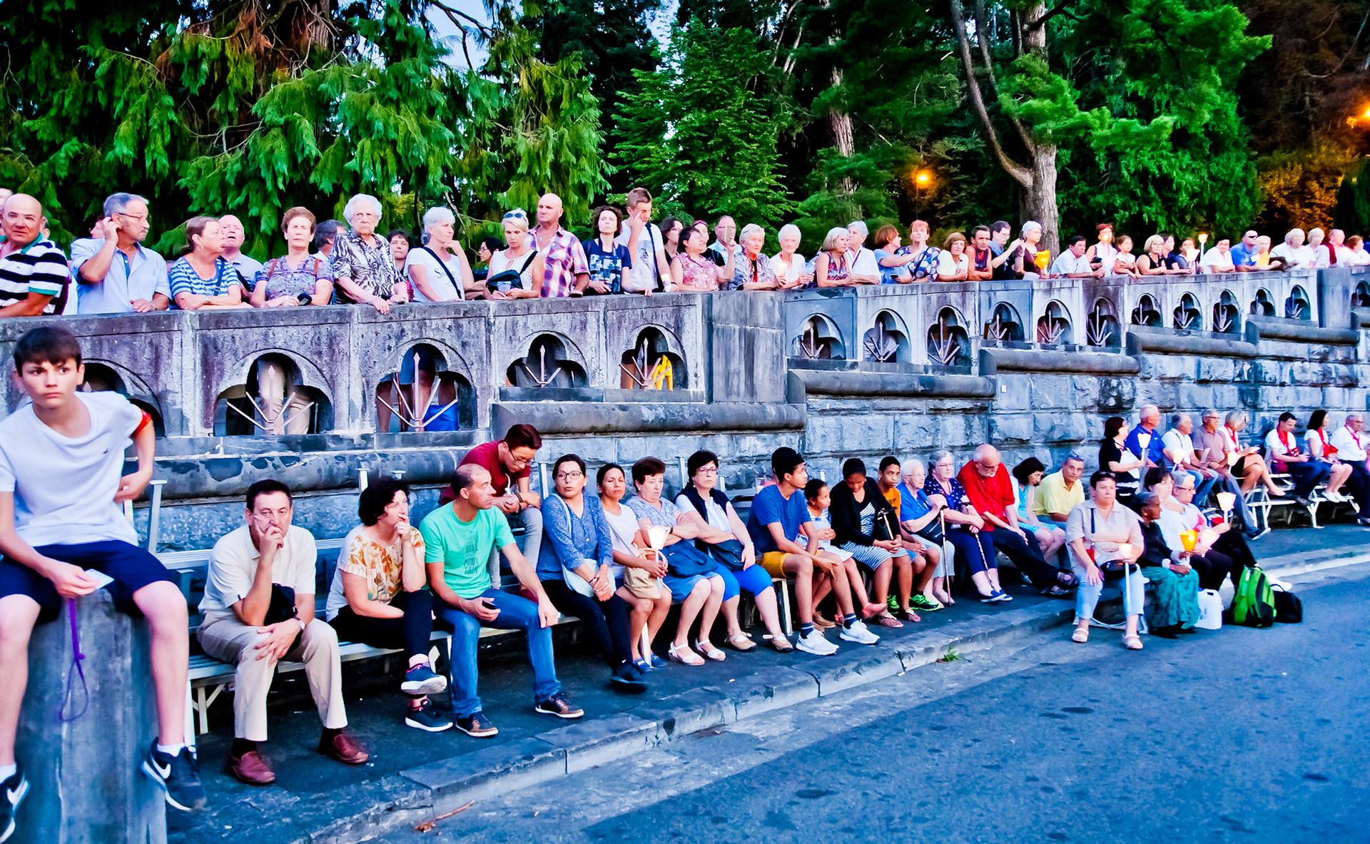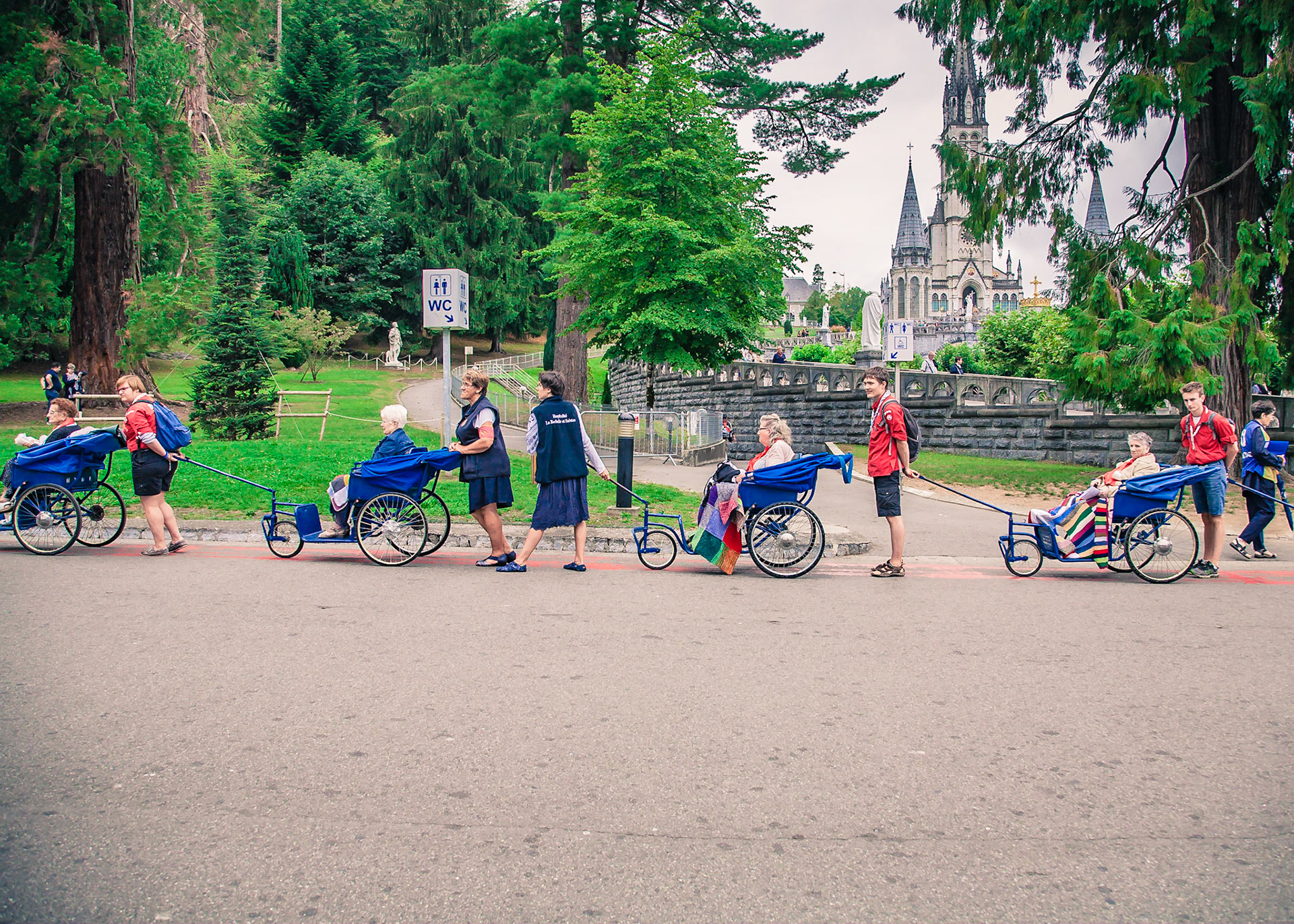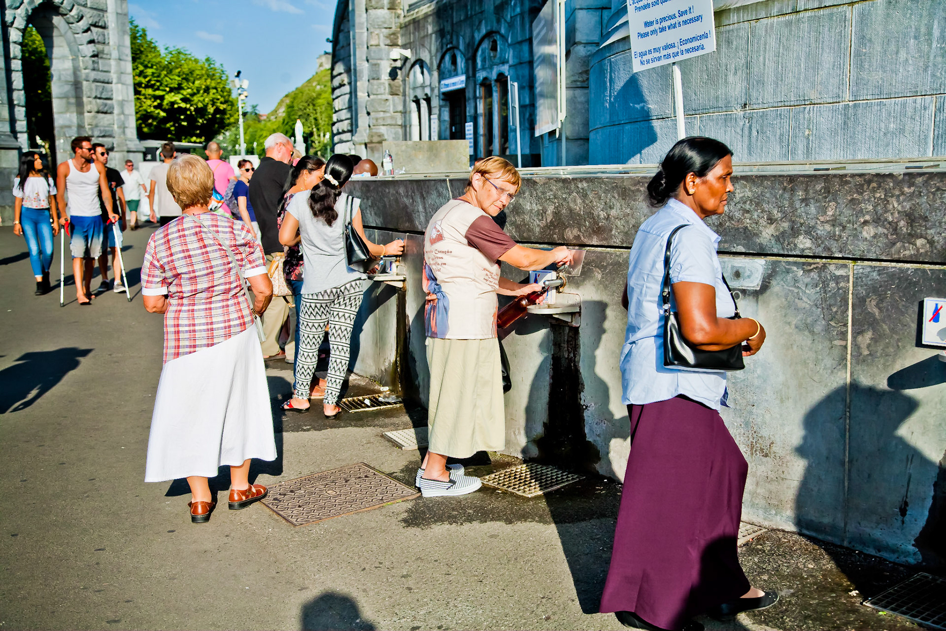 A candid view of pilgrims at Lourdes, their devotion to the Catholic faith. The sick come from all over the world in hope of a cure. The atmosphere around the town and in the Grotto of Massabielle (Grotto of the Apparitions) is peaceful and where in 1858, the Virgin Mary is said to have appeared to a local woman. In the grotto, pilgrims can drink or bathe in water flowing from a spring.