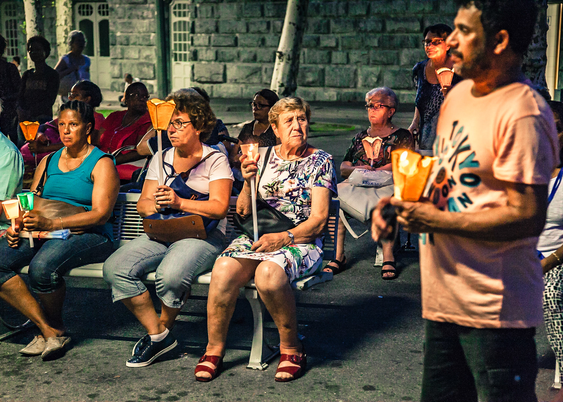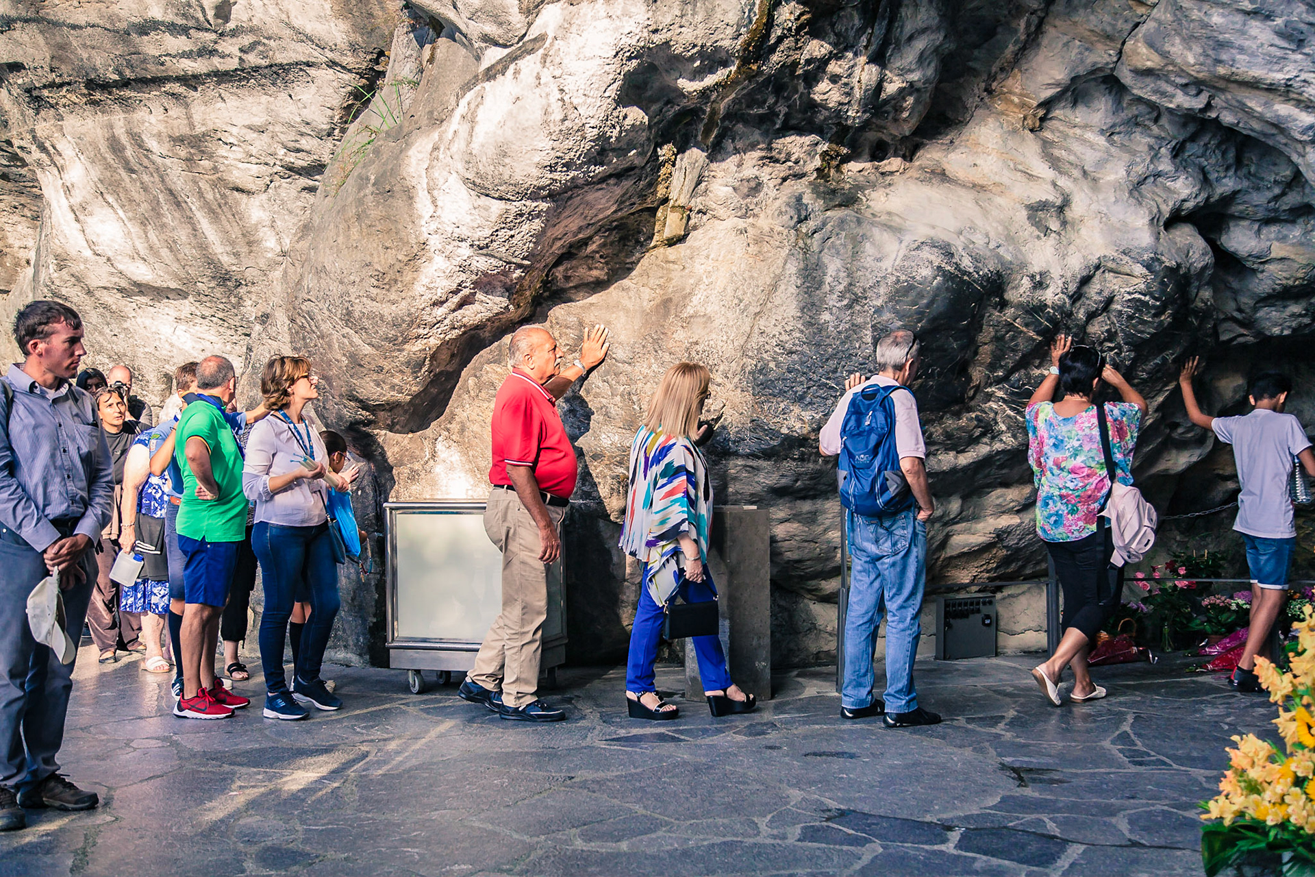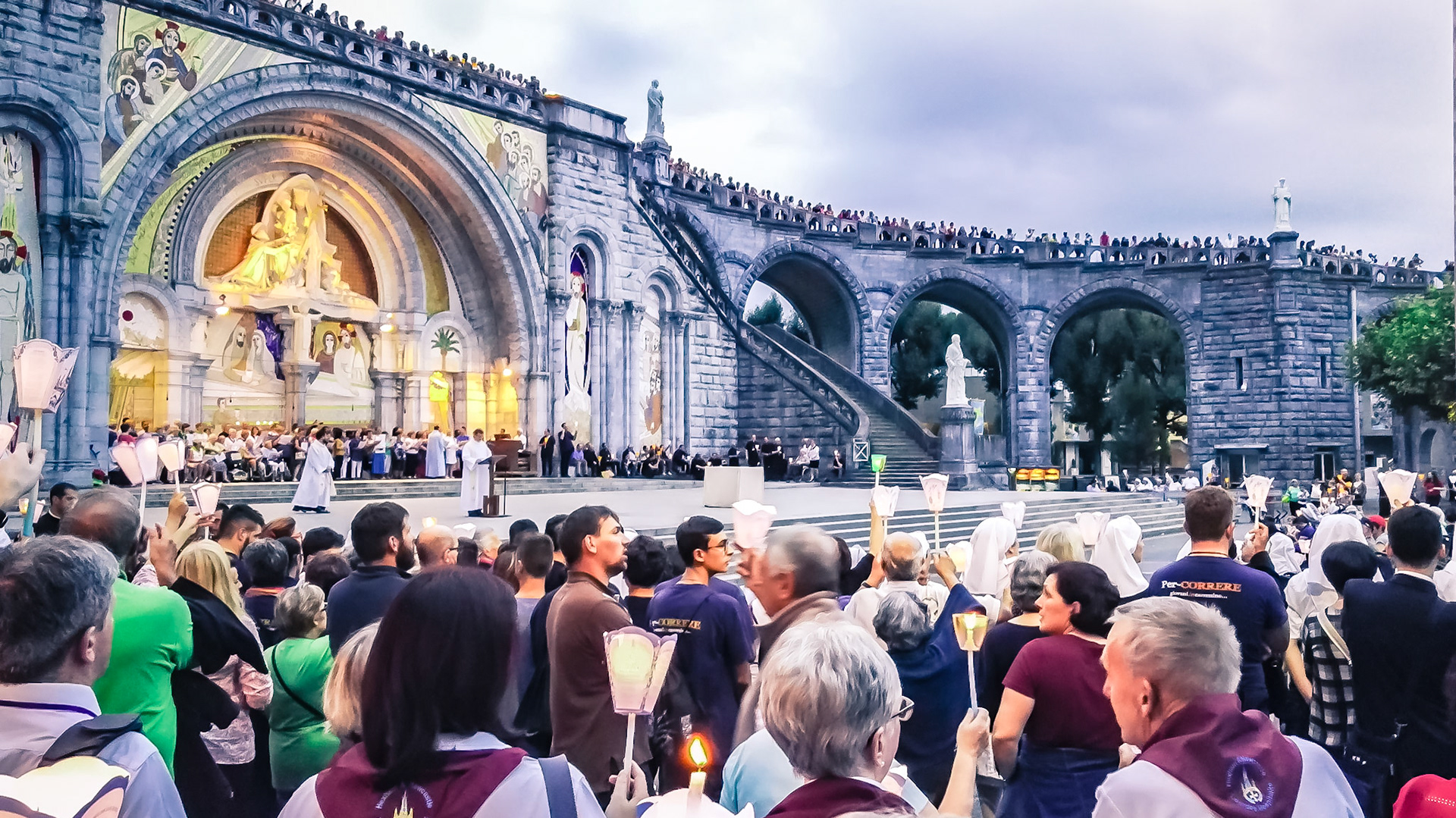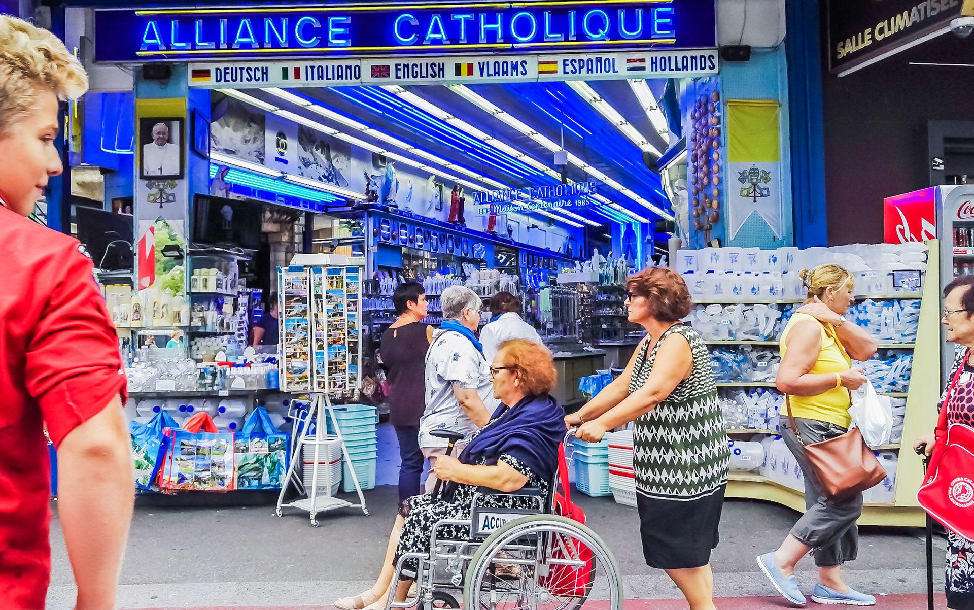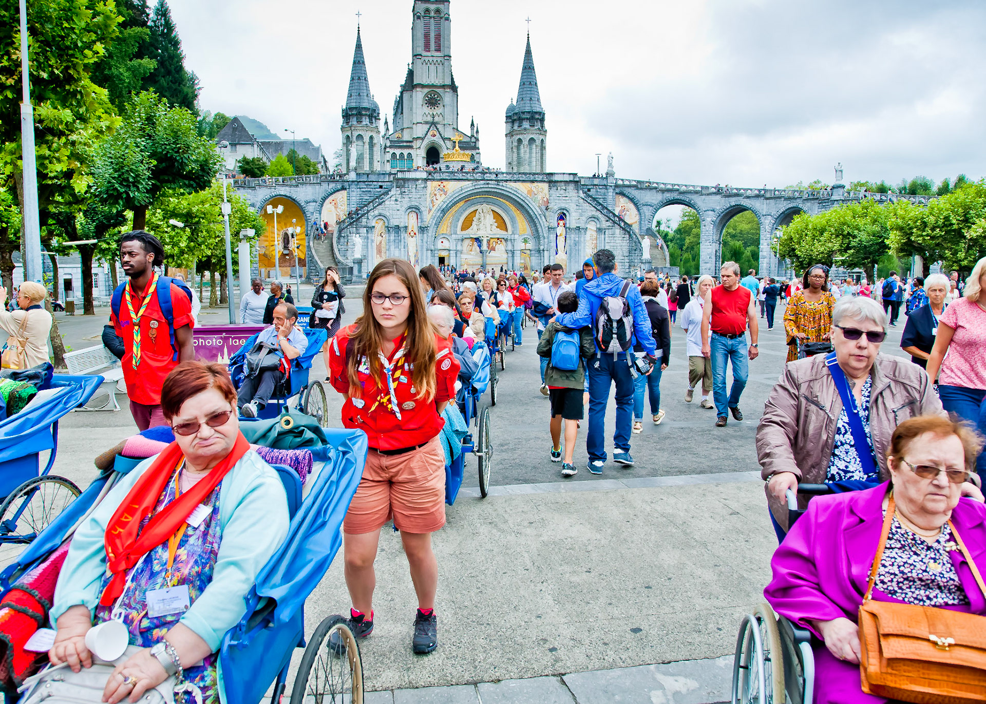 A candid view of pilgrims at Lourdes, their devotion to the Catholic faith. The sick come from all over the world in hope of a cure. The atmosphere around the town and in the Grotto of Massabielle (Grotto of the Apparitions) is peaceful and where in 1858, the Virgin Mary is said to have appeared to a local woman. In the grotto, pilgrims can drink or bathe in water flowing from a spring.