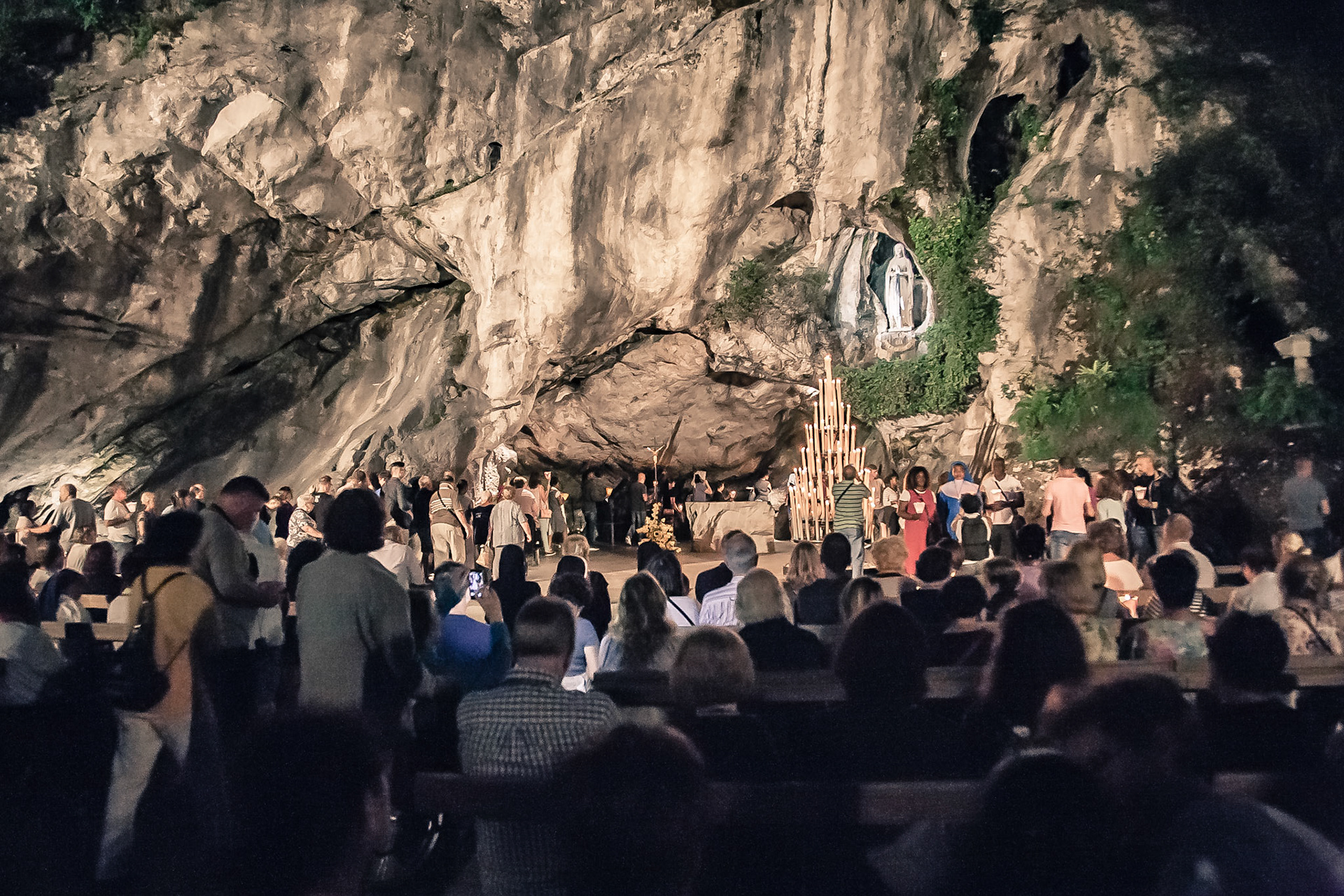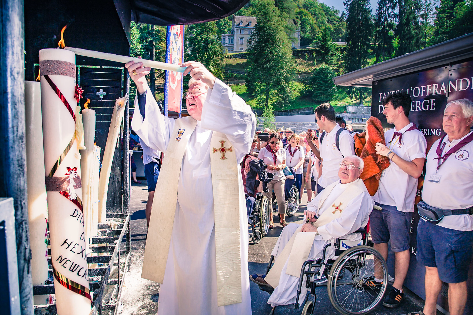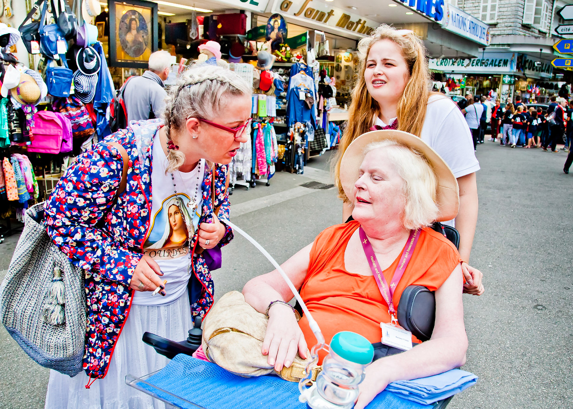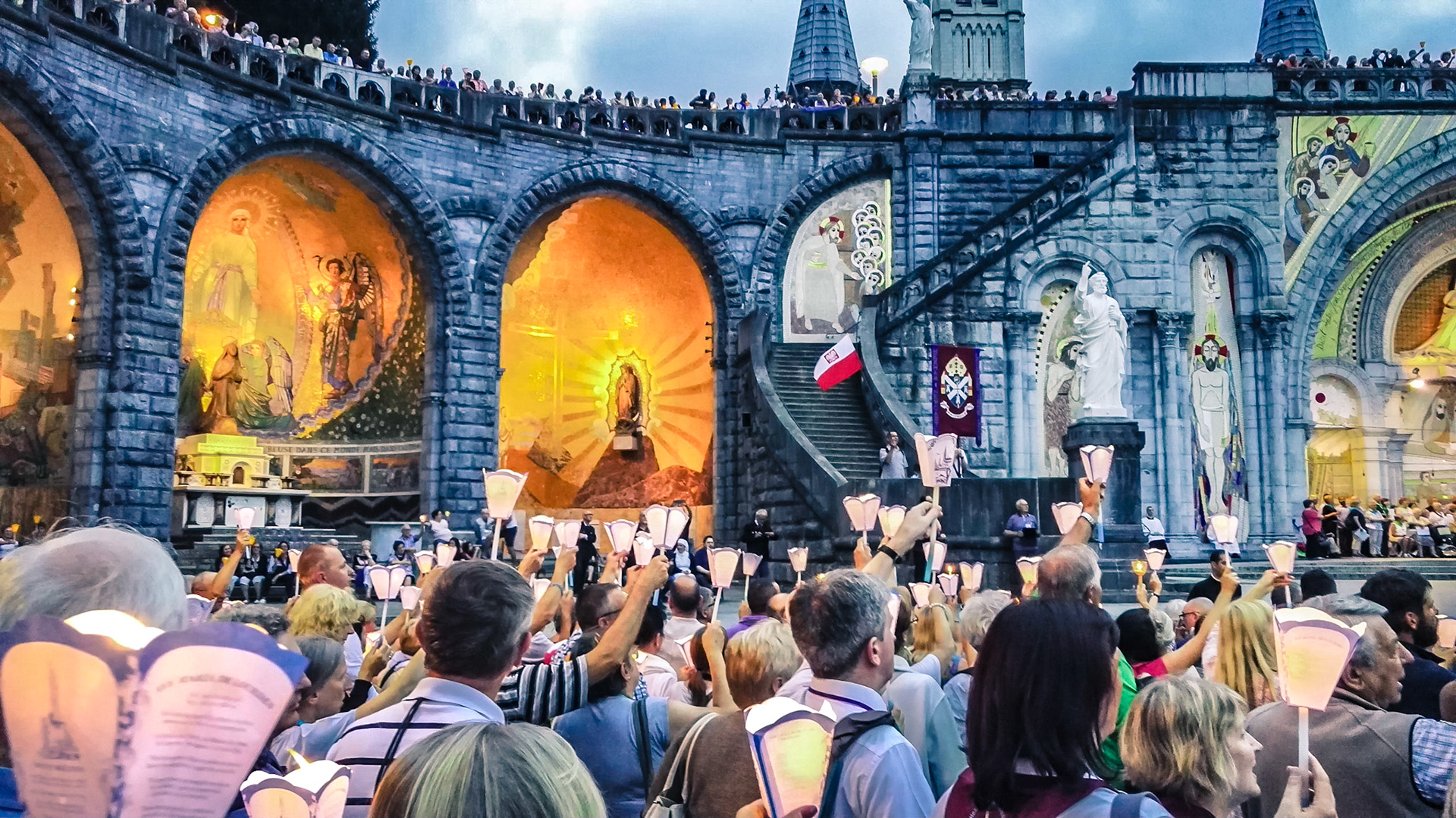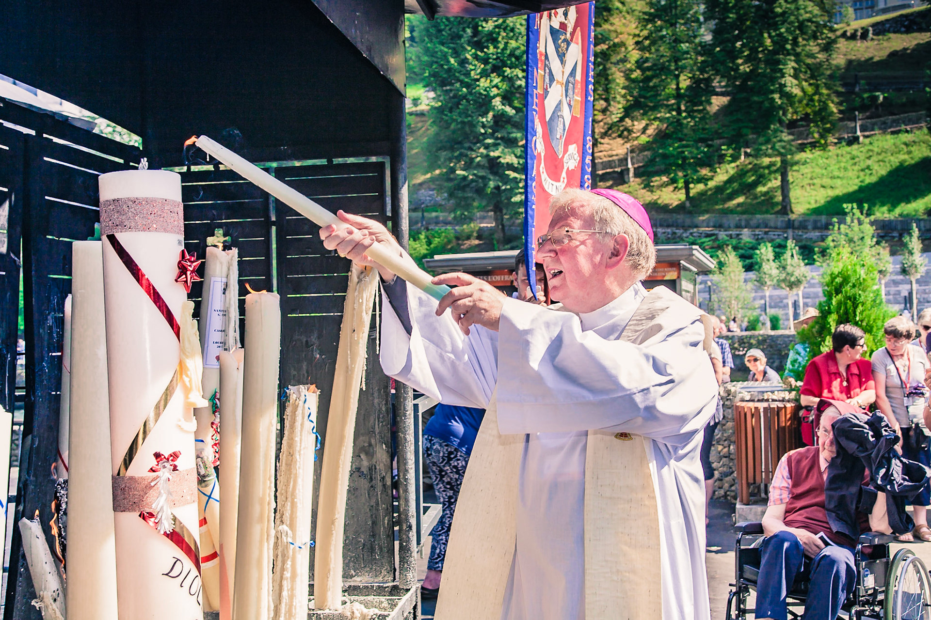 A candid view of pilgrims at Lourdes, their devotion to the Catholic faith. The sick come from all over the world in hope of a cure. The atmosphere around the town and in the Grotto of Massabielle (Grotto of the Apparitions) is peaceful and where in 1858, the Virgin Mary is said to have appeared to a local woman. In the grotto, pilgrims can drink or bathe in water flowing from a spring.