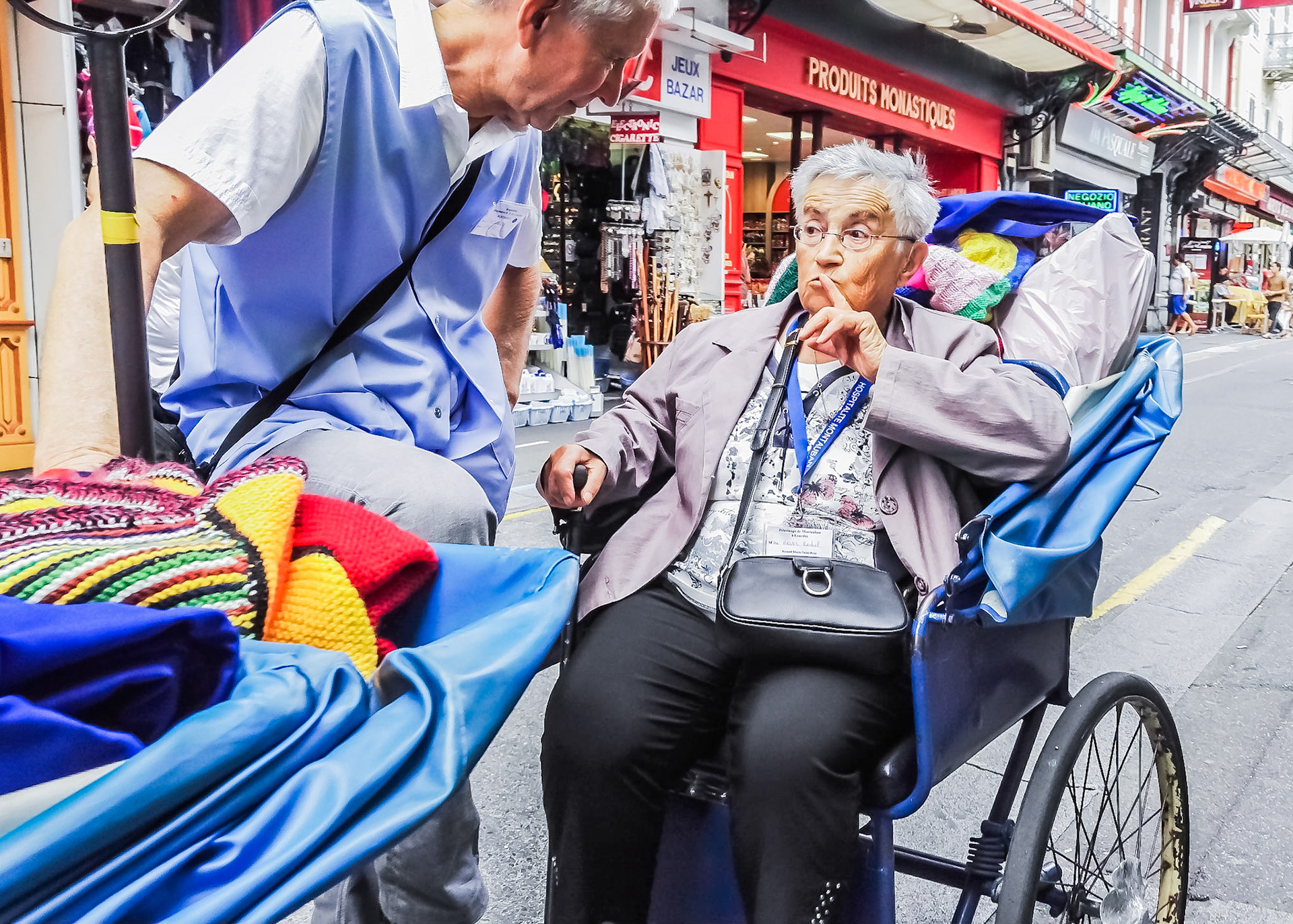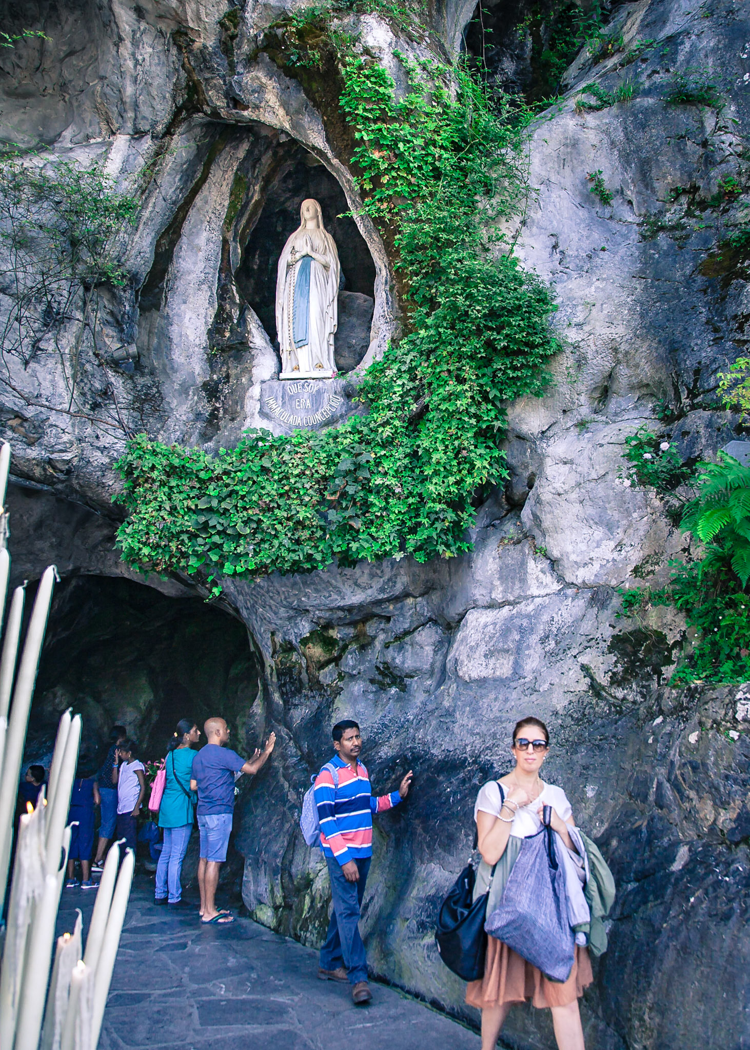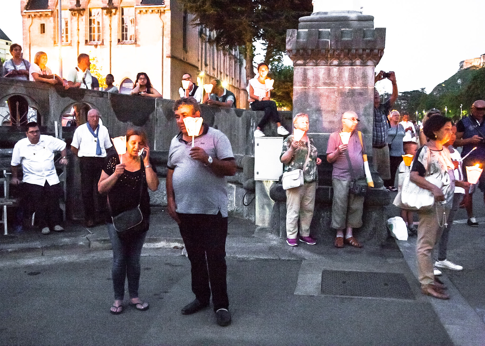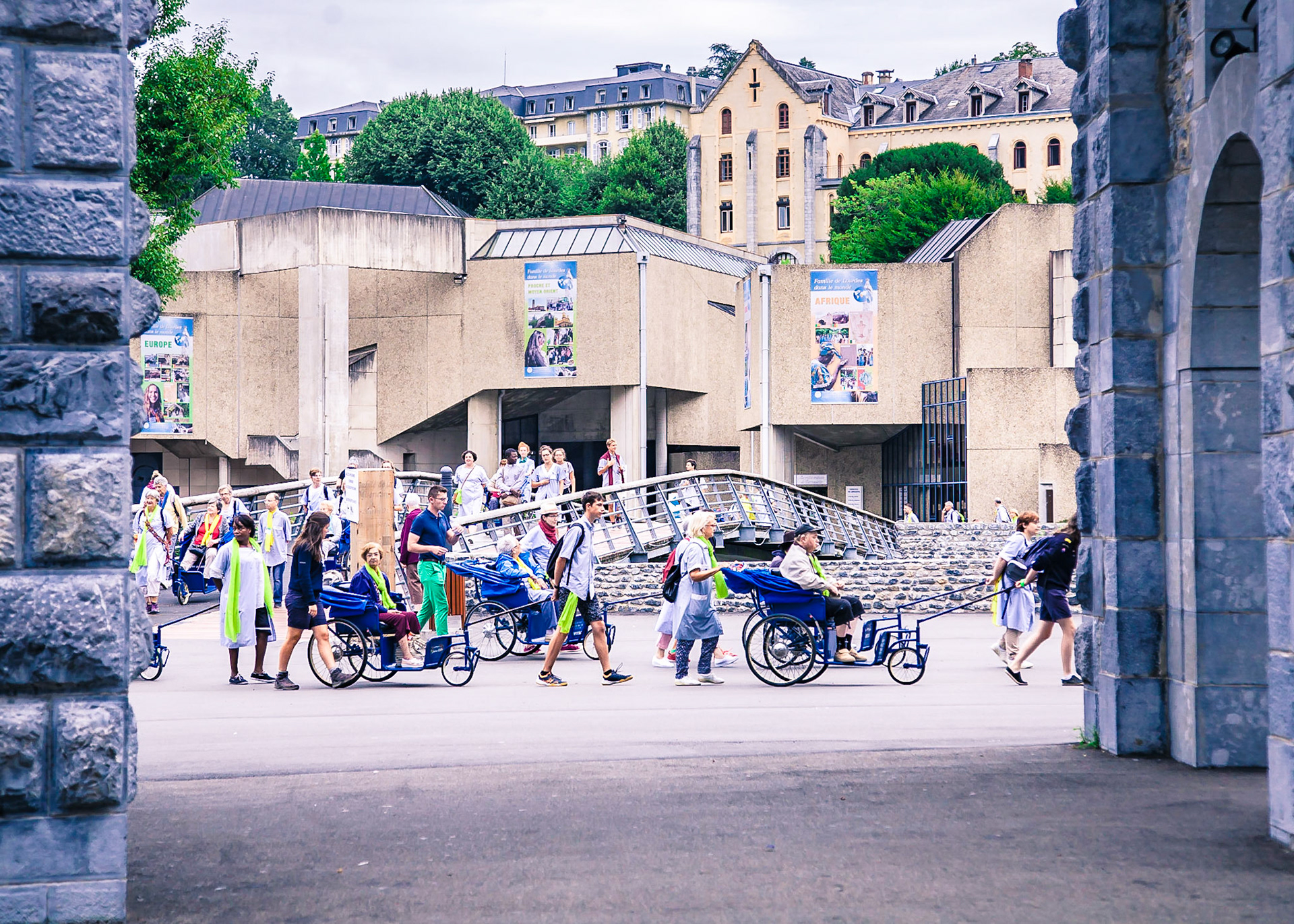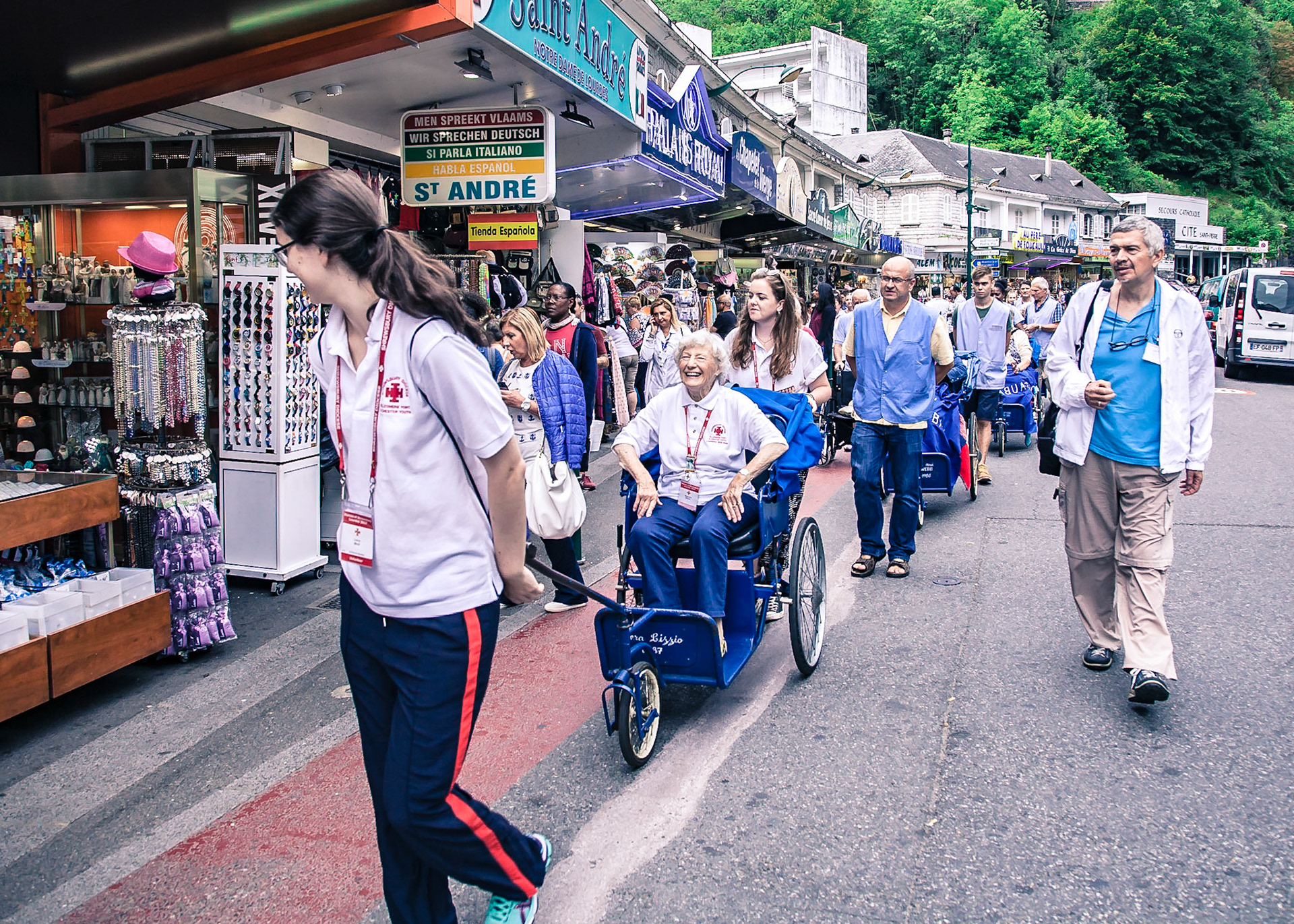 A candid view of pilgrims at Lourdes, their devotion to the Catholic faith. The sick come from all over the world in hope of a cure. The atmosphere around the town and in the Grotto of Massabielle (Grotto of the Apparitions) is peaceful and where in 1858, the Virgin Mary is said to have appeared to a local woman. In the grotto, pilgrims can drink or bathe in water flowing from a spring.