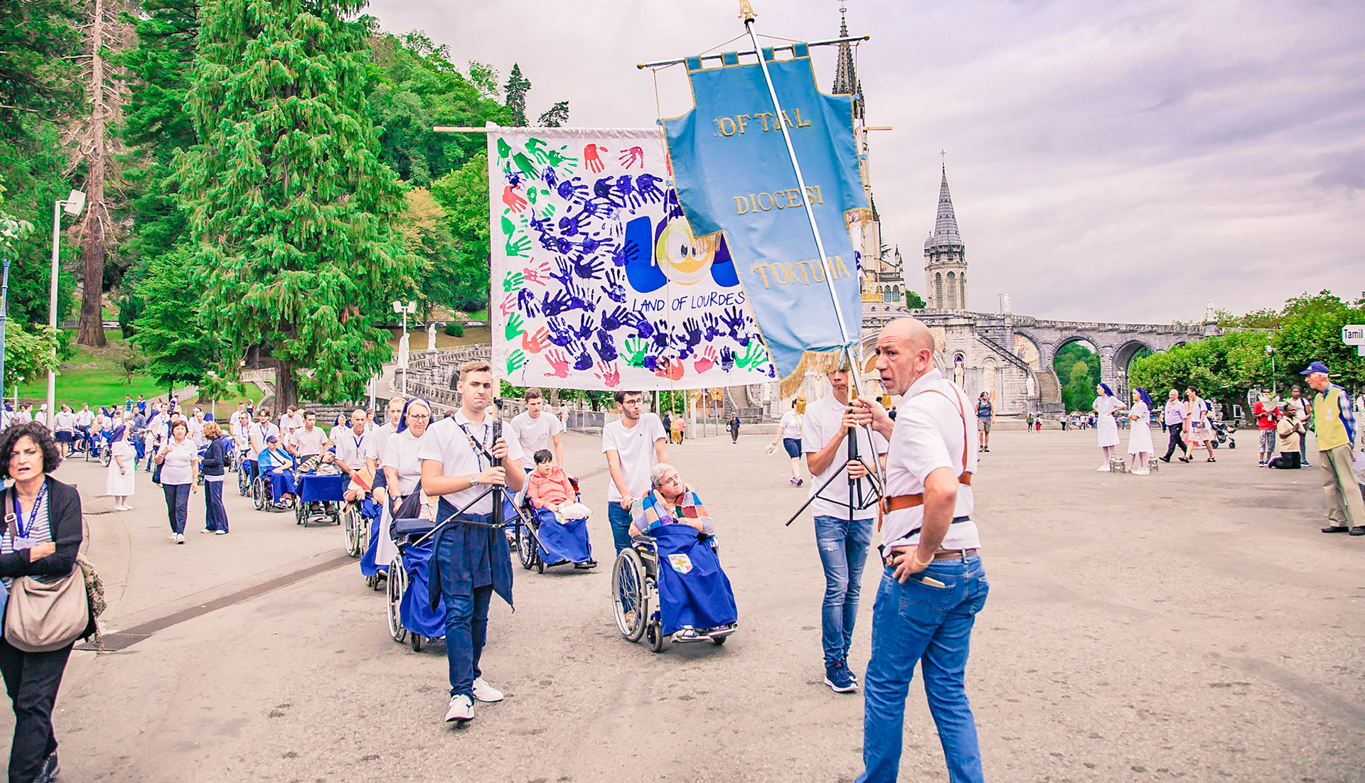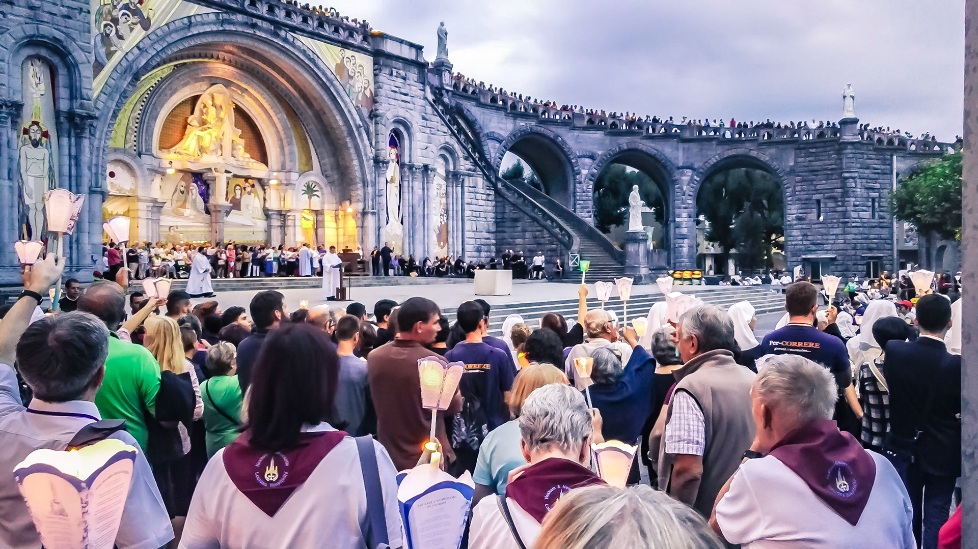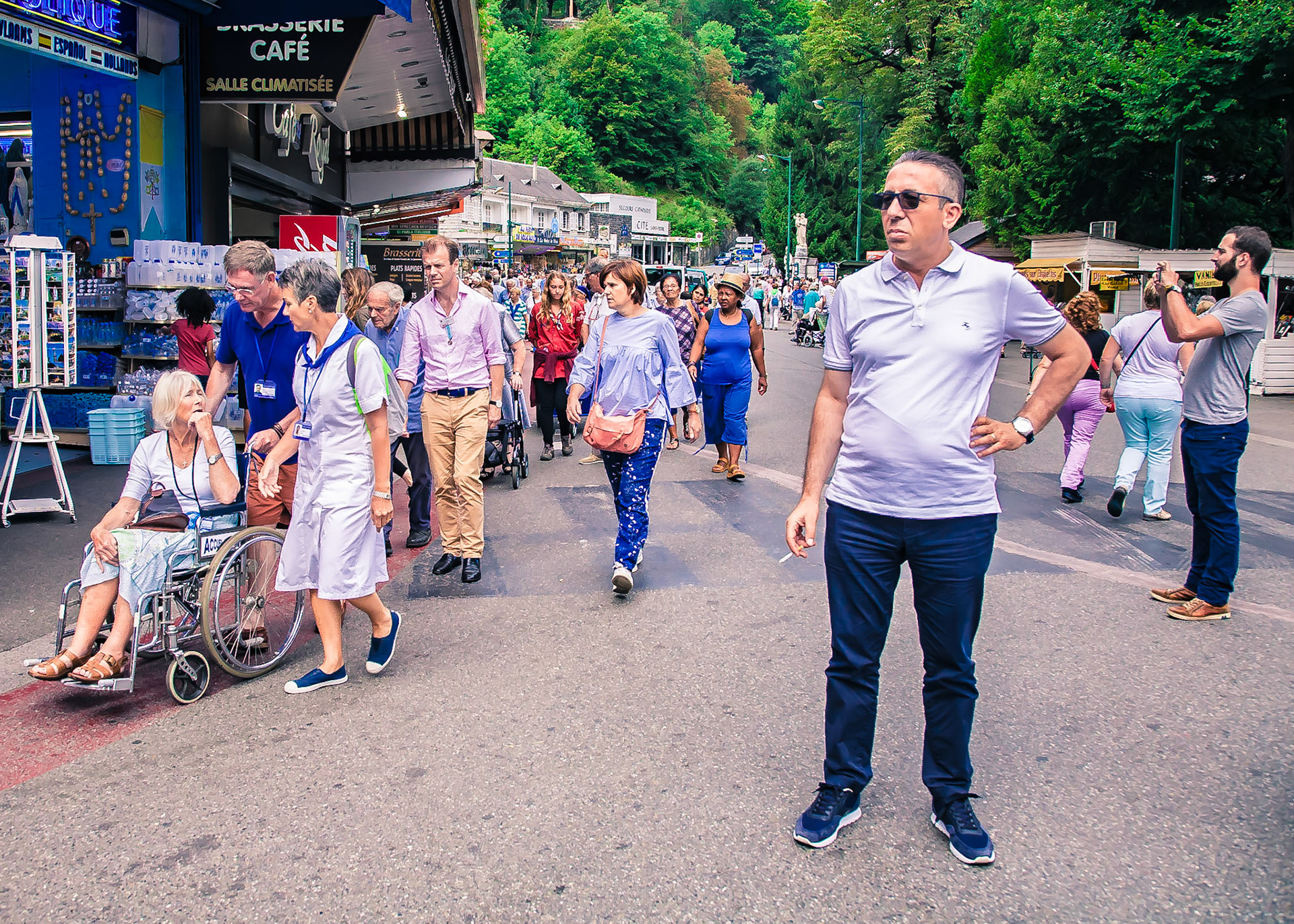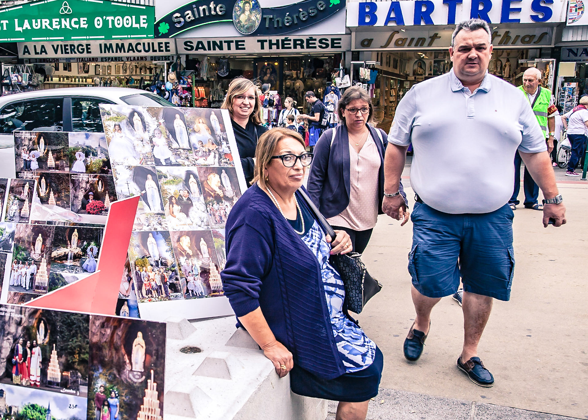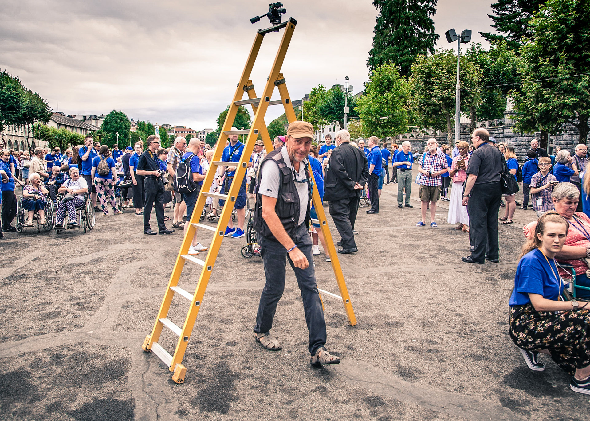 A candid view of pilgrims at Lourdes, their devotion to the Catholic faith. The sick come from all over the world in hope of a cure. The atmosphere around the town and in the Grotto of Massabielle (Grotto of the Apparitions) is peaceful and where in 1858, the Virgin Mary is said to have appeared to a local woman. In the grotto, pilgrims can drink or bathe in water flowing from a spring.