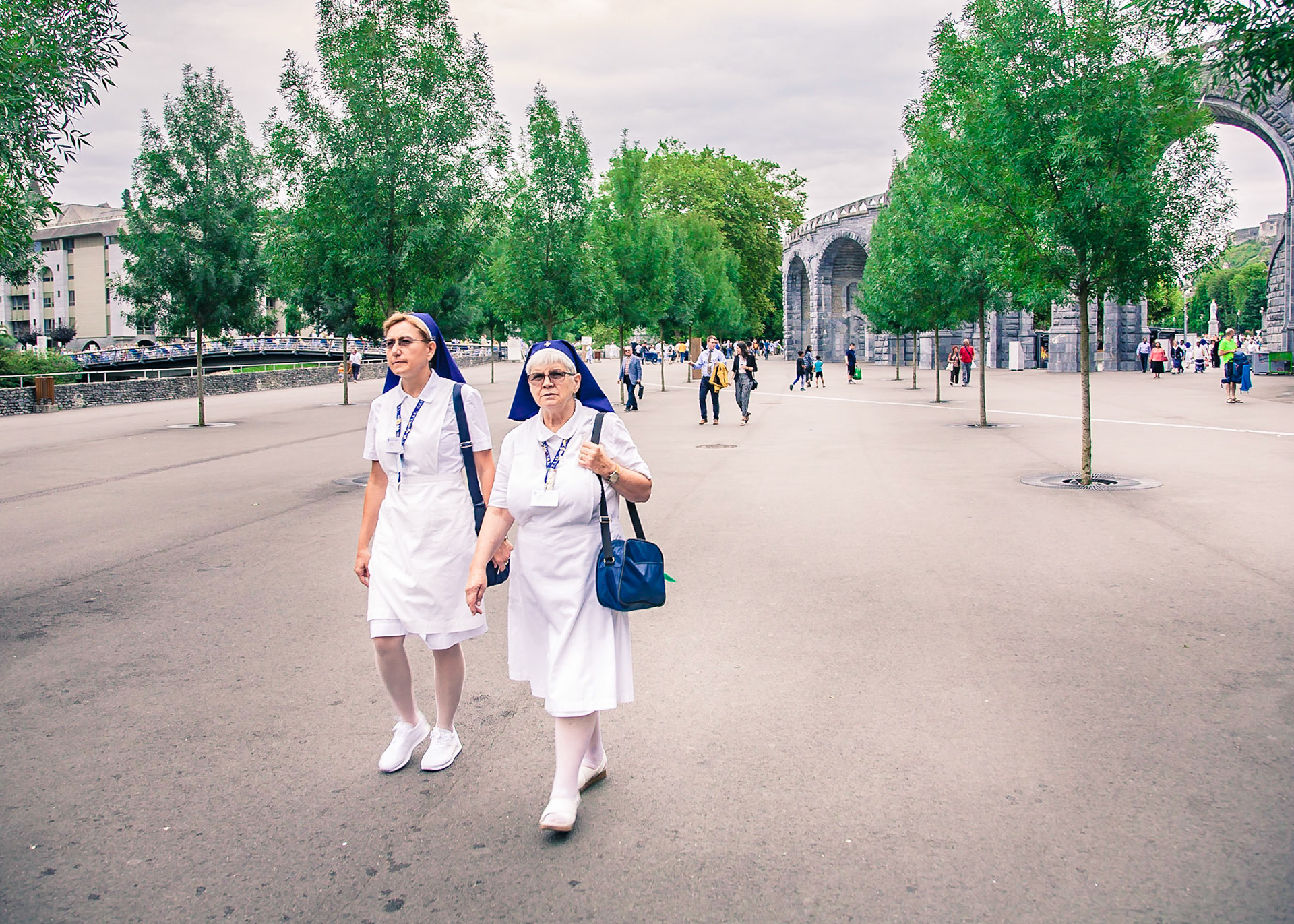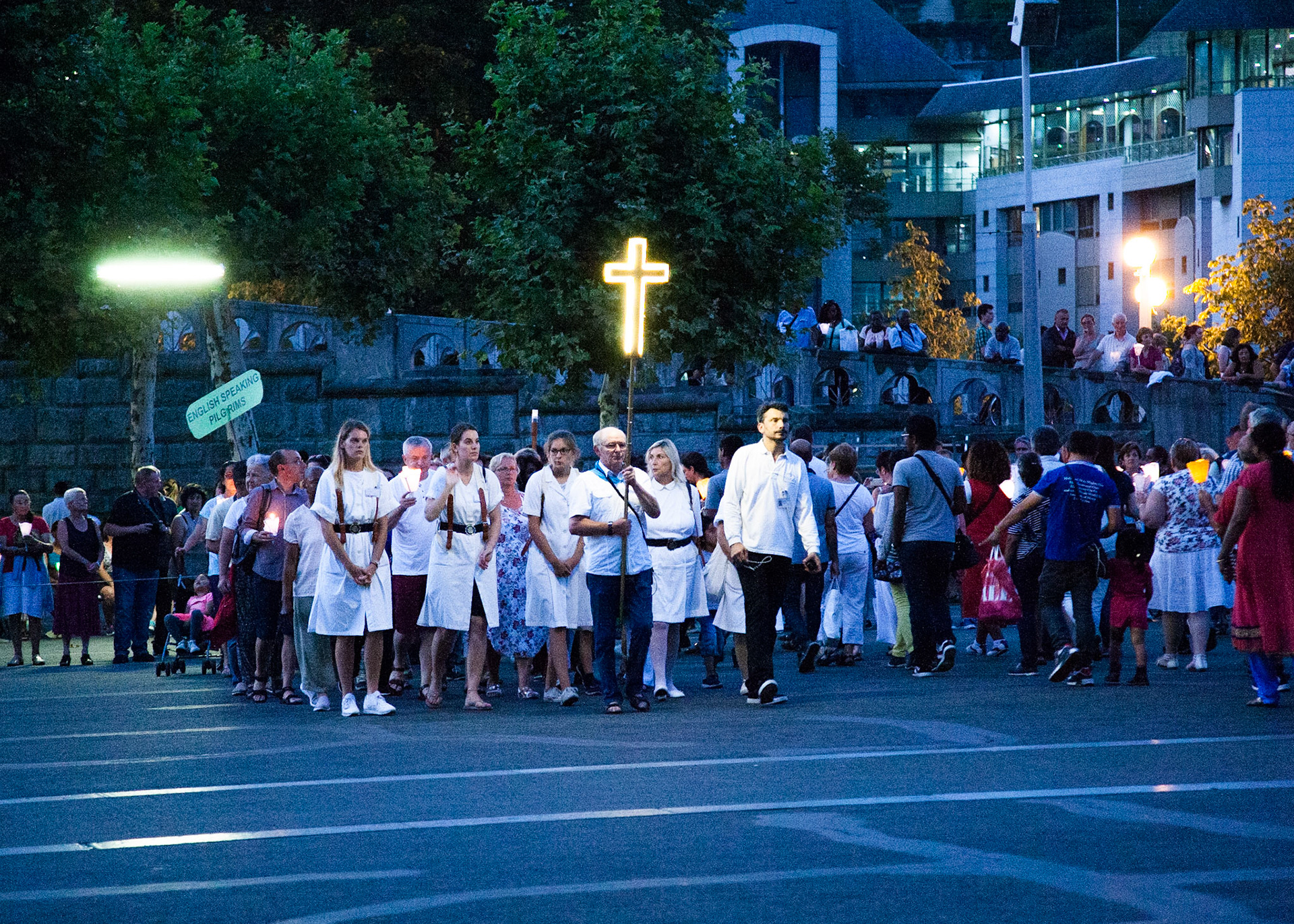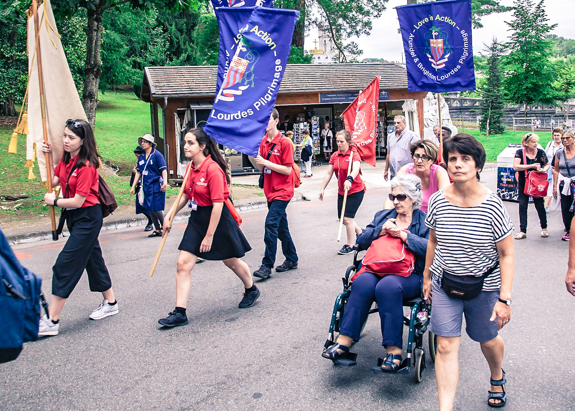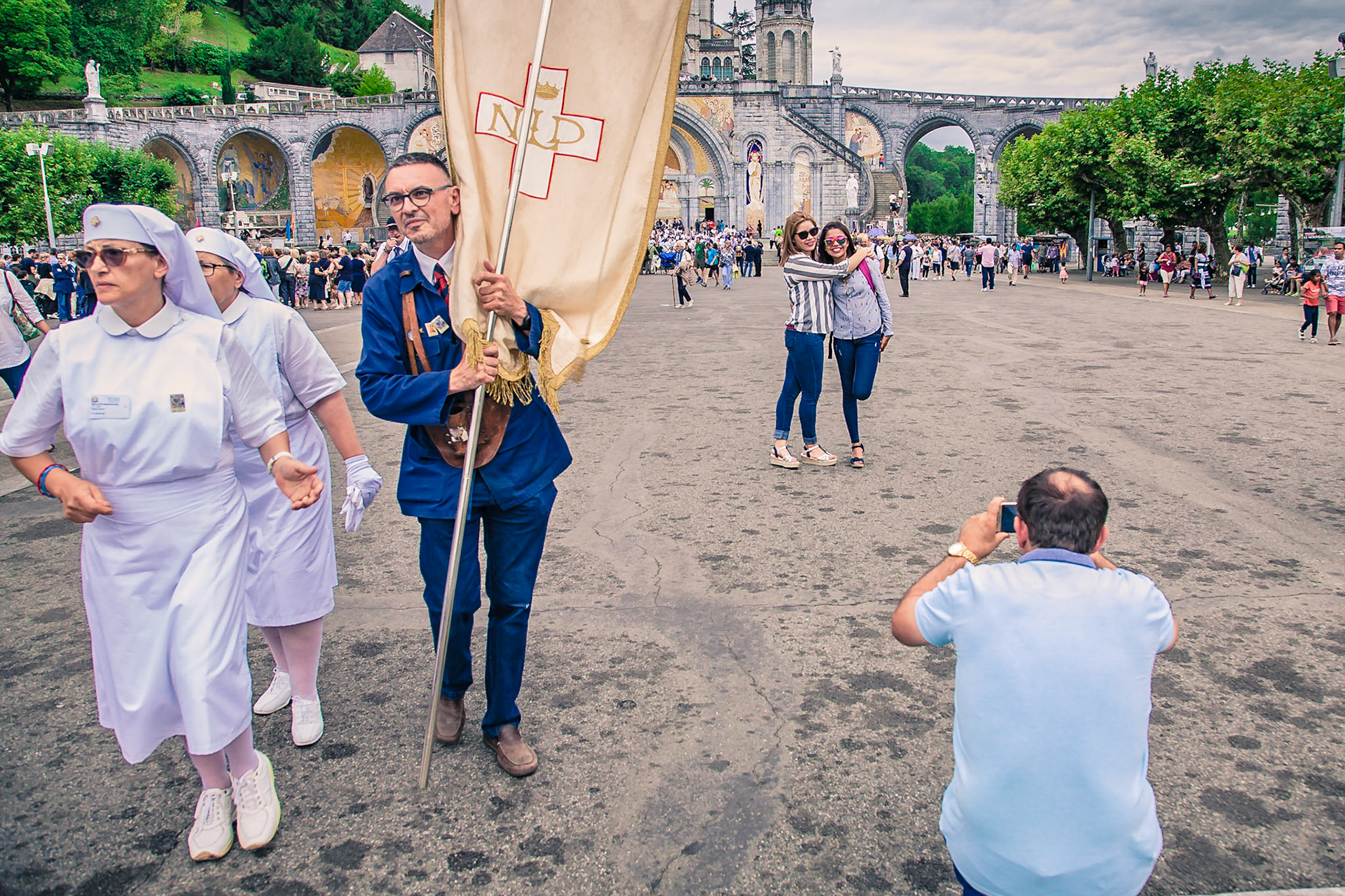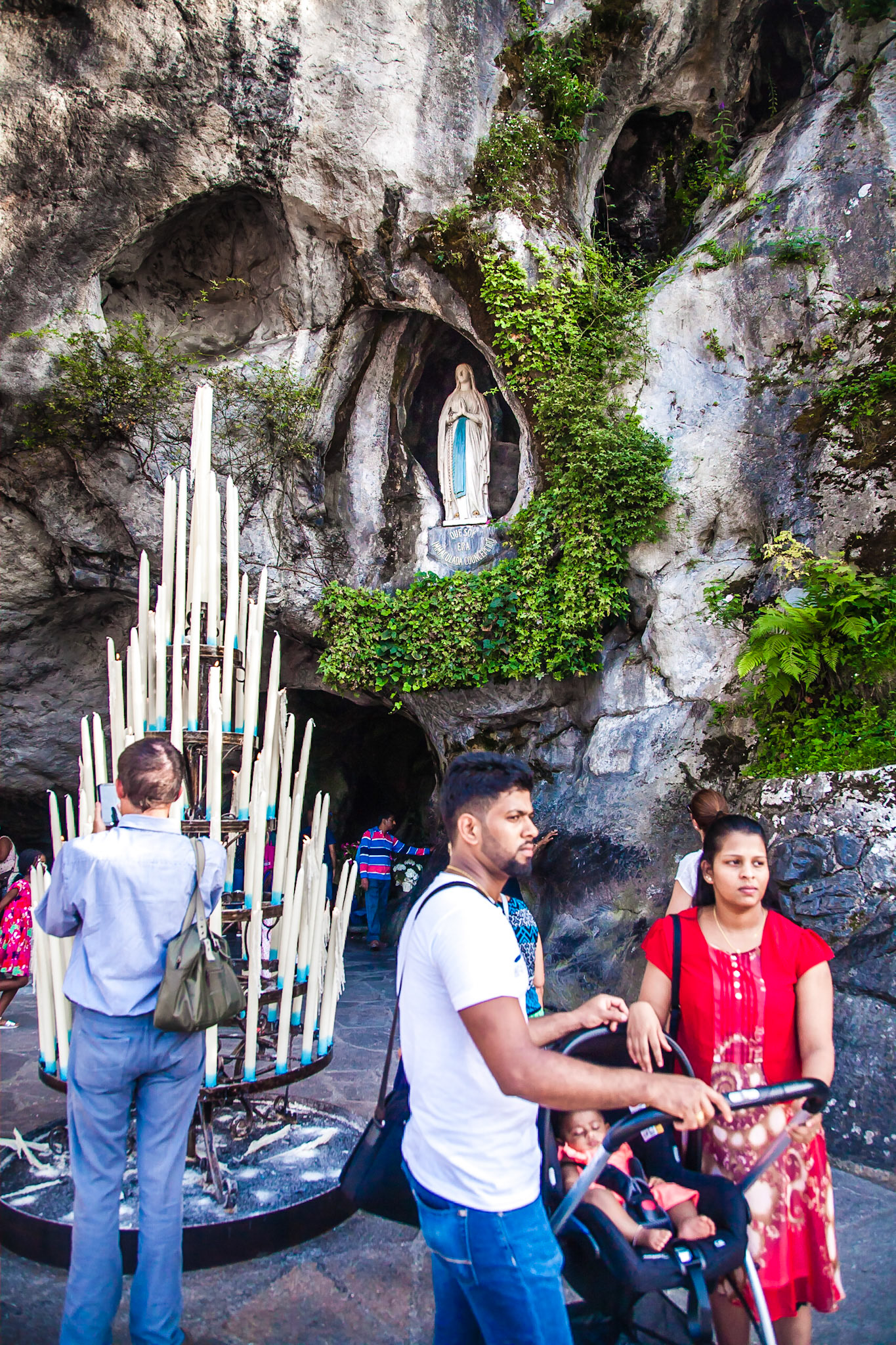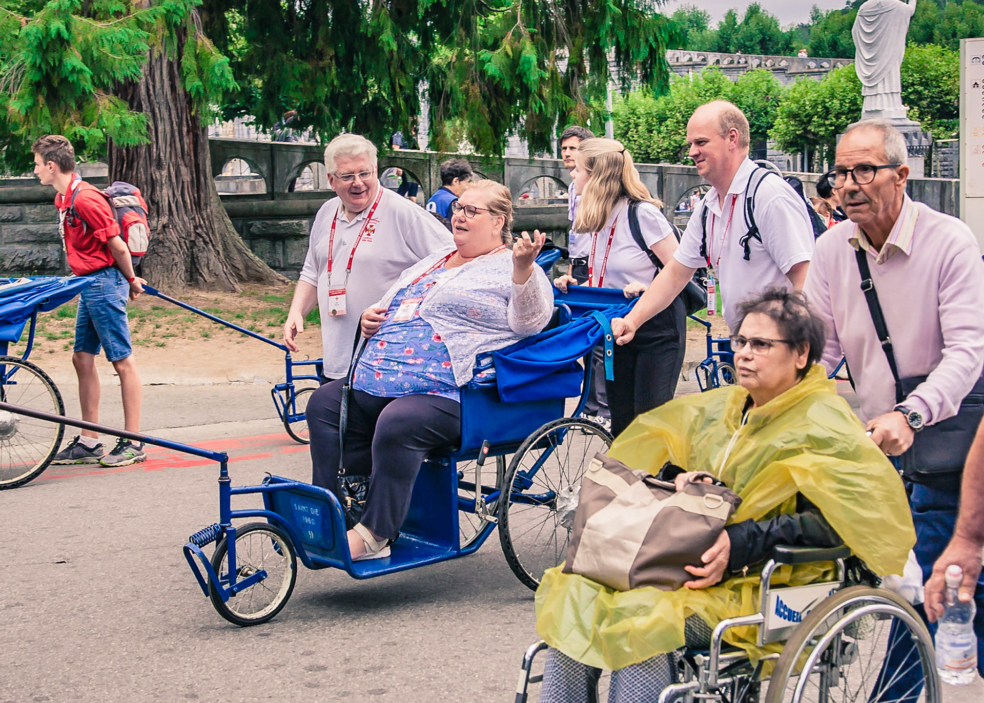 A candid view of pilgrims at Lourdes, their devotion to the Catholic faith. The sick come from all over the world in hope of a cure. The atmosphere around the town and in the Grotto of Massabielle (Grotto of the Apparitions) is peaceful and where in 1858, the Virgin Mary is said to have appeared to a local woman. In the grotto, pilgrims can drink or bathe in water flowing from a spring.