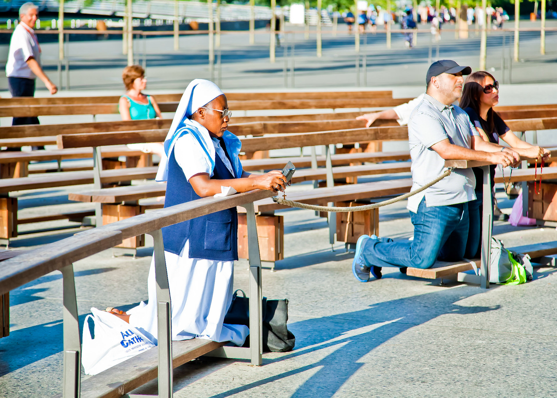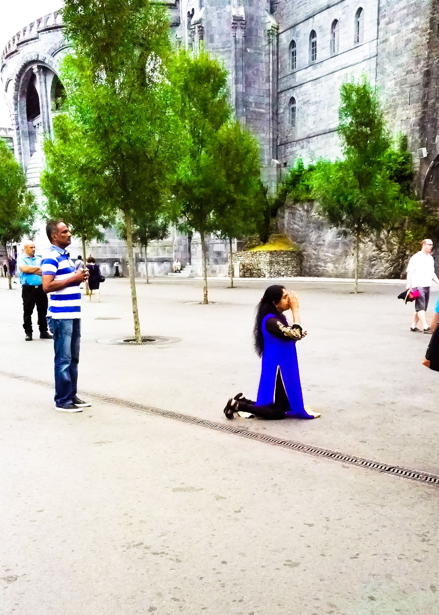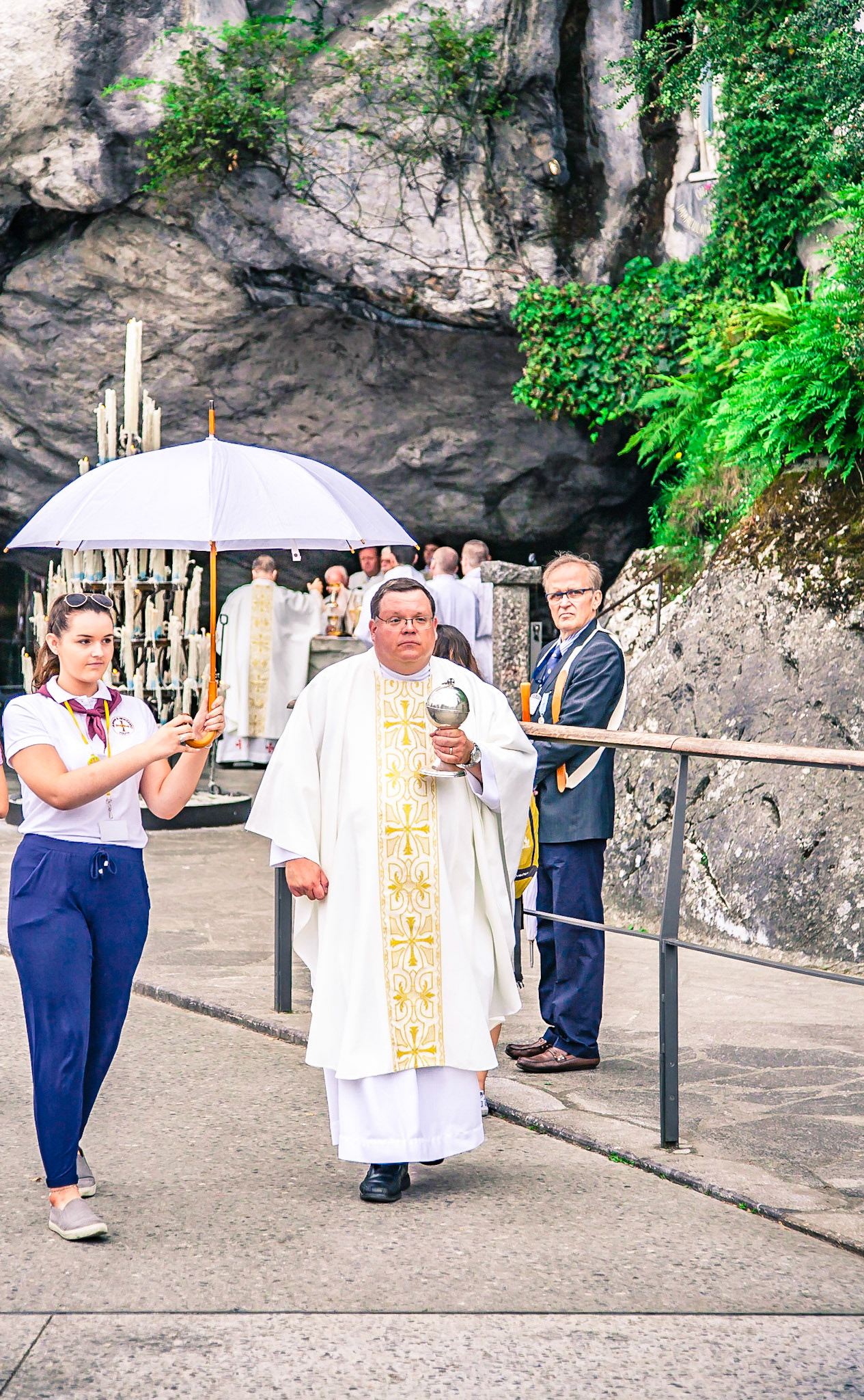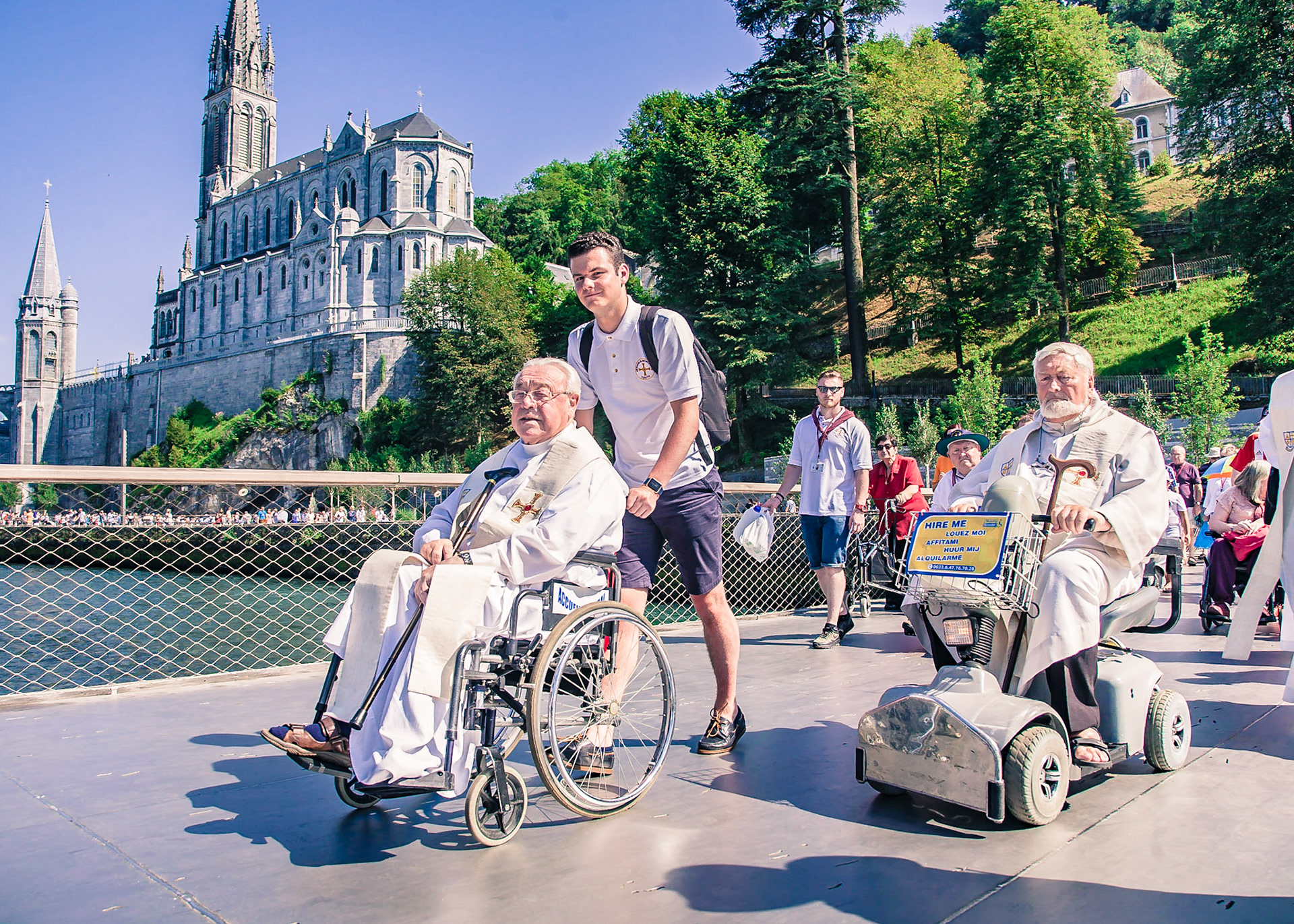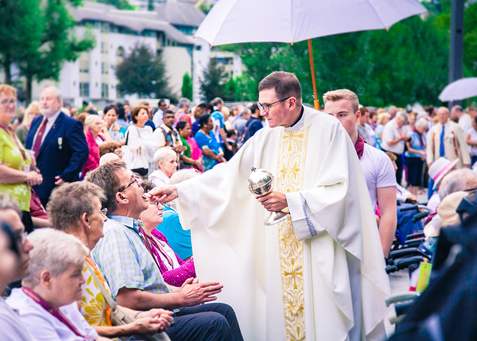 A candid view of pilgrims at Lourdes, their devotion to the Catholic faith. The sick come from all over the world in hope of a cure. The atmosphere around the town and in the Grotto of Massabielle (Grotto of the Apparitions) is peaceful and where in 1858, the Virgin Mary is said to have appeared to a local woman. In the grotto, pilgrims can drink or bathe in water flowing from a spring.