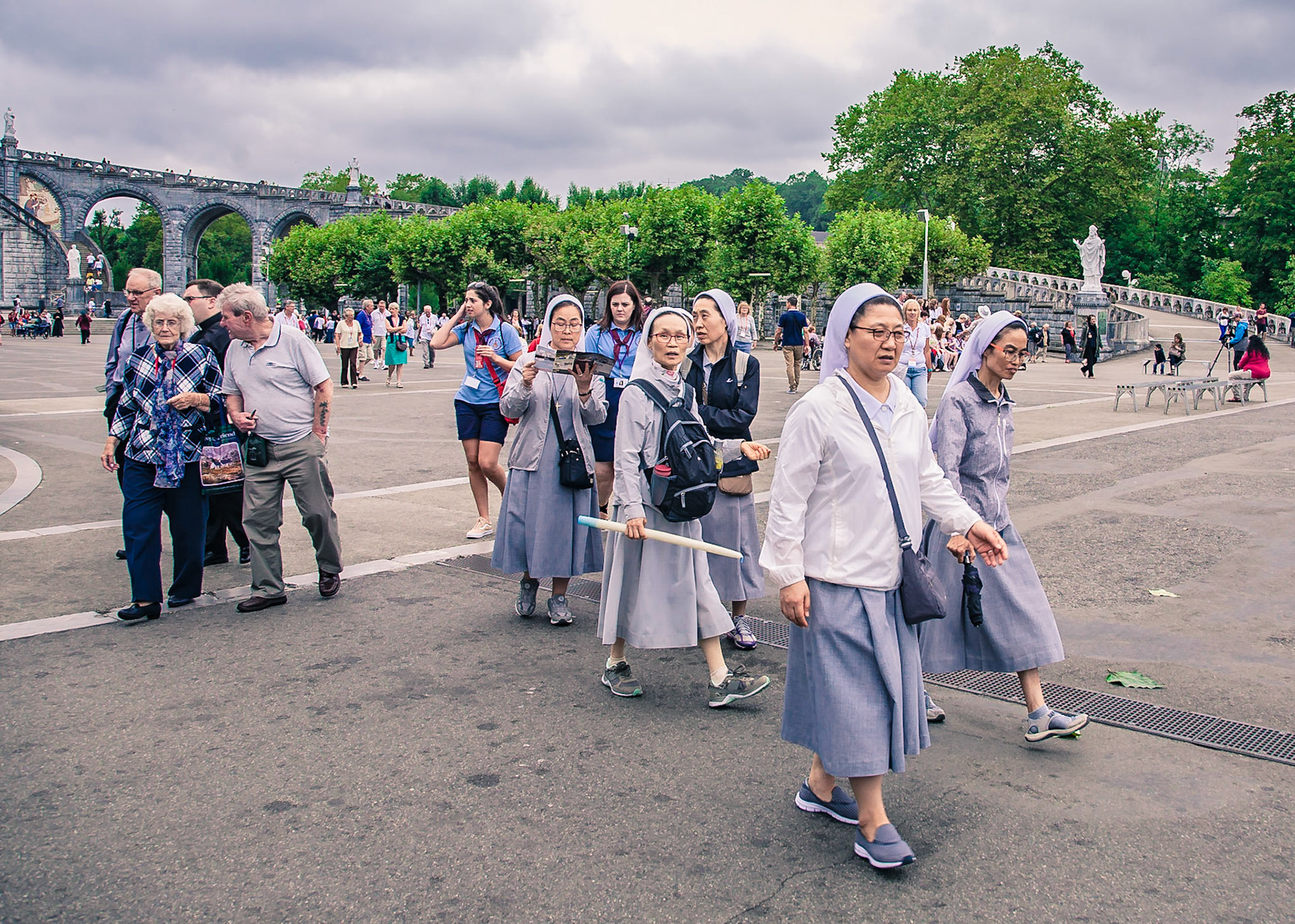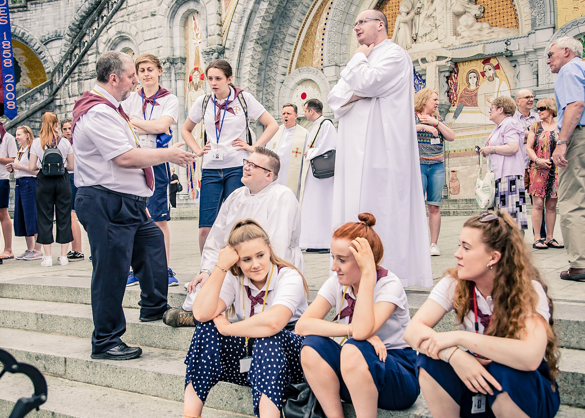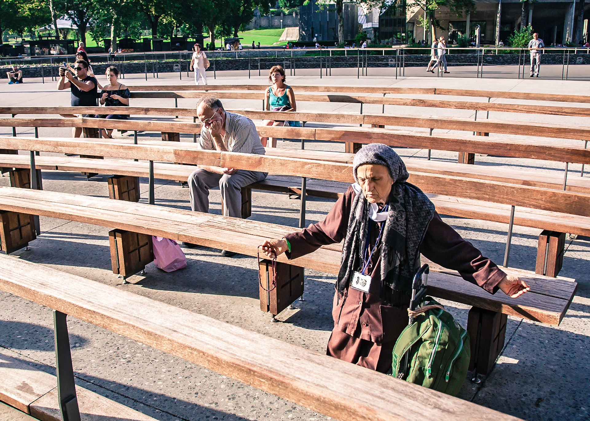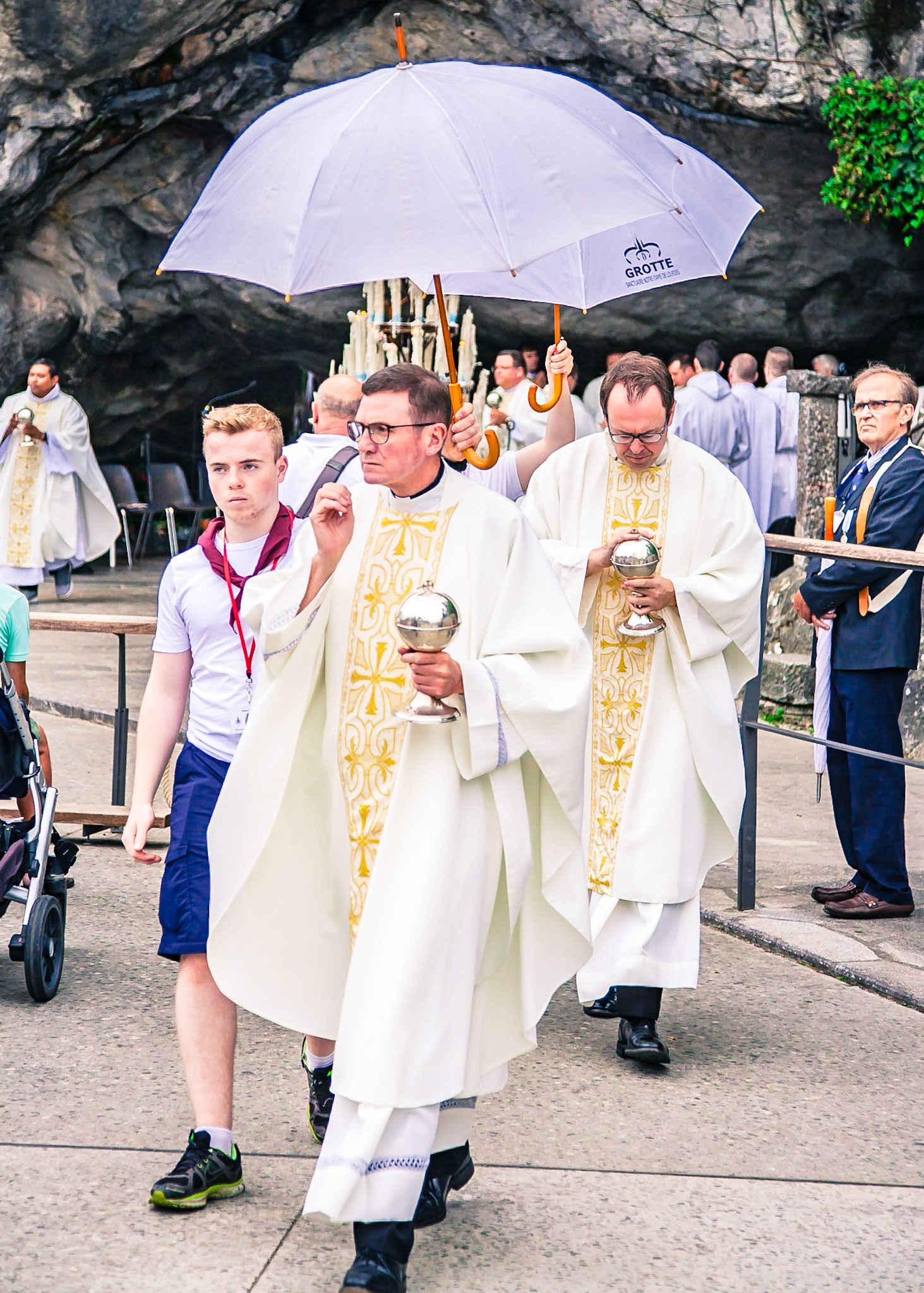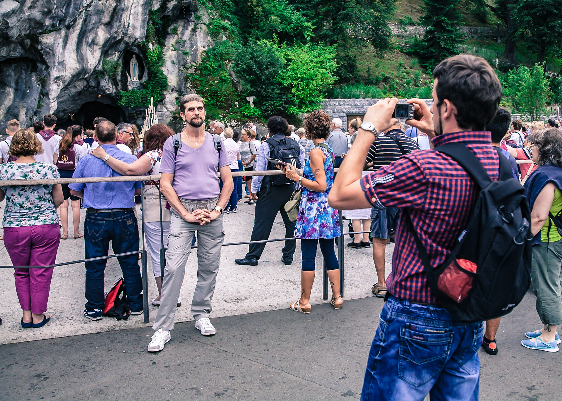 A candid view of pilgrims at Lourdes, their devotion to the Catholic faith. The sick come from all over the world in hope of a cure. The atmosphere around the town and in the Grotto of Massabielle (Grotto of the Apparitions) is peaceful and where in 1858, the Virgin Mary is said to have appeared to a local woman. In the grotto, pilgrims can drink or bathe in water flowing from a spring.