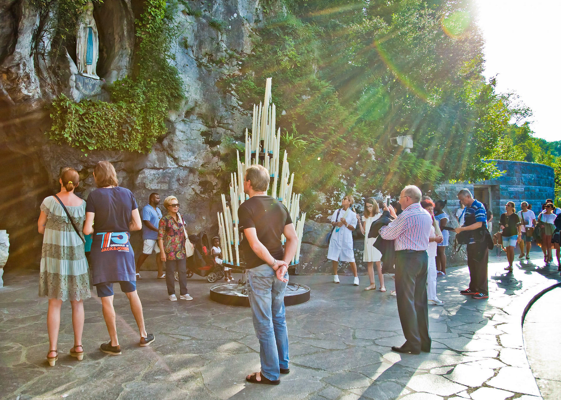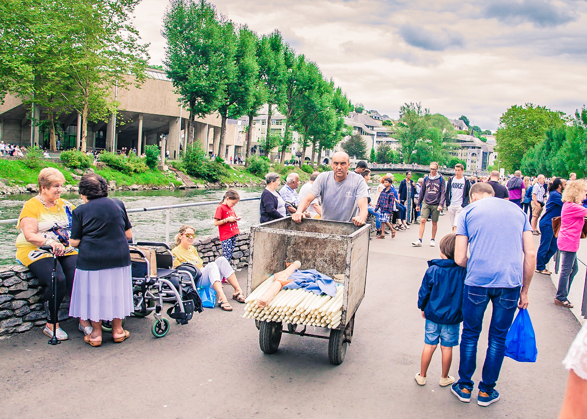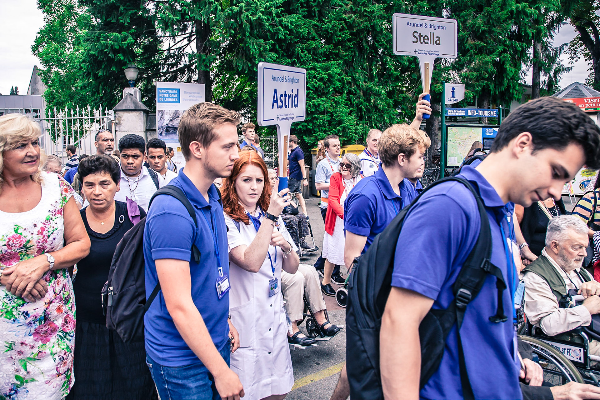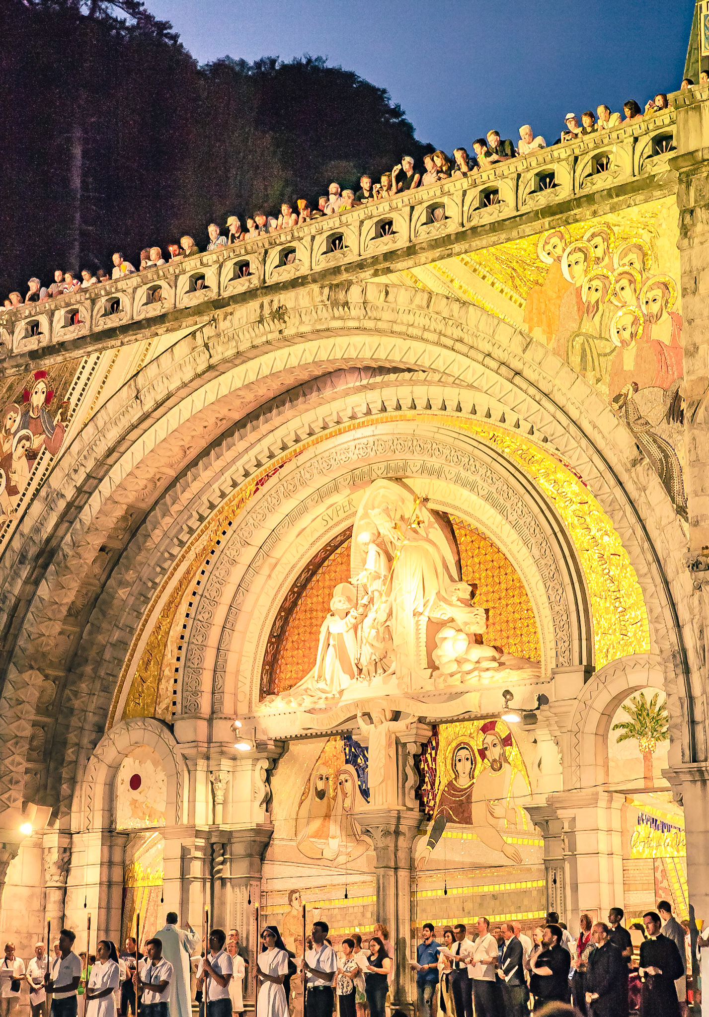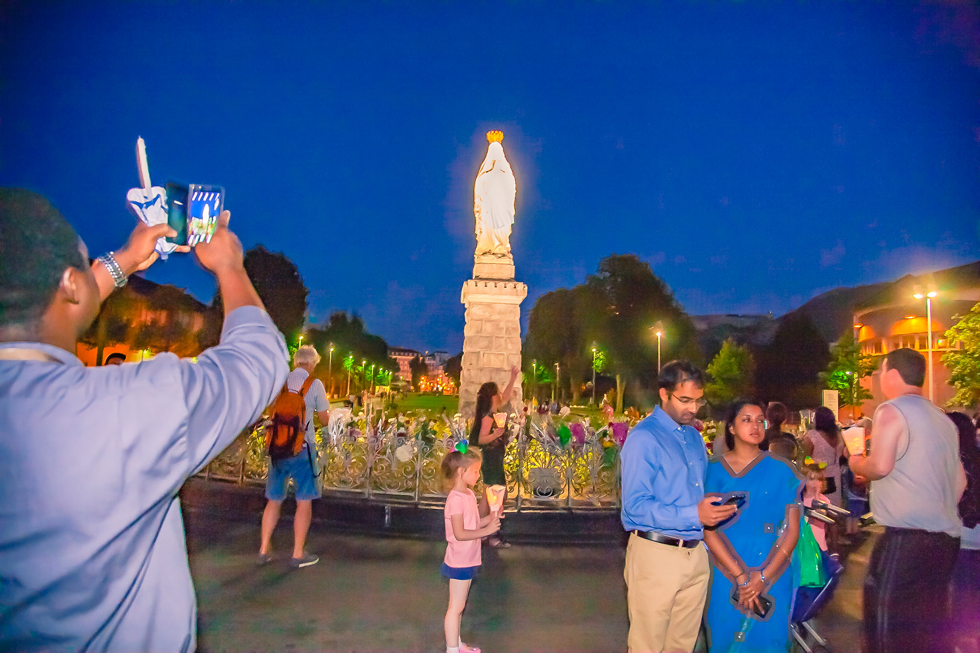 A candid view of pilgrims at Lourdes, their devotion to the Catholic faith. The sick come from all over the world in hope of a cure. The atmosphere around the town and in the Grotto of Massabielle (Grotto of the Apparitions) is peaceful and where in 1858, the Virgin Mary is said to have appeared to a local woman. In the grotto, pilgrims can drink or bathe in water flowing from a spring.