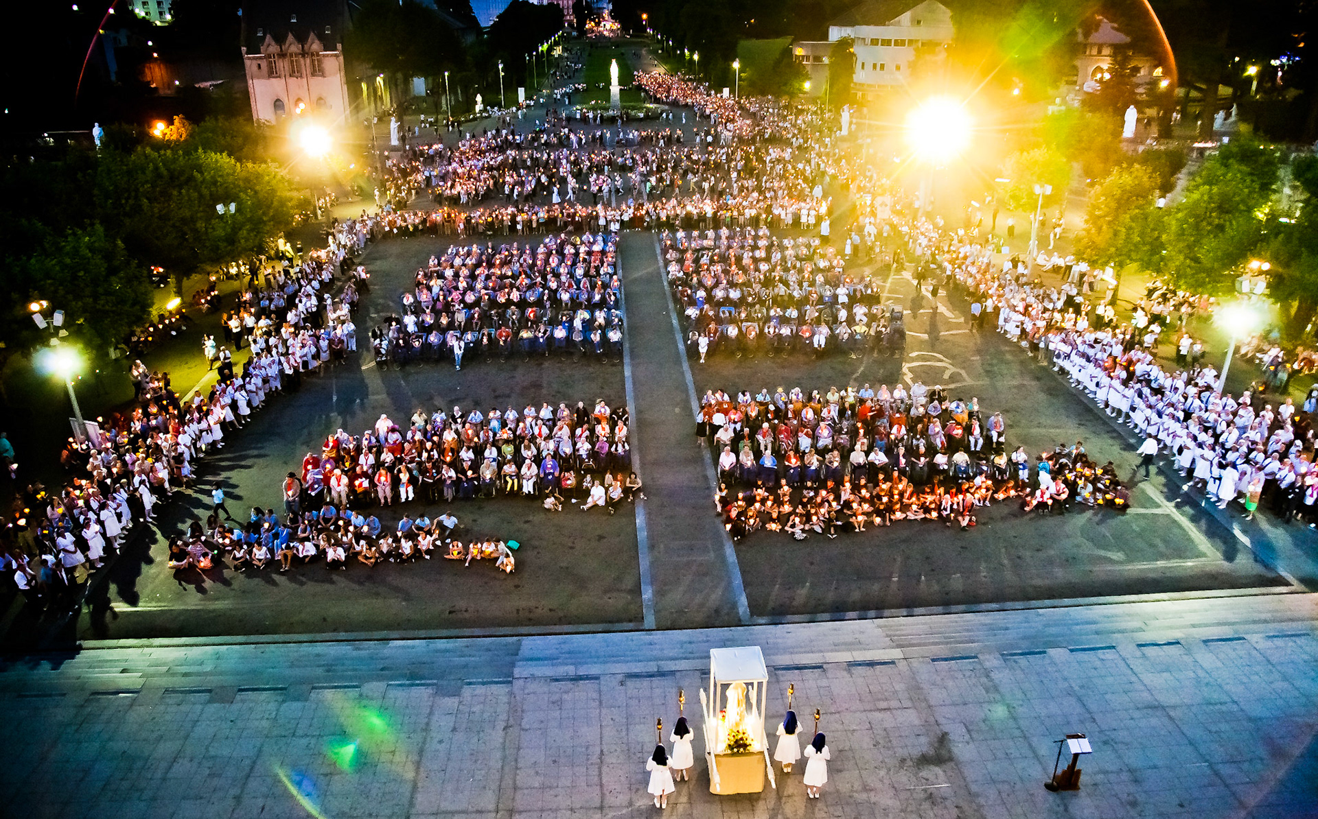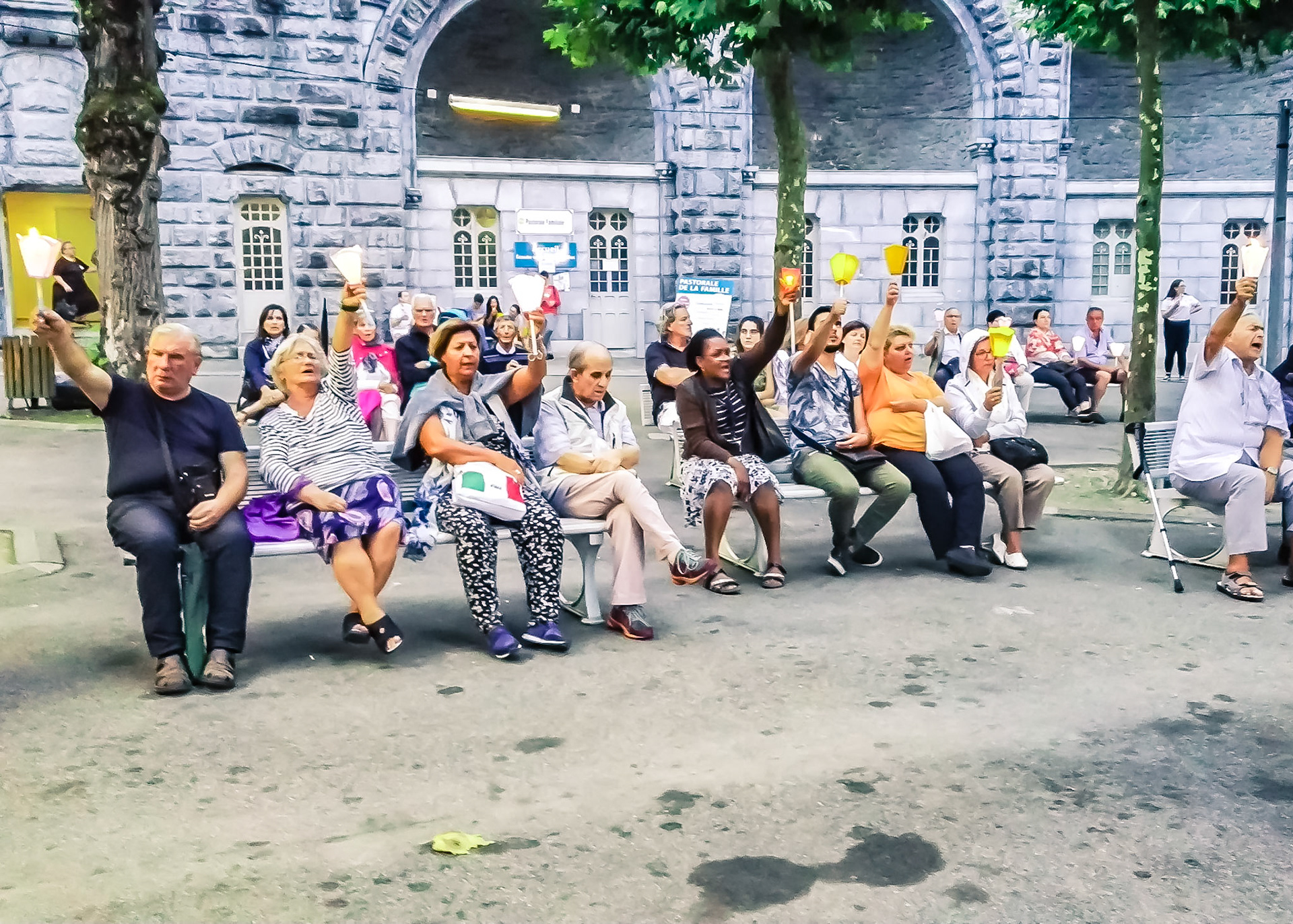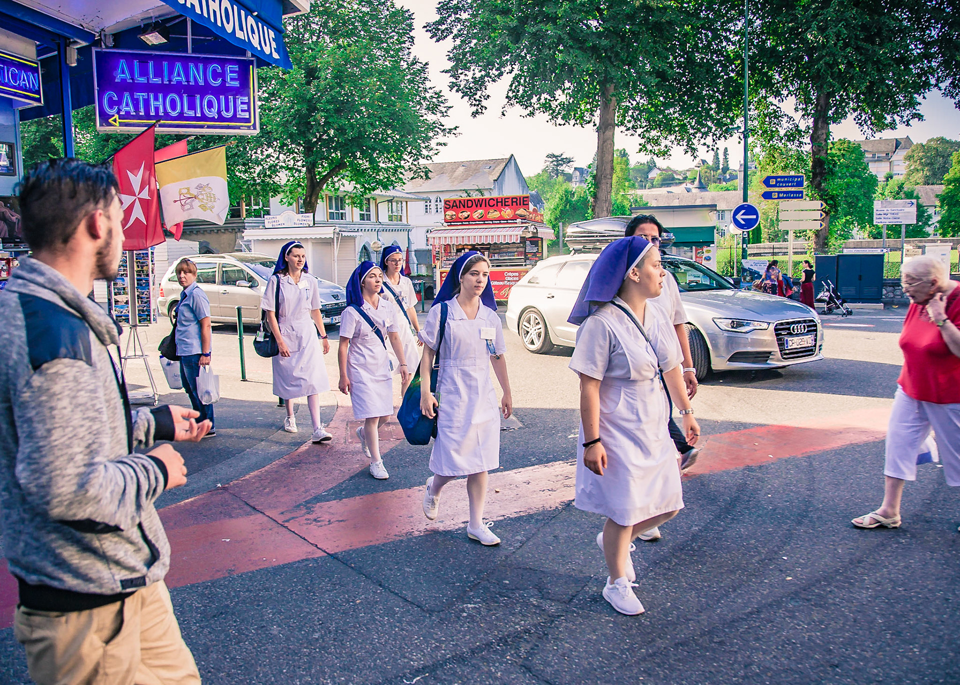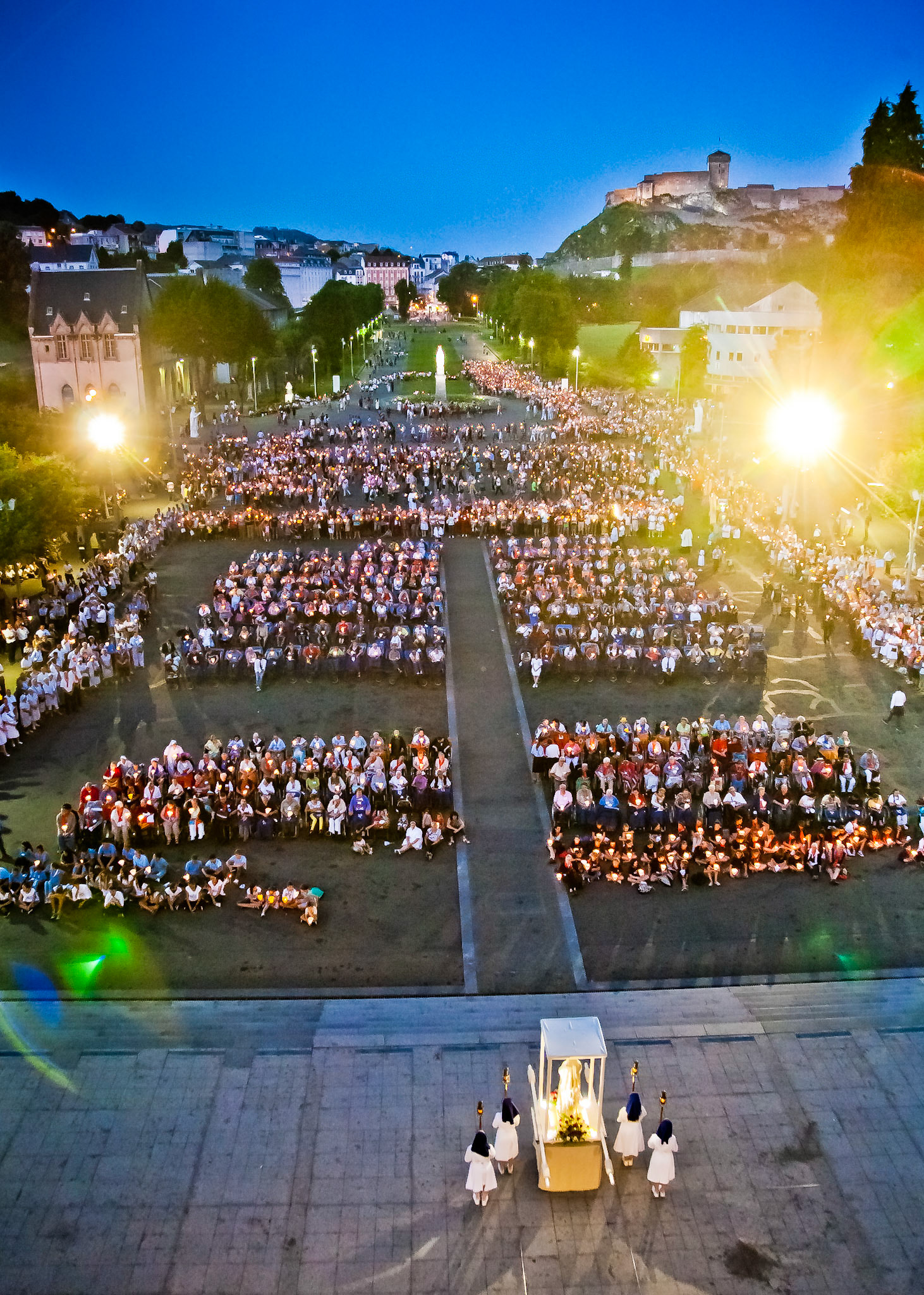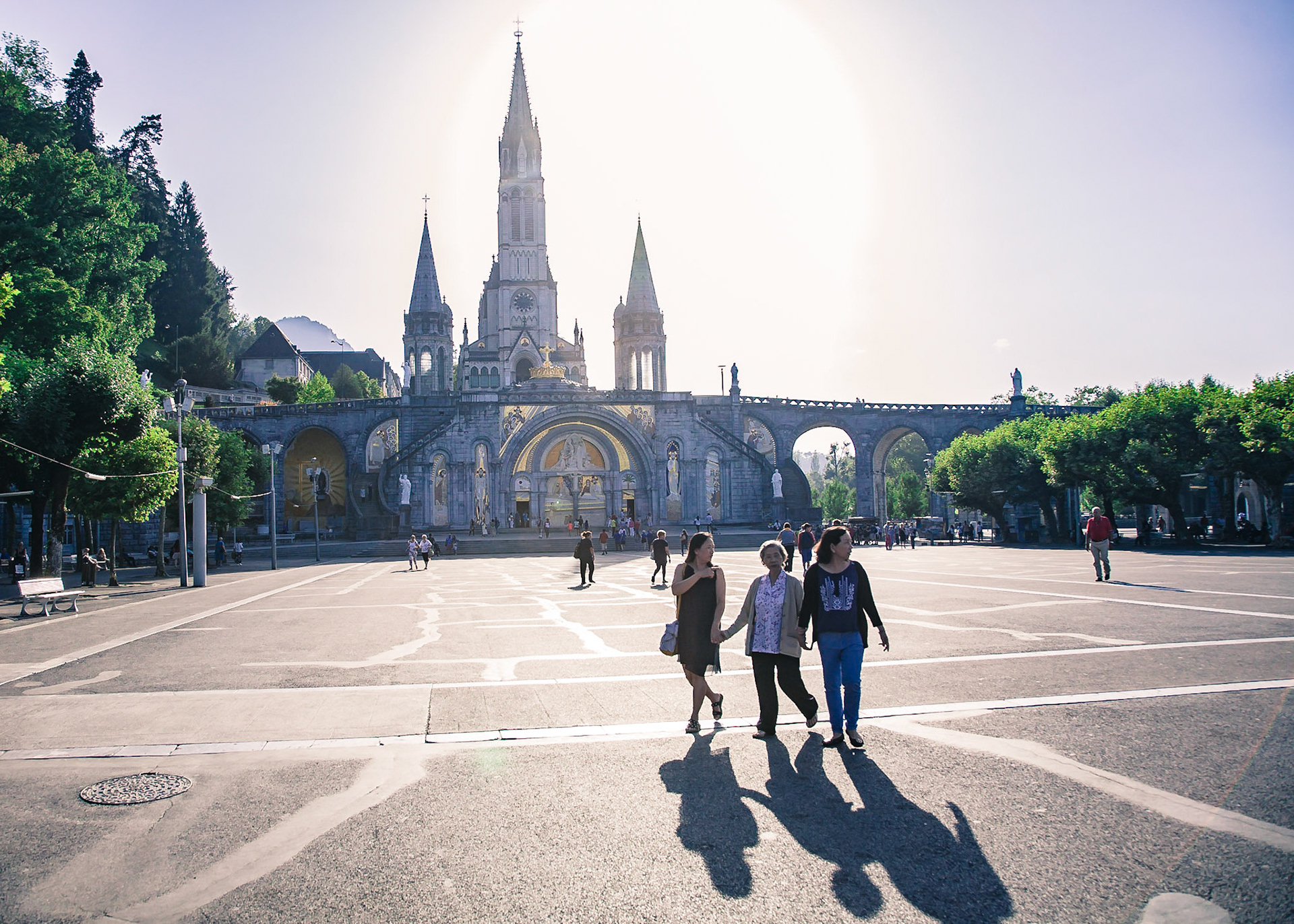 A candid view of pilgrims at Lourdes, their devotion to the Catholic faith. The sick come from all over the world in hope of a cure. The atmosphere around the town and in the Grotto of Massabielle (Grotto of the Apparitions) is peaceful and where in 1858, the Virgin Mary is said to have appeared to a local woman. In the grotto, pilgrims can drink or bathe in water flowing from a spring.