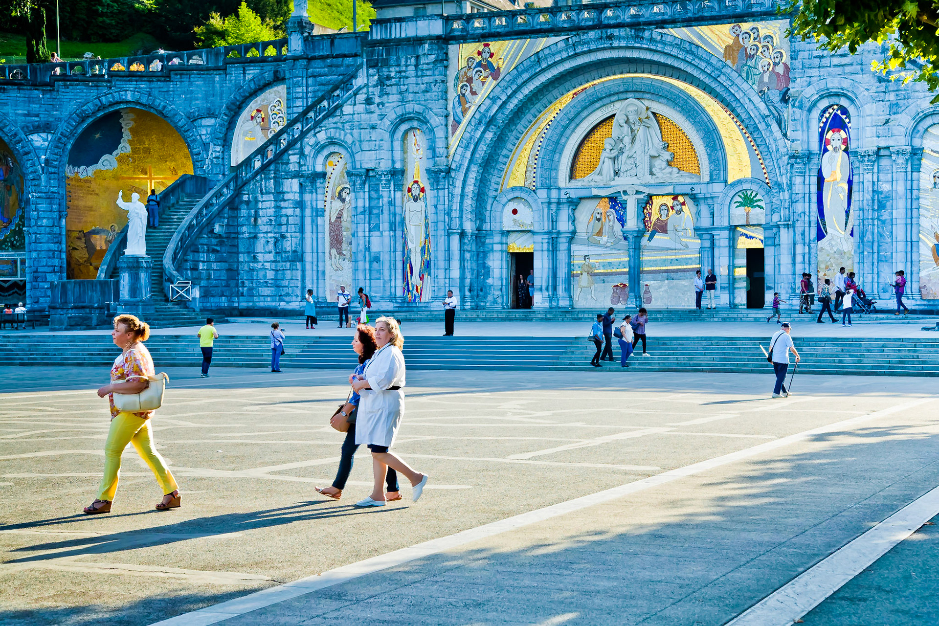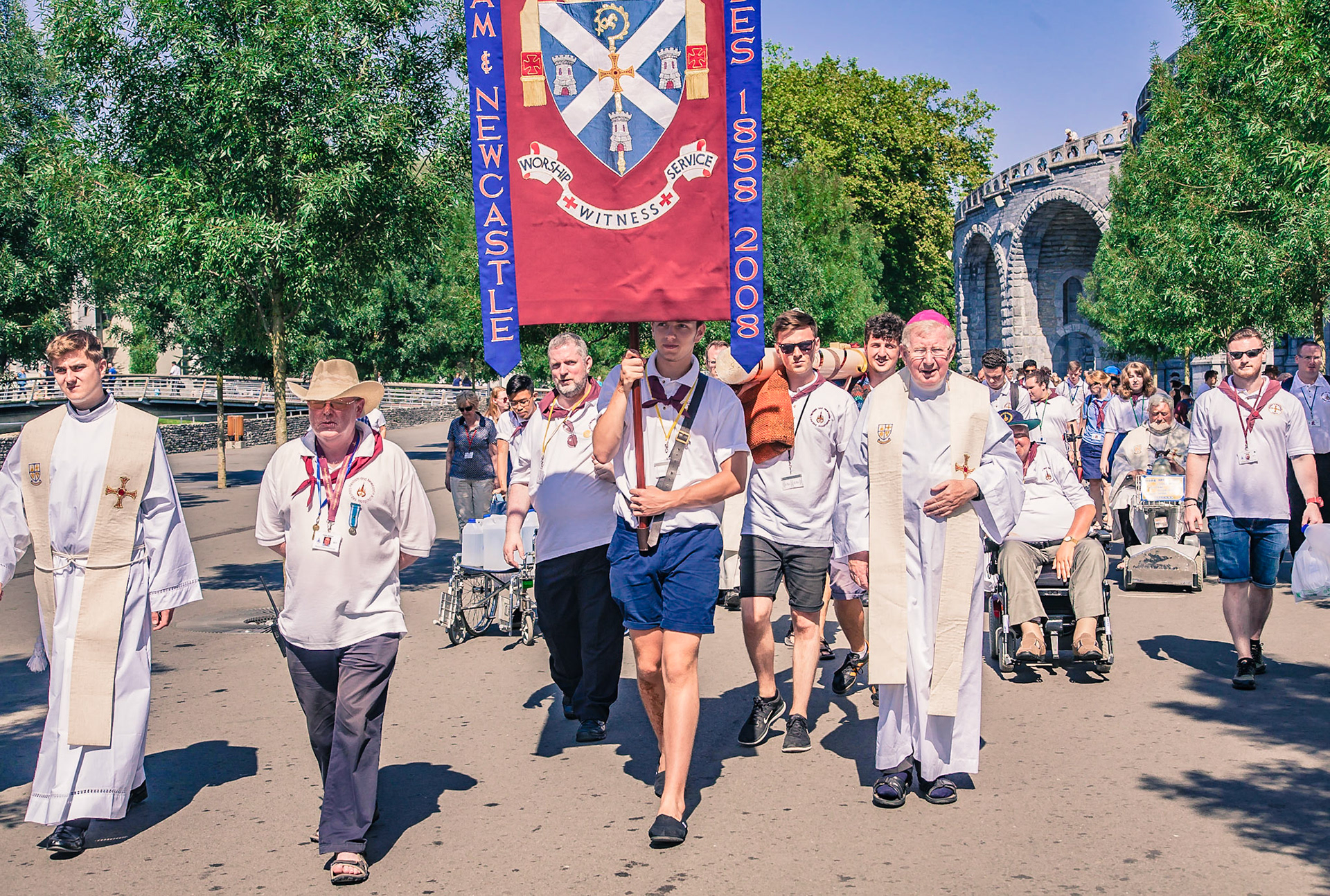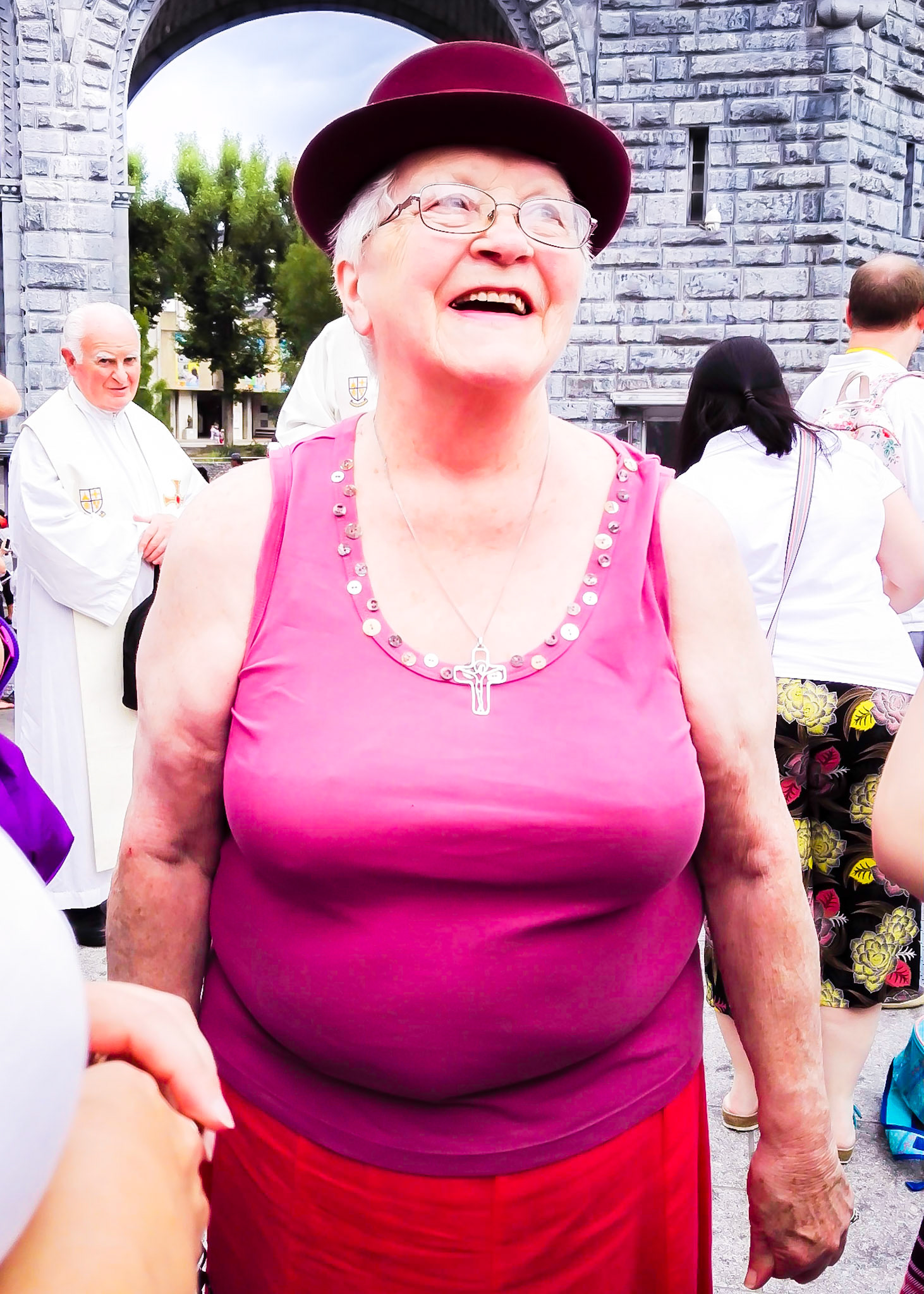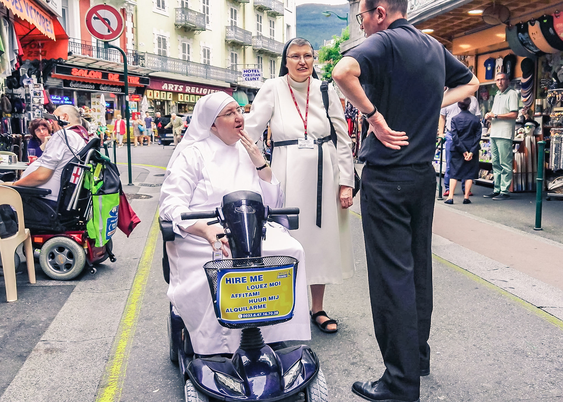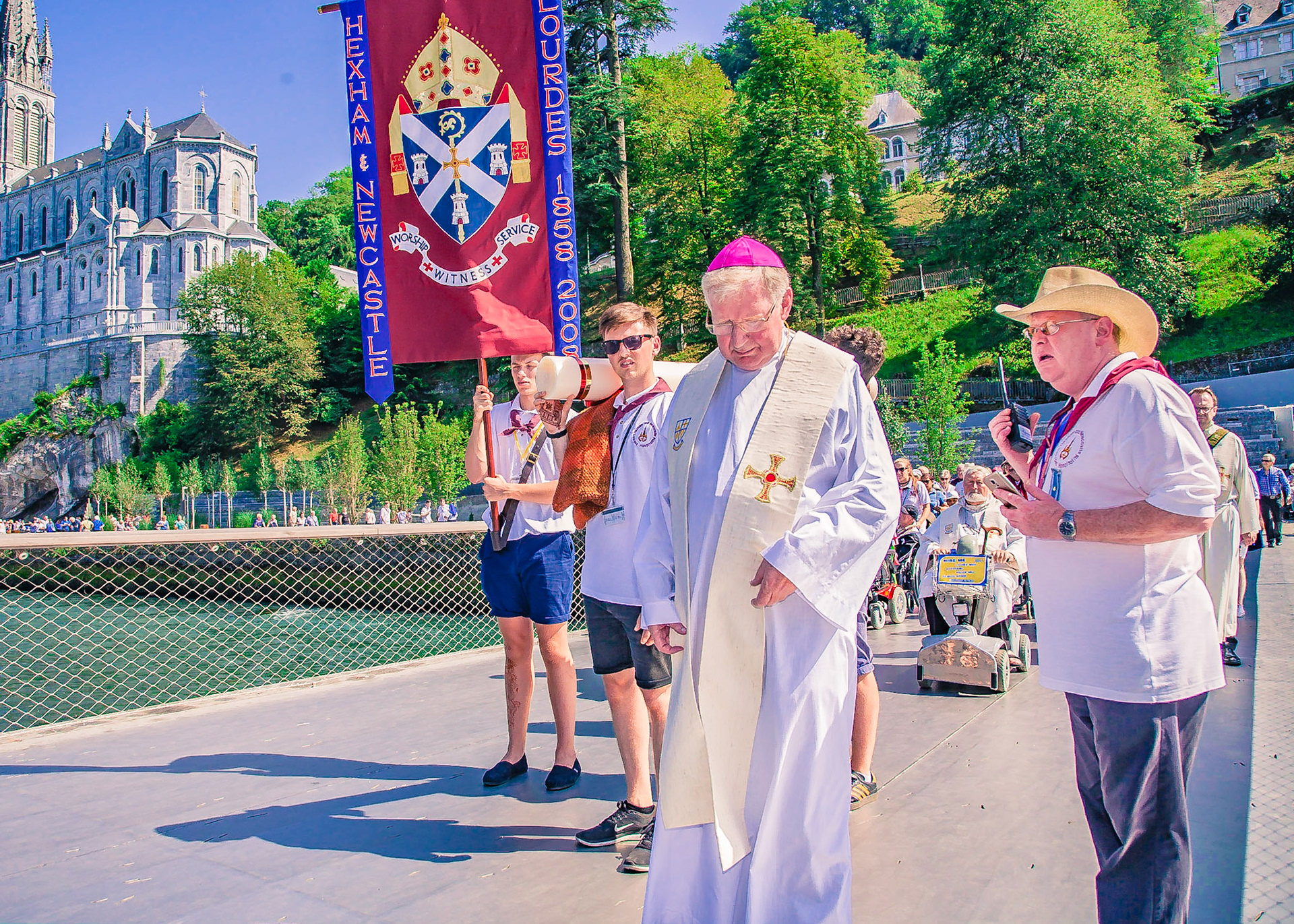 A candid view of pilgrims at Lourdes, their devotion to the Catholic faith. The sick come from all over the world in hope of a cure. The atmosphere around the town and in the Grotto of Massabielle (Grotto of the Apparitions) is peaceful and where in 1858, the Virgin Mary is said to have appeared to a local woman. In the grotto, pilgrims can drink or bathe in water flowing from a spring.