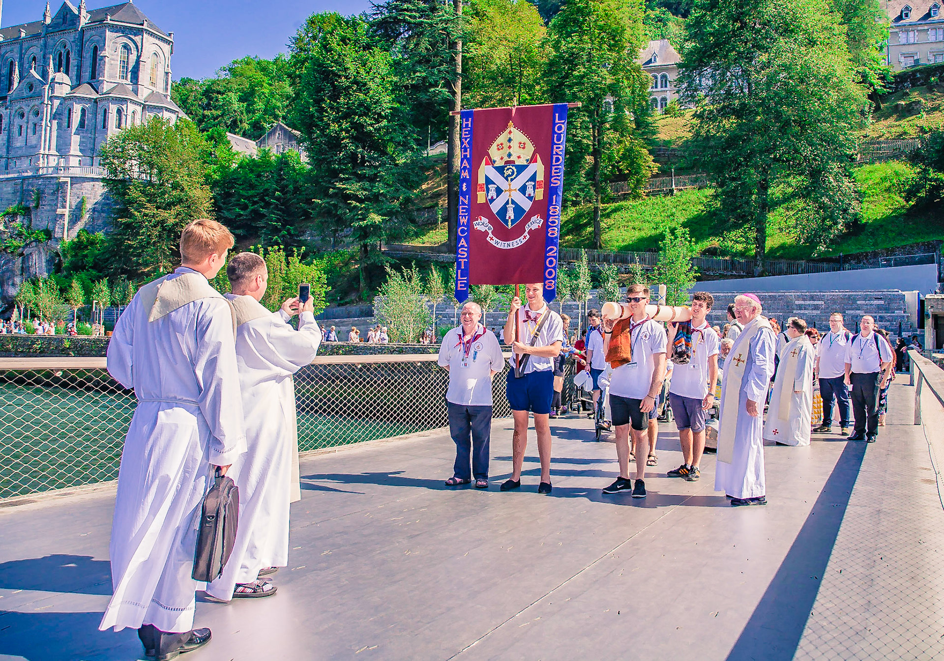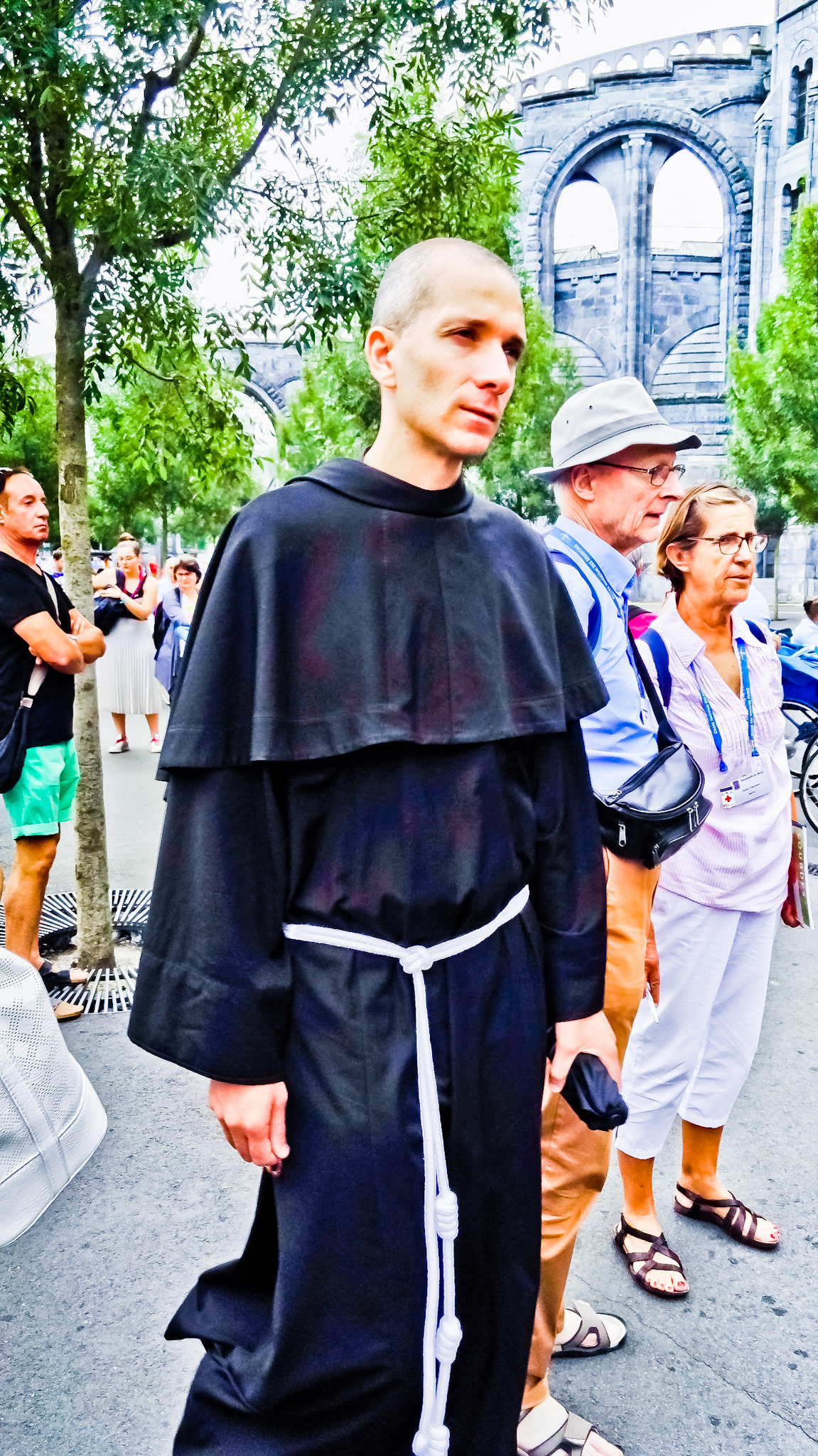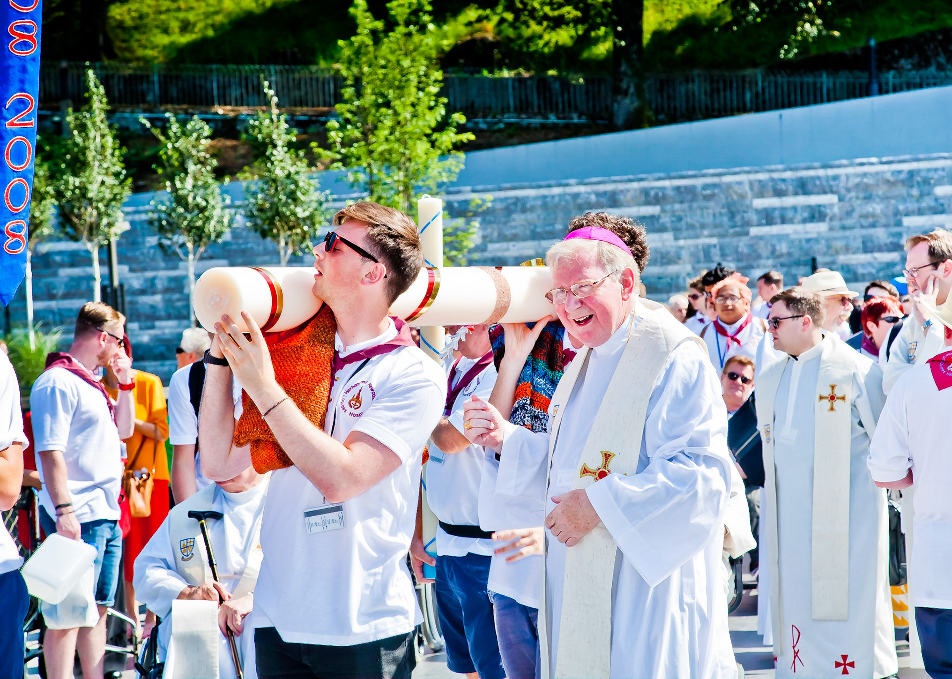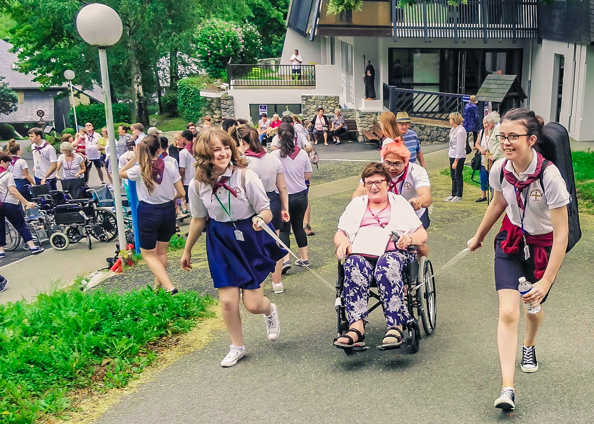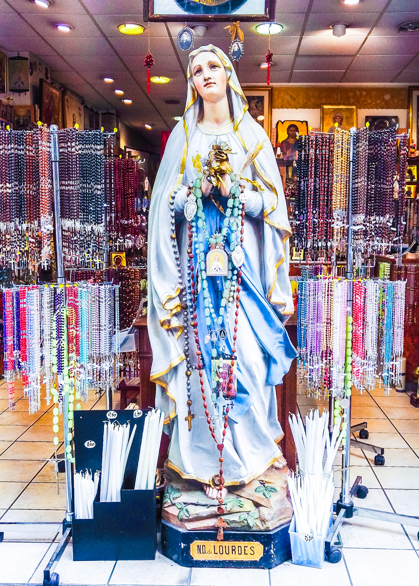 A candid view of pilgrims at Lourdes, their devotion to the Catholic faith. The sick come from all over the world in hope of a cure. The atmosphere around the town and in the Grotto of Massabielle (Grotto of the Apparitions) is peaceful and where in 1858, the Virgin Mary is said to have appeared to a local woman. In the grotto, pilgrims can drink or bathe in water flowing from a spring.