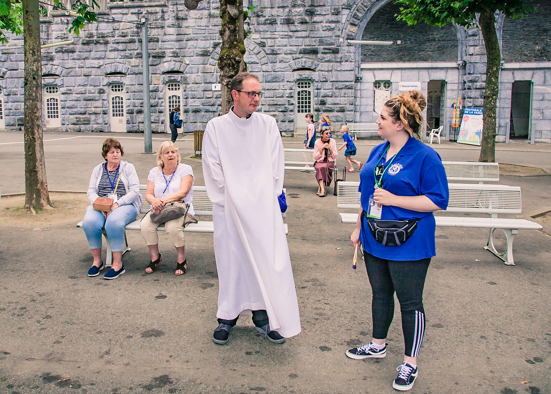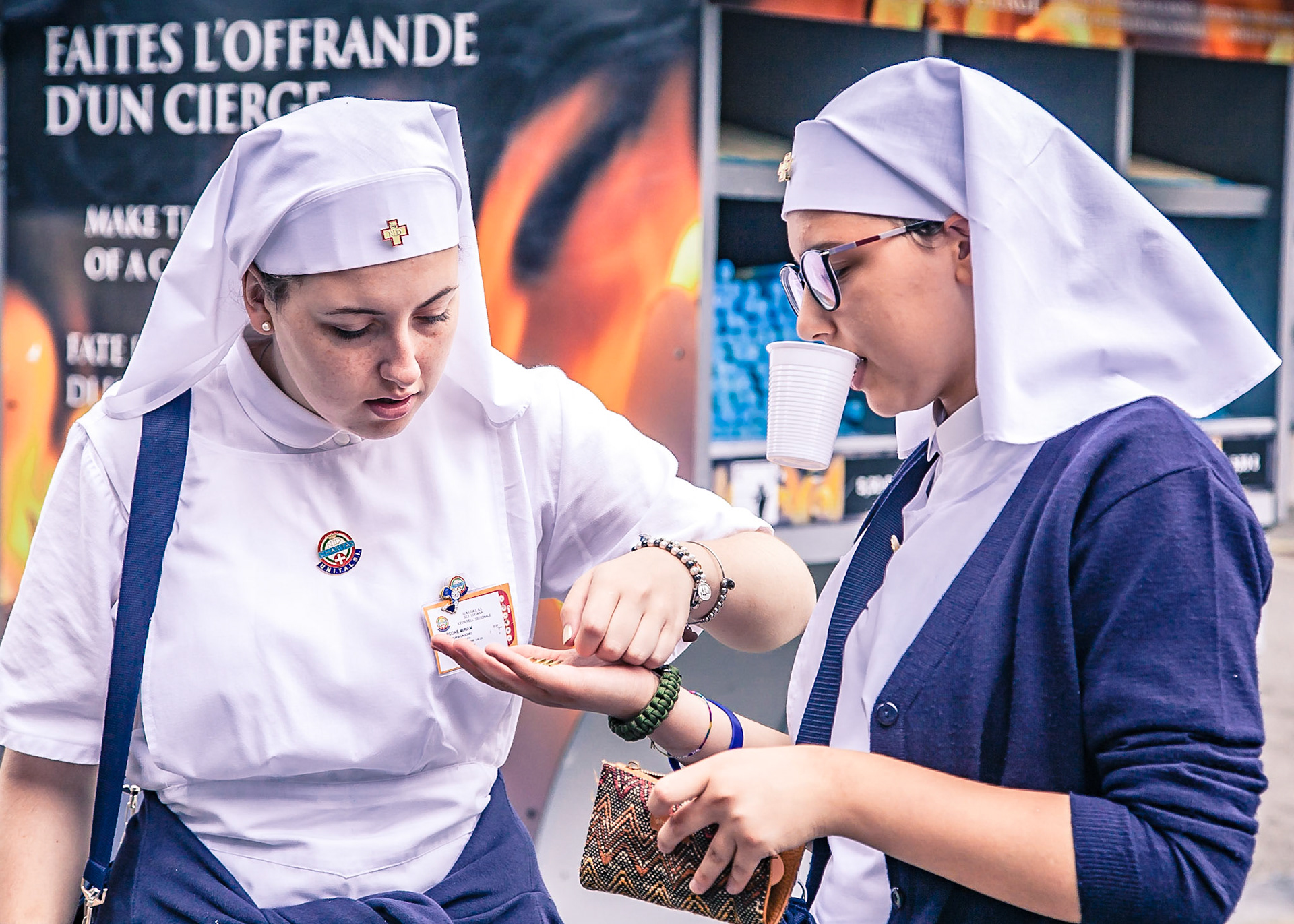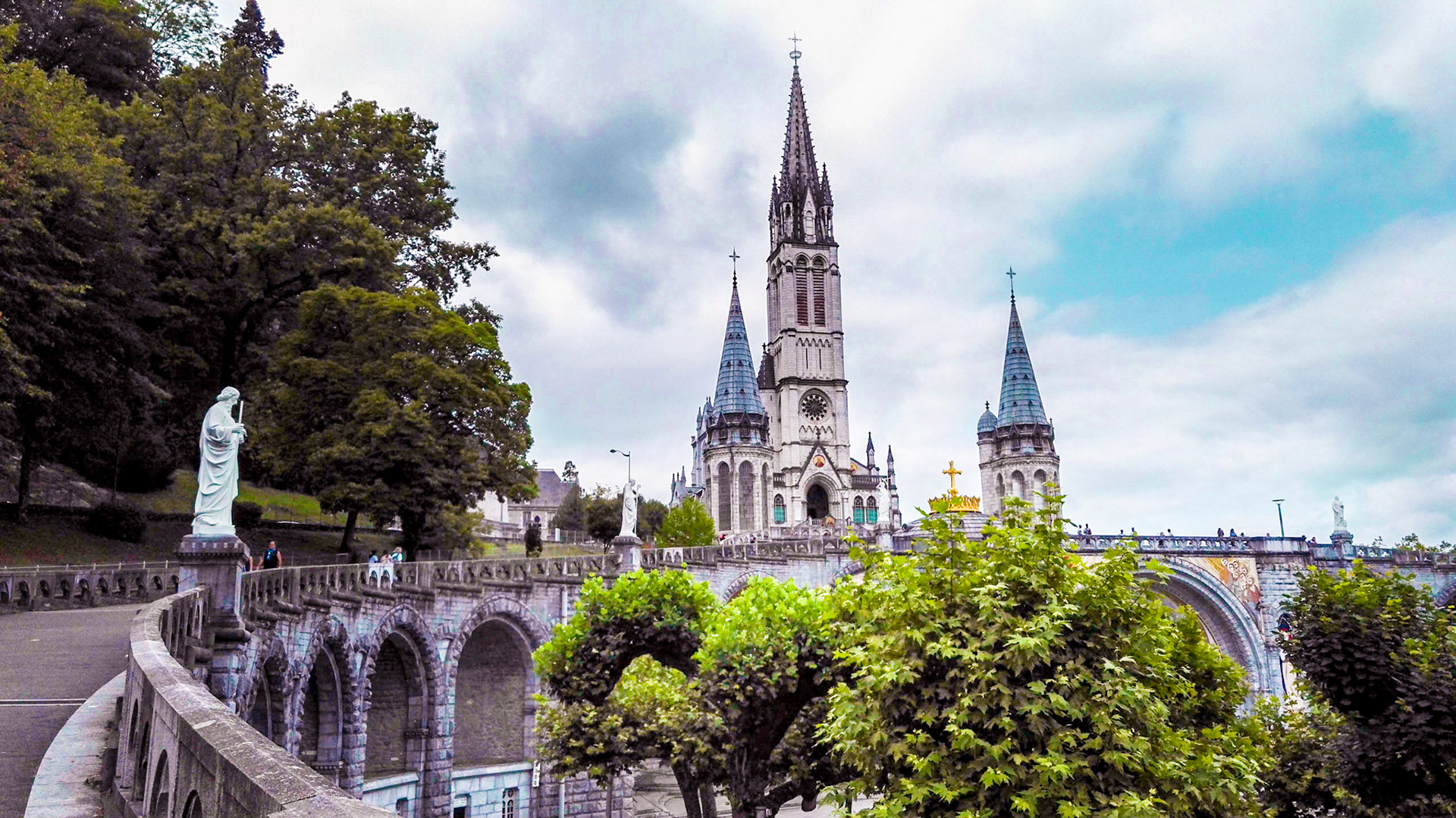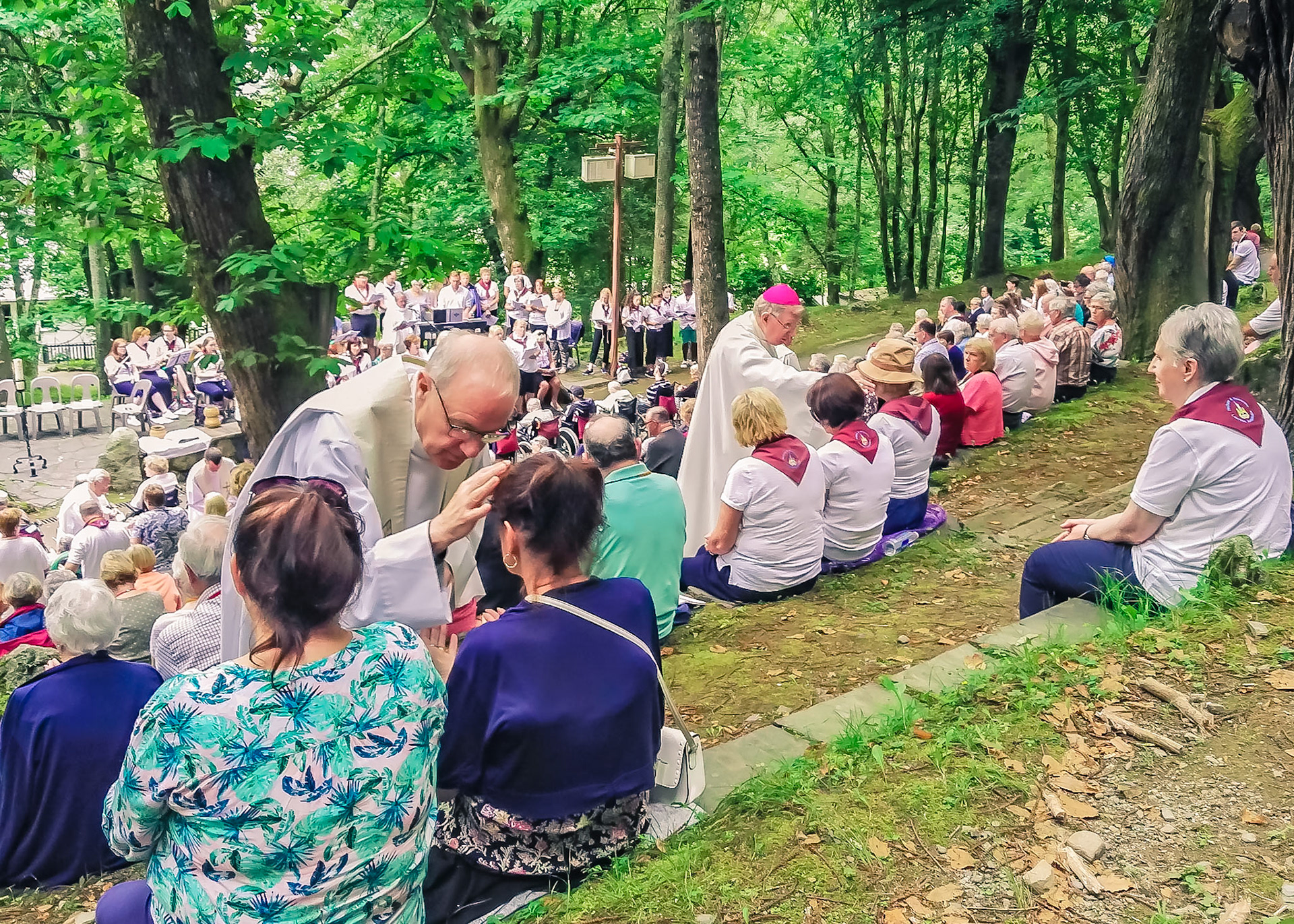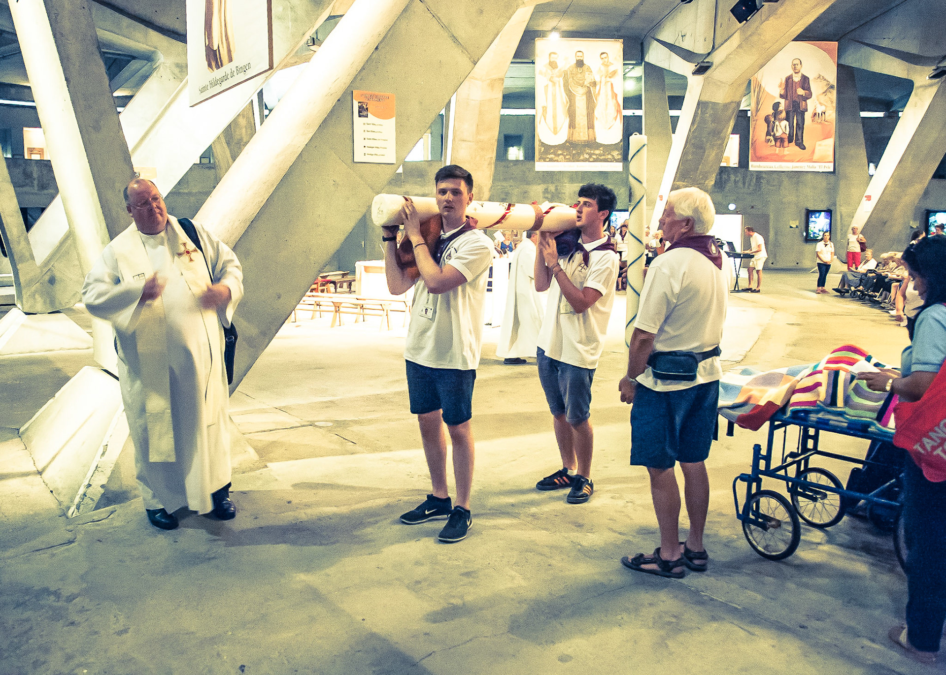 A candid view of pilgrims at Lourdes, their devotion to the Catholic faith. The sick come from all over the world in hope of a cure. The atmosphere around the town and in the Grotto of Massabielle (Grotto of the Apparitions) is peaceful and where in 1858, the Virgin Mary is said to have appeared to a local woman. In the grotto, pilgrims can drink or bathe in water flowing from a spring.